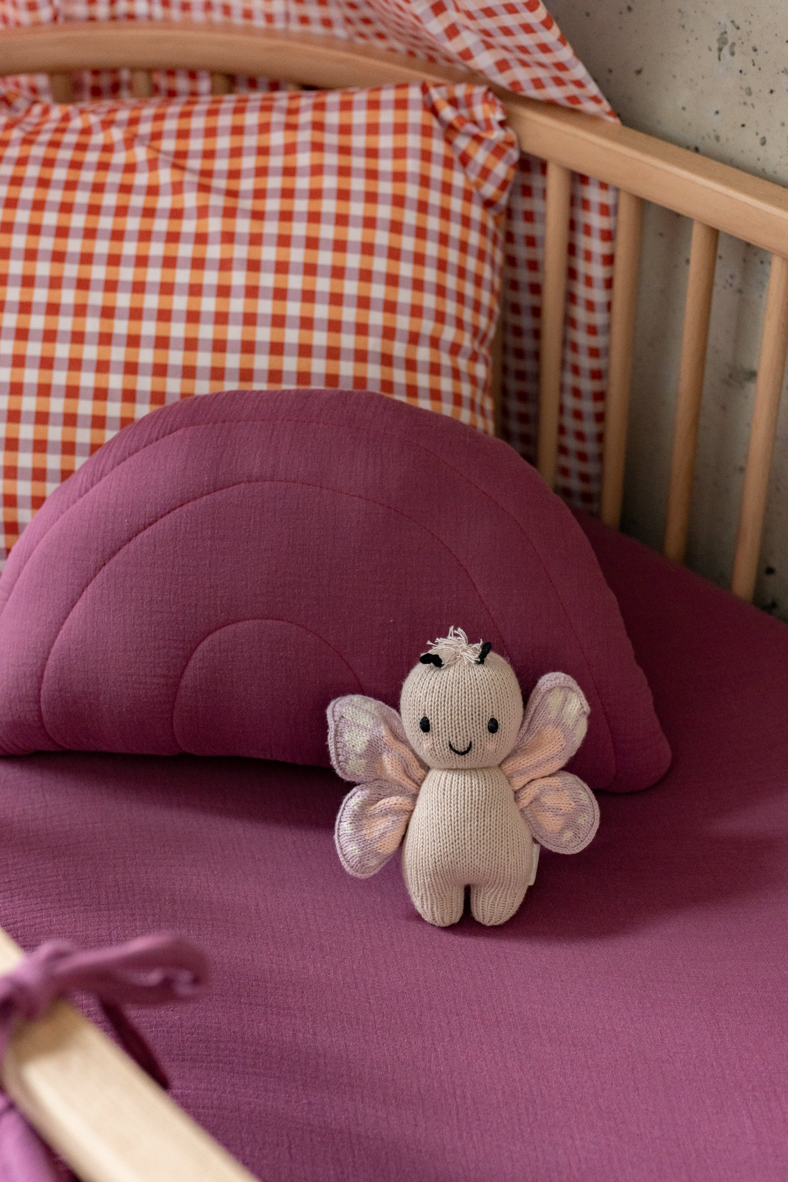 Bring dreamy color and handmade charm to your child’s room with our Plum Dream Rainbow Pillow. Made from soft cotton muslin in a warm plum tone and shaped like a rainbow, this cushion adds a playful and cozy touch to any nursery or kids’ room. Its gentle fabric and curved form make it perfect for cuddles, reading nooks, or simply as a beautiful accent on a bed or armchair. Whether your style is boho, vintage, or modern, this rainbow pillow fits effortlessly into the decor — and makes a lovely gift for a baby shower or birthday. Product details: • Shape: Rainbow • Size: approx. 45 x 35 cm • Fabric: 100% cotton muslin (OEKO-TEX® certified) • Color: Warm plum / dusty purple • Filling: Hypoallergenic polyester wadding • Care: Machine washable at 30°C (gentle cycle) • Handmade in the Netherlands by Matuu • Preparation time: 2–3 business days Perfect as: • Rainbow pillow for nursery or kids’ room • Boho or dreamy baby room decor • Decorative pillow for crib or toddler bed • Handmade baby gift or soft toy