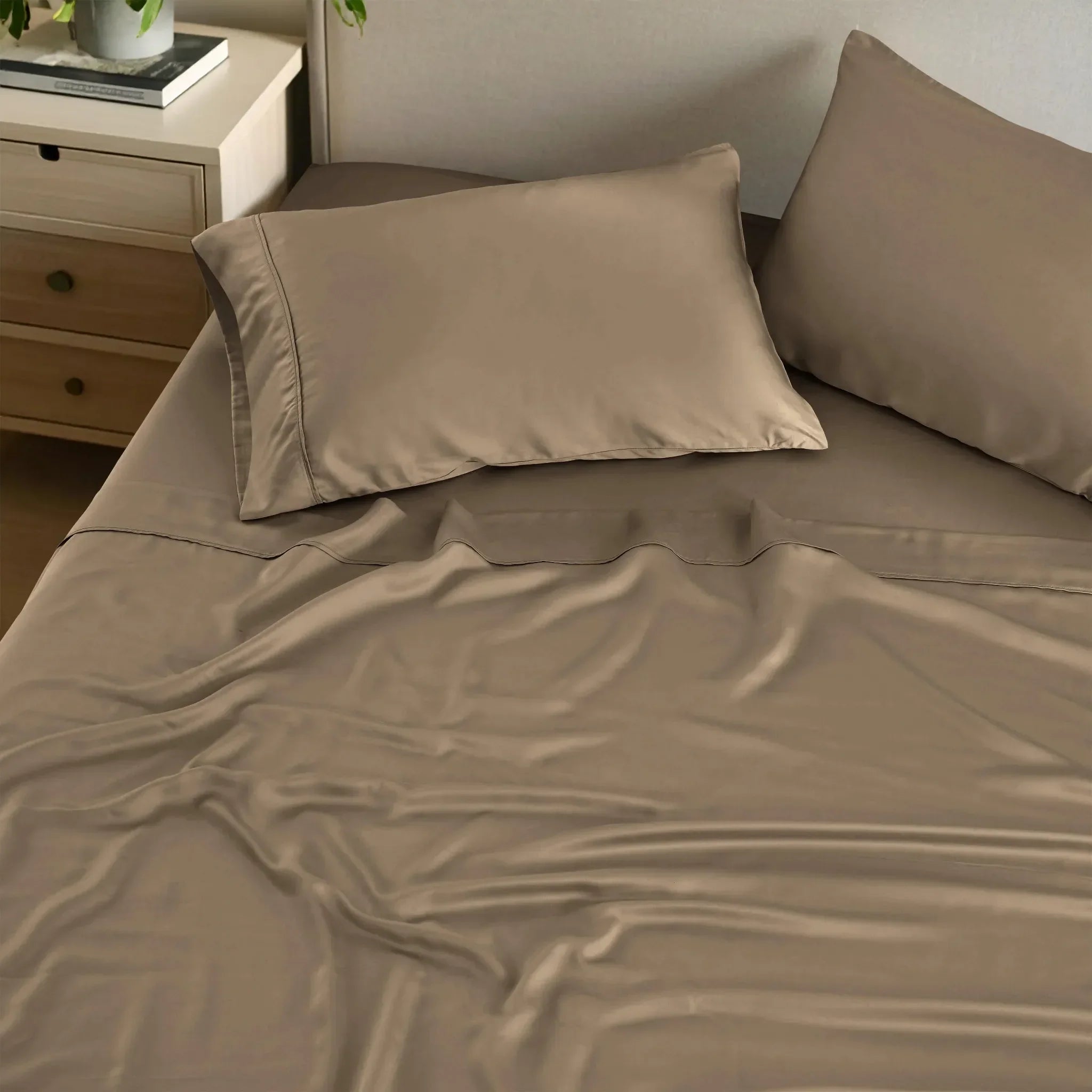 This bed sheet set offers a blend of style and comfort. Crafted from rayon from bamboo, it has a smooth and silky texture. The set comes in a variety of solid colors and is designed for different bed sizes, making it a versatile choice for any bedroom.