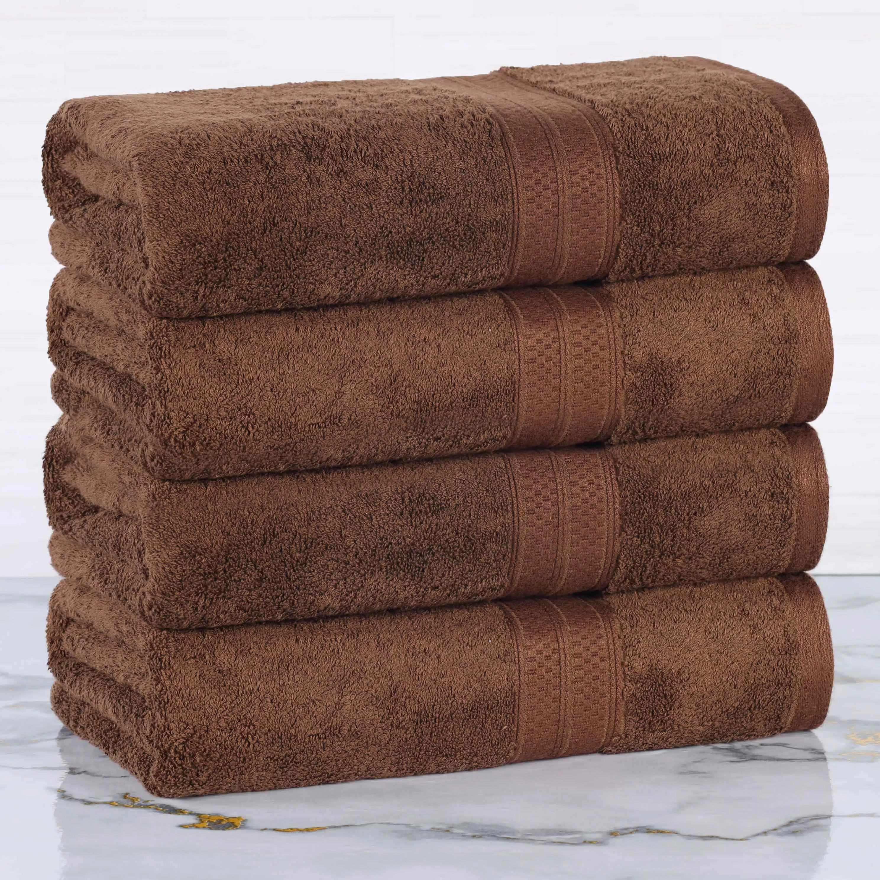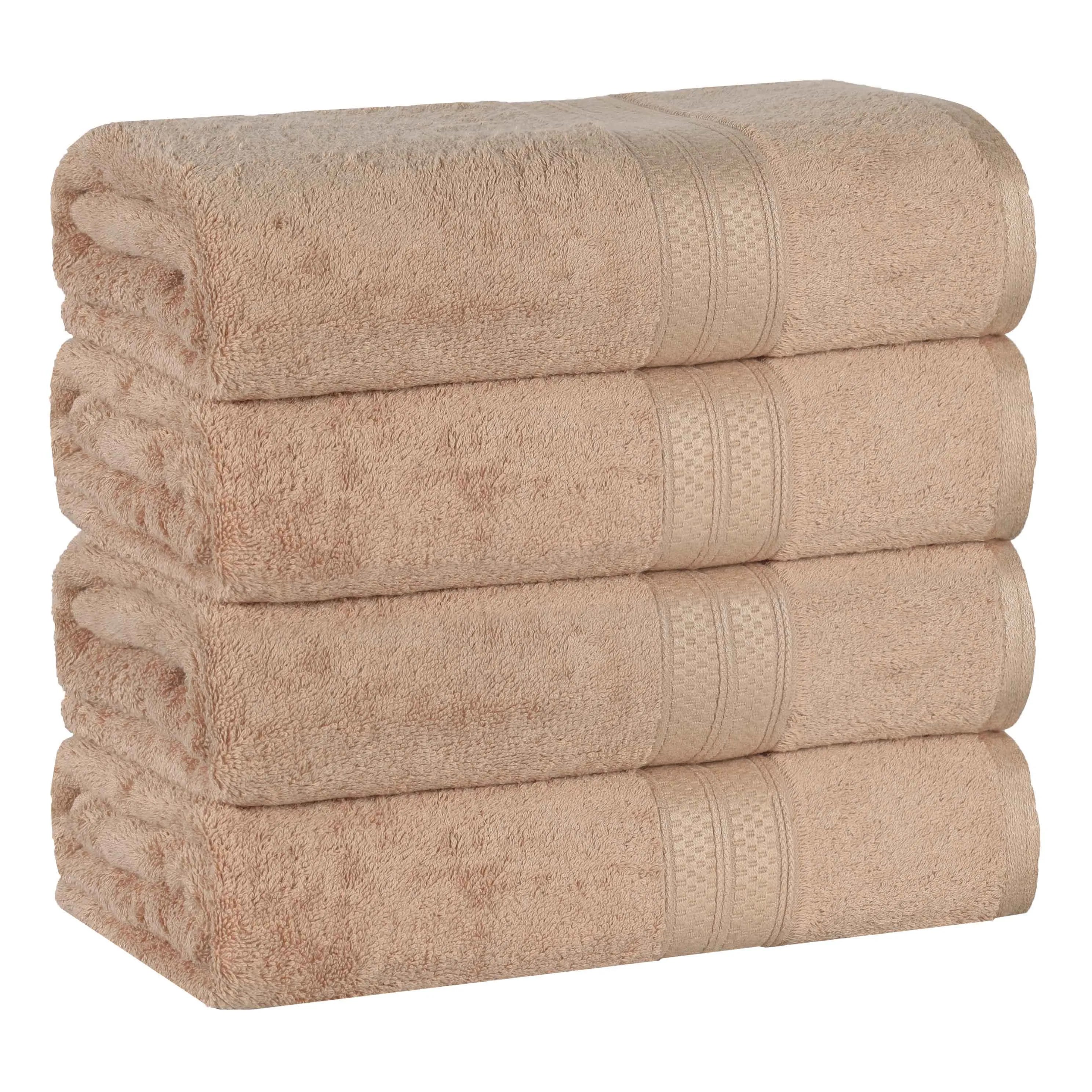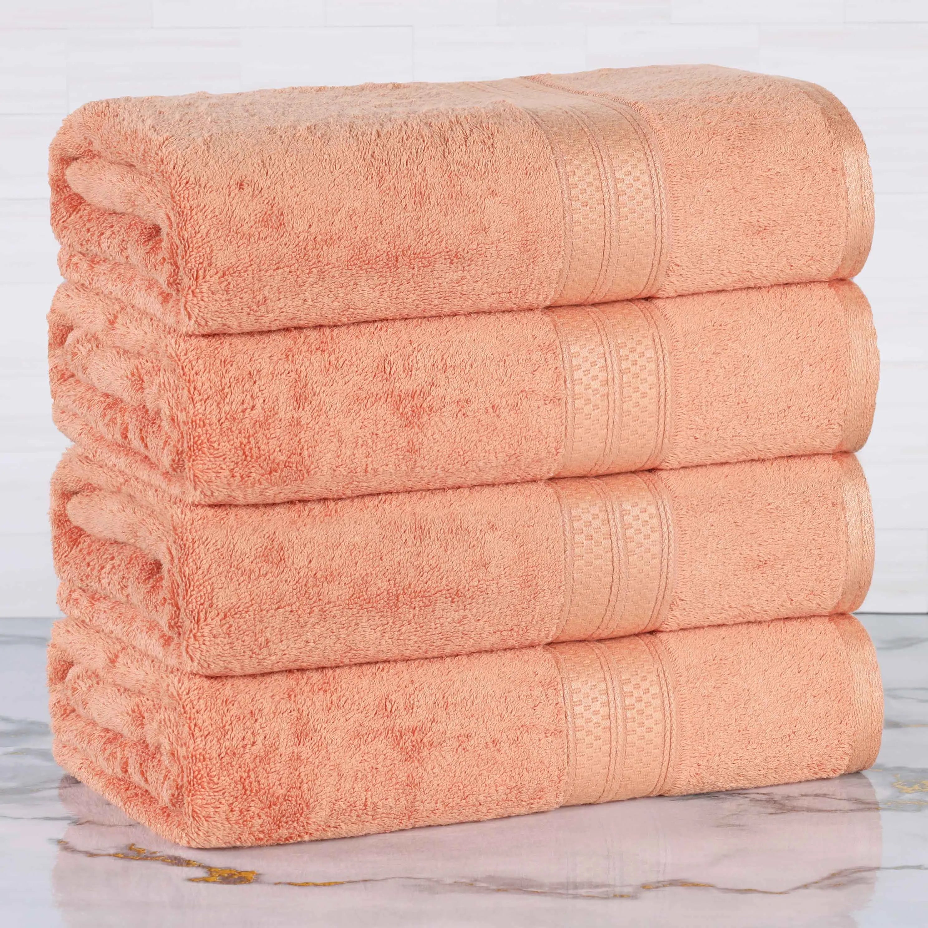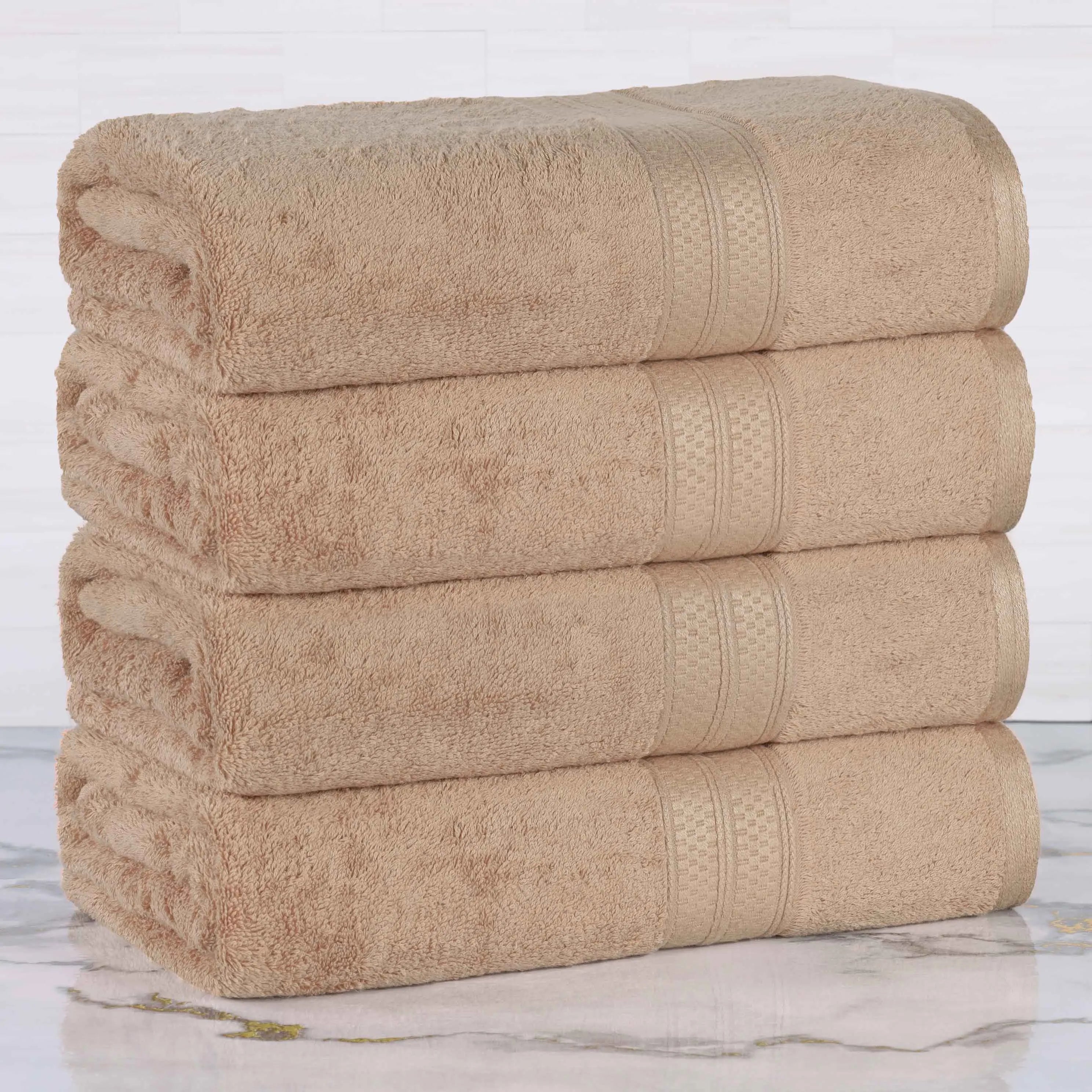 This is a set of bath towels crafted from a soft and absorbent fabric, likely a cotton blend. The towels come in a variety of solid colors and feature a decorative band along the edge, adding a touch of style. With their large size, they are perfect for drying off after a bath or shower.