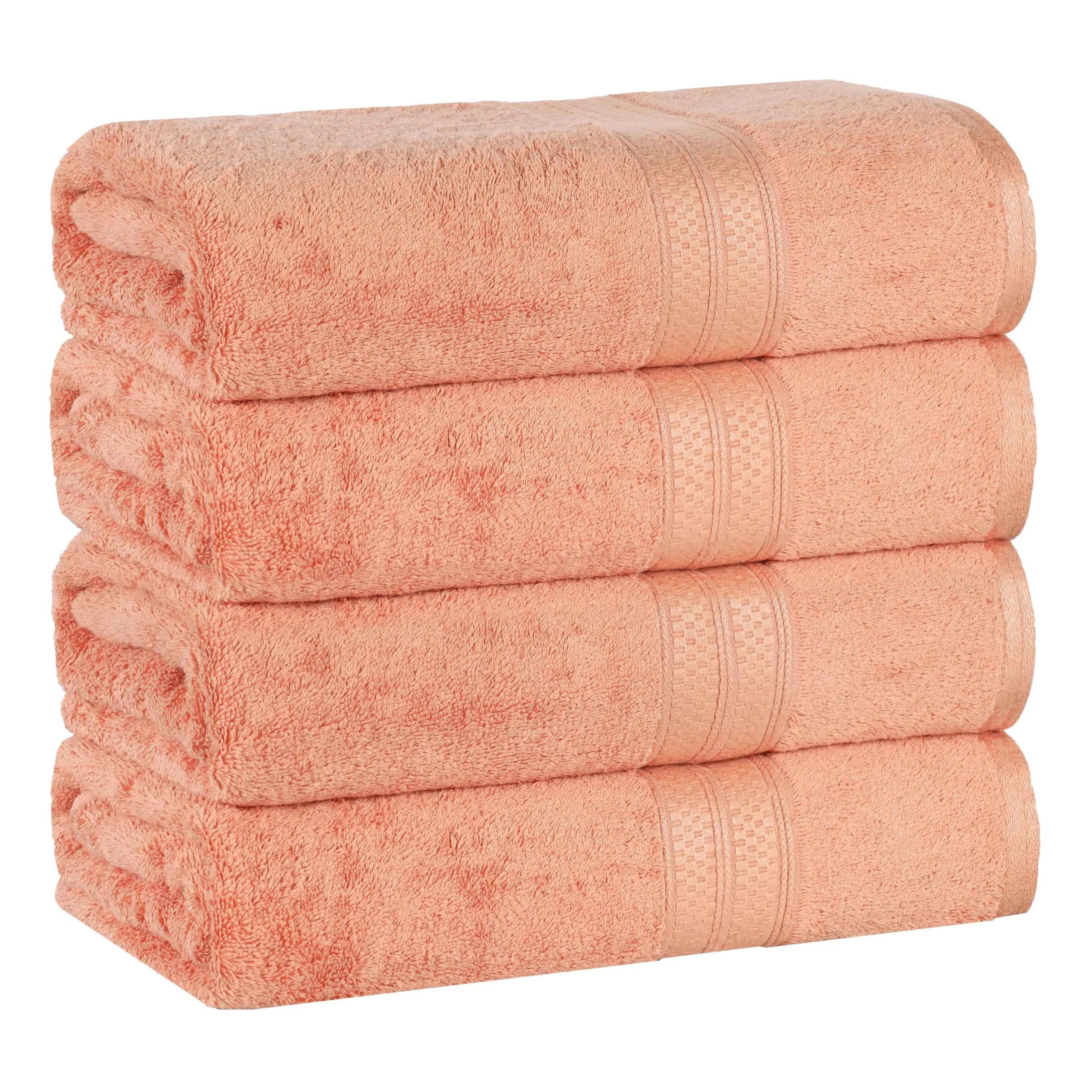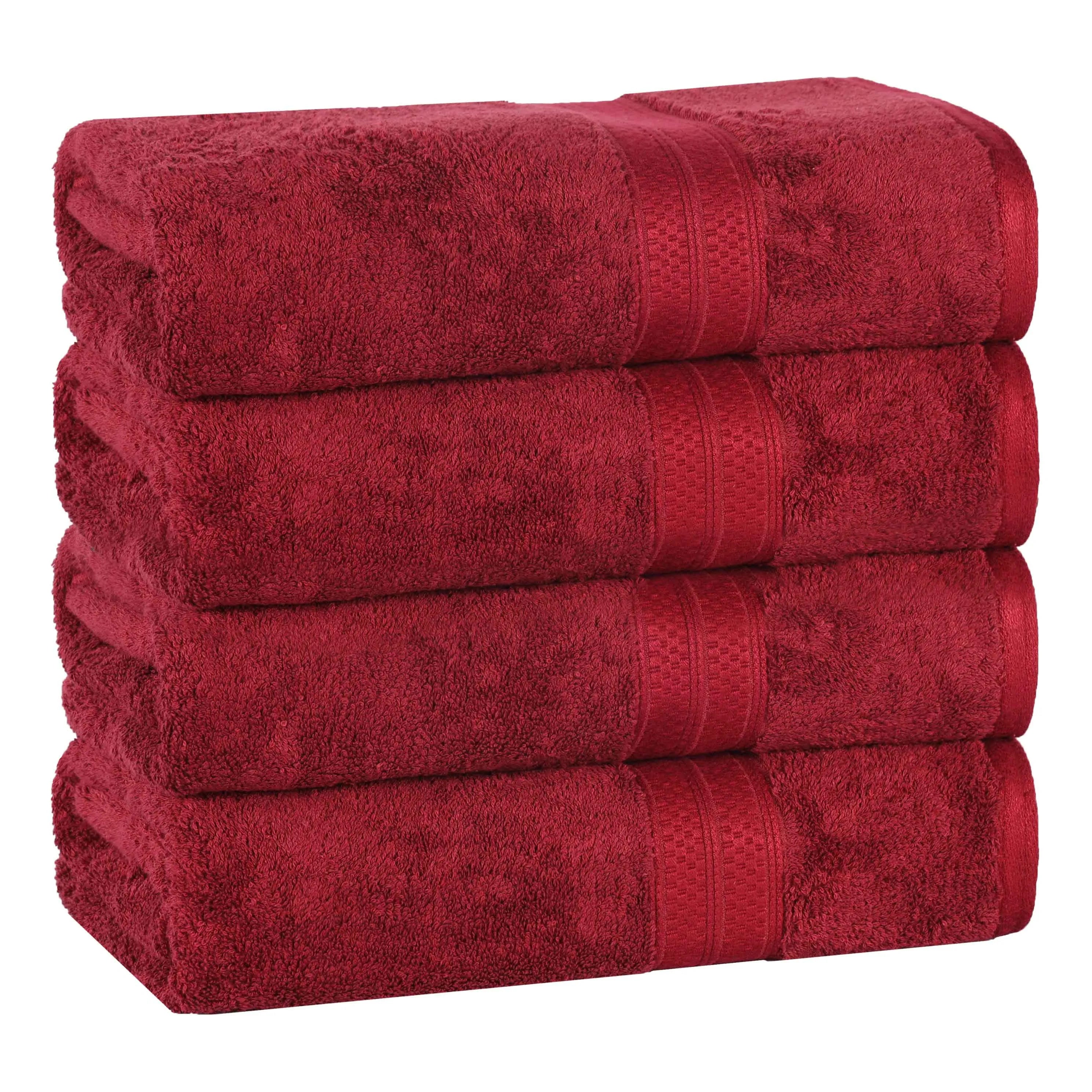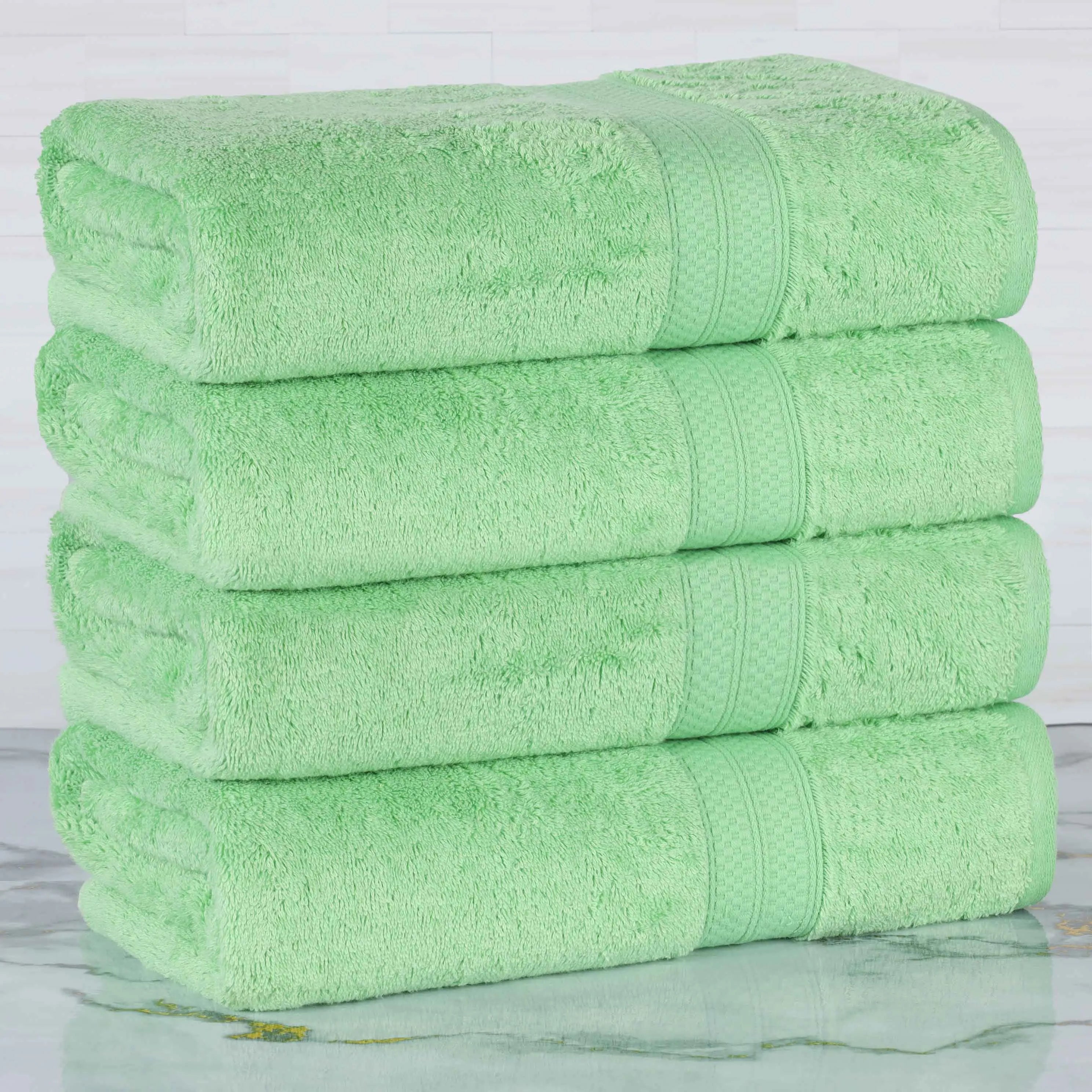 This is a set of bath towels crafted from a soft and absorbent fabric, likely a cotton blend. The towels come in a variety of solid colors and feature a decorative band along the edge, adding a touch of style. With their large size, they are perfect for drying off after a bath or shower.