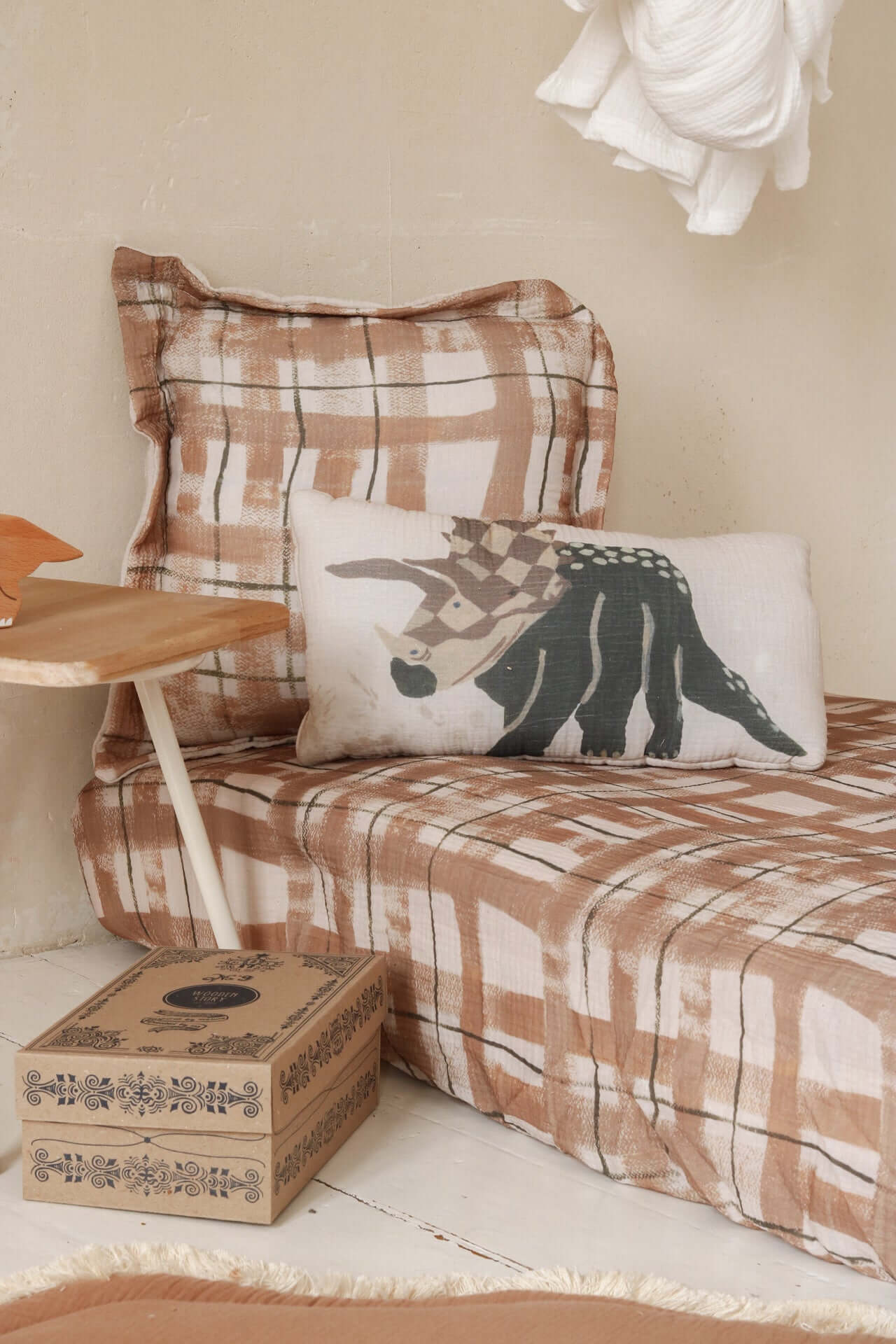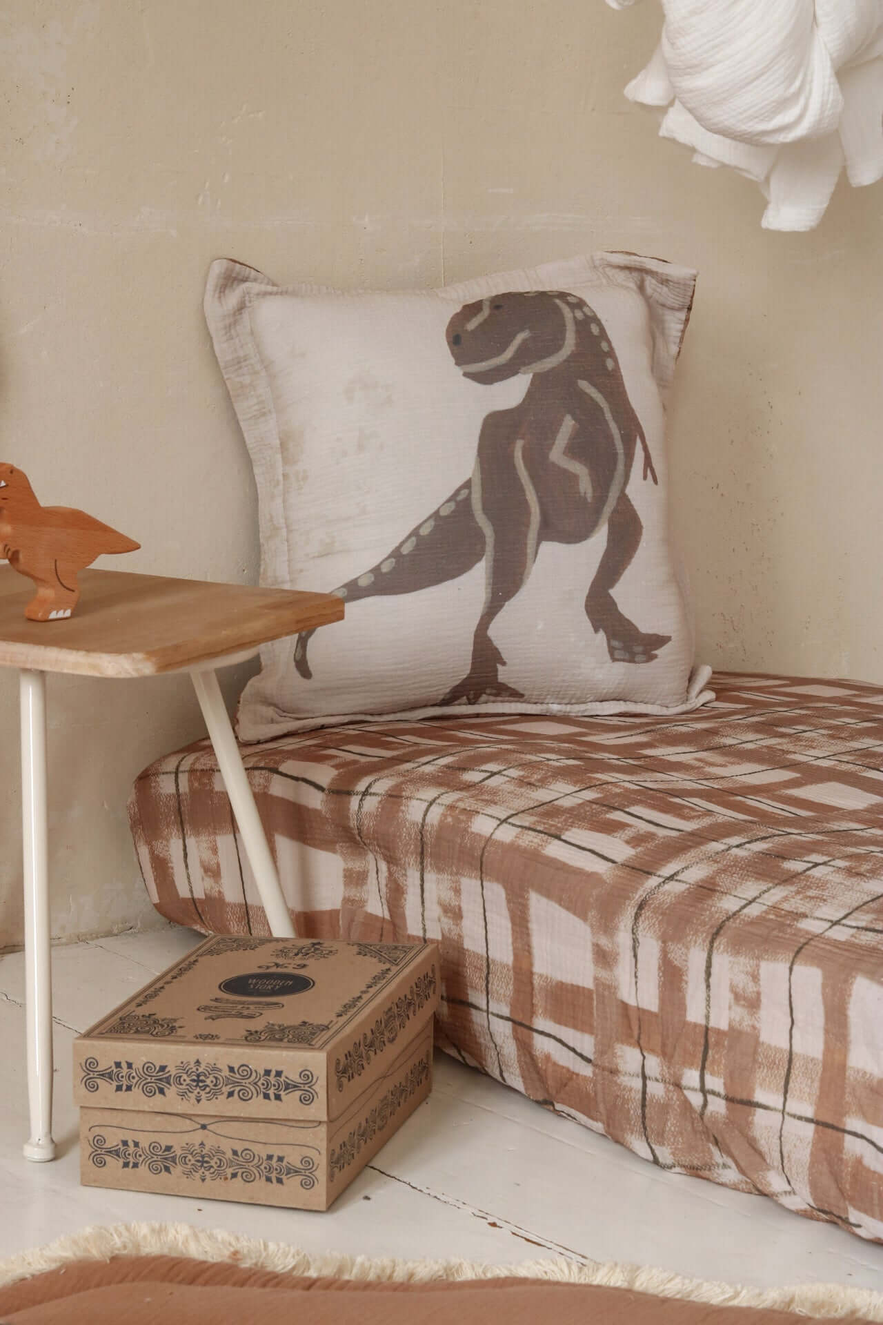 T-rex muslin pillow – universal pillow with dinosaurus print Size – 40×40 cm You can combine different pillows to discover better results. Washing instruction:Machine wash in 40 degrees, dry flat Processing time: 1-3 work days