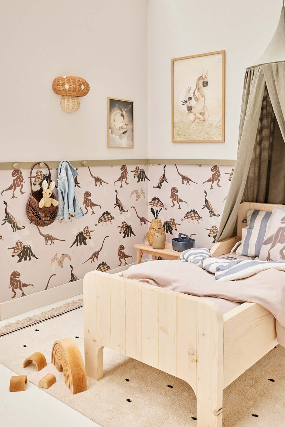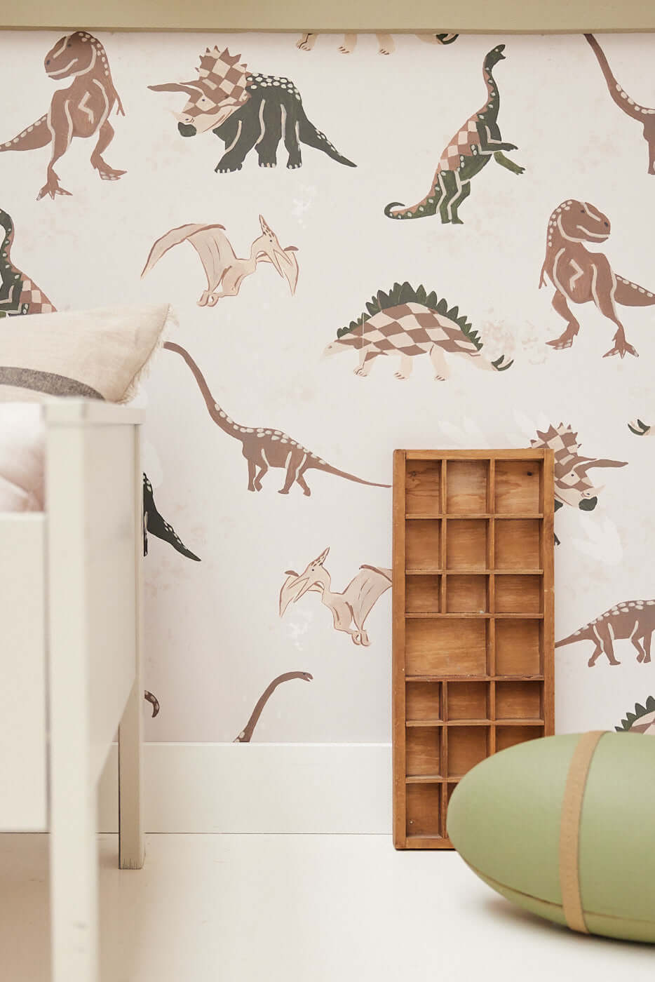 Bring playful adventure to your child’s room The Retro Dinos wallpaper features hand-drawn dinosaurs in warm, muted tones, perfect for little explorers who love prehistoric fun. Its retro color palette and soft shapes blend beautifully into modern or Scandinavian-inspired interiors, making it ideal for nurseries, playrooms, or boys’ bedrooms. Why You’ll love it • Soft retro colors that complement kids’ spaces • Playful dinosaur illustrations to spark imagination • Handmade design, exclusive to Matuu • Printed to order – crafted especially for you Product Details • Design: hand-drawn retro-style dinosaurs • Colors: muted mustard, terracotta, sage green, beige • Material: premium non-woven wallpaper (vlies) • Finish: matte, soft-touch surface • Pattern repeat: every 100 cm • Production: printed to order – custom made just for you Sizes & Installation • Available sizes: – 2 strips of 50 × 270 cm – 2 strips of 50 × 310 cm • Coverage: 1 set covers 1 meter of wall width Installation: • Paste the wall (not the wallpaper) • Use non-woven wallpaper paste • Surface must be clean, smooth, and dry • Instructions: Download the step-by-step non-woven wallpaper guide How many rolls do I need? Each set contains 2 strips (50 cm wide each, total 1 m width). Example: – Wall width 2.3 m → order 3 sets – Wall width 4 m → order 4 sets Tip: Always add 5–10 cm extra as walls are rarely perfectly straight. Production & Delivery • Production time: 1–3 business days • Delivery time: 2–7 business days (EU) Check – Double Check Please carefully inspect your wallpaper before installation. Verify colours, pattern alignment, and length immediately upon delivery. We allow a cutting tolerance of up to 1 mm per strip. If the deviation is larger, we will gladly reprint your order. *Once the wallpaper has been cut and installed, it is no longer possible to objectively determine whether any irregularity originates from production or from handling during installation. For this reason, claims raised after installation are very difficult to assess. Important Notes This wallpaper is not kept in stock – it’s printed to order. Not sure about the colour or pattern scale?We recommend ordering a sample first.