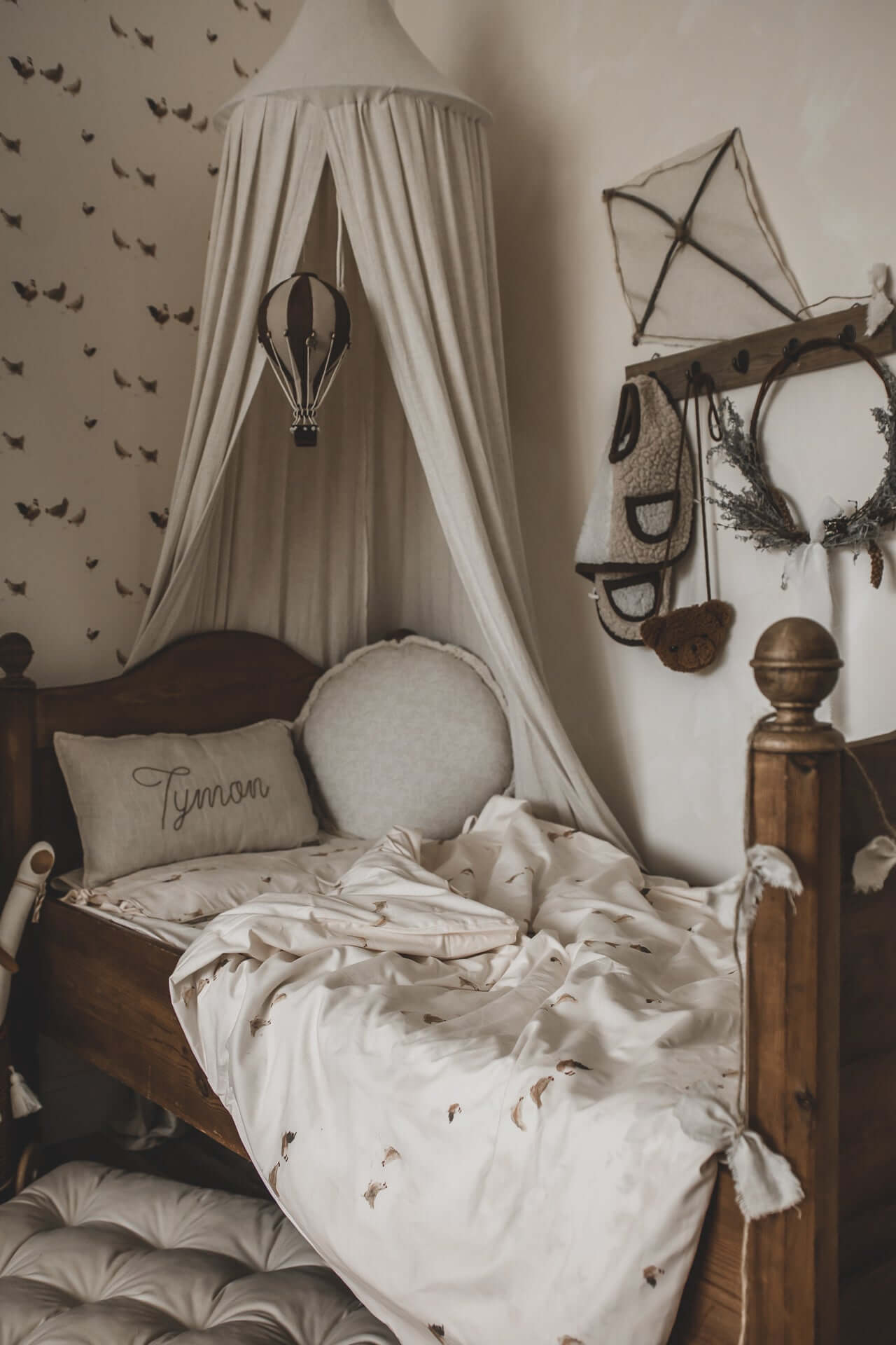 Add a touch of fun and nostalgia to your nursery with the Retro Hens bedding set. Made from soft, breathable cotton, this set features a charming print of retro-style hens in warm, earthy tones on a neutral background. The playful design brings character and coziness, making it ideal for boho, vintage, or farmhouse-inspired kids’ rooms. The lightweight, airy fabric is OEKO-TEX® certified, ensuring it’s safe for sensitive skin and comfortable for everyday use. Each set includes a duvet cover and matching pillowcase, finished with cotton ties instead of zippers or buttons for a natural, handcrafted look. Carefully handmade in the Netherlands, this bedding combines playful style with artisanal quality. Product Details Material: 100% cotton – OEKO-TEX® certified Design: Retro-style hens print on a neutral background Closure: Cotton ties (no zippers or buttons) Set includes: 1 duvet cover + 1 pillowcase (all sizes) Sizes: Crib, toddler, junior, and single bed Care: Machine wash at 40 °C, gentle cycle; do not tumble dry; iron on low if needed Production time: 2–3 business days Handmade in the Netherlands by Matuu Perfect For Playful and vintage-inspired nurseries Parents who love retro animal prints Cozy toddler and kids’ rooms with personality Boho or farmhouse-style interiors A thoughtful baby shower or birthday gift