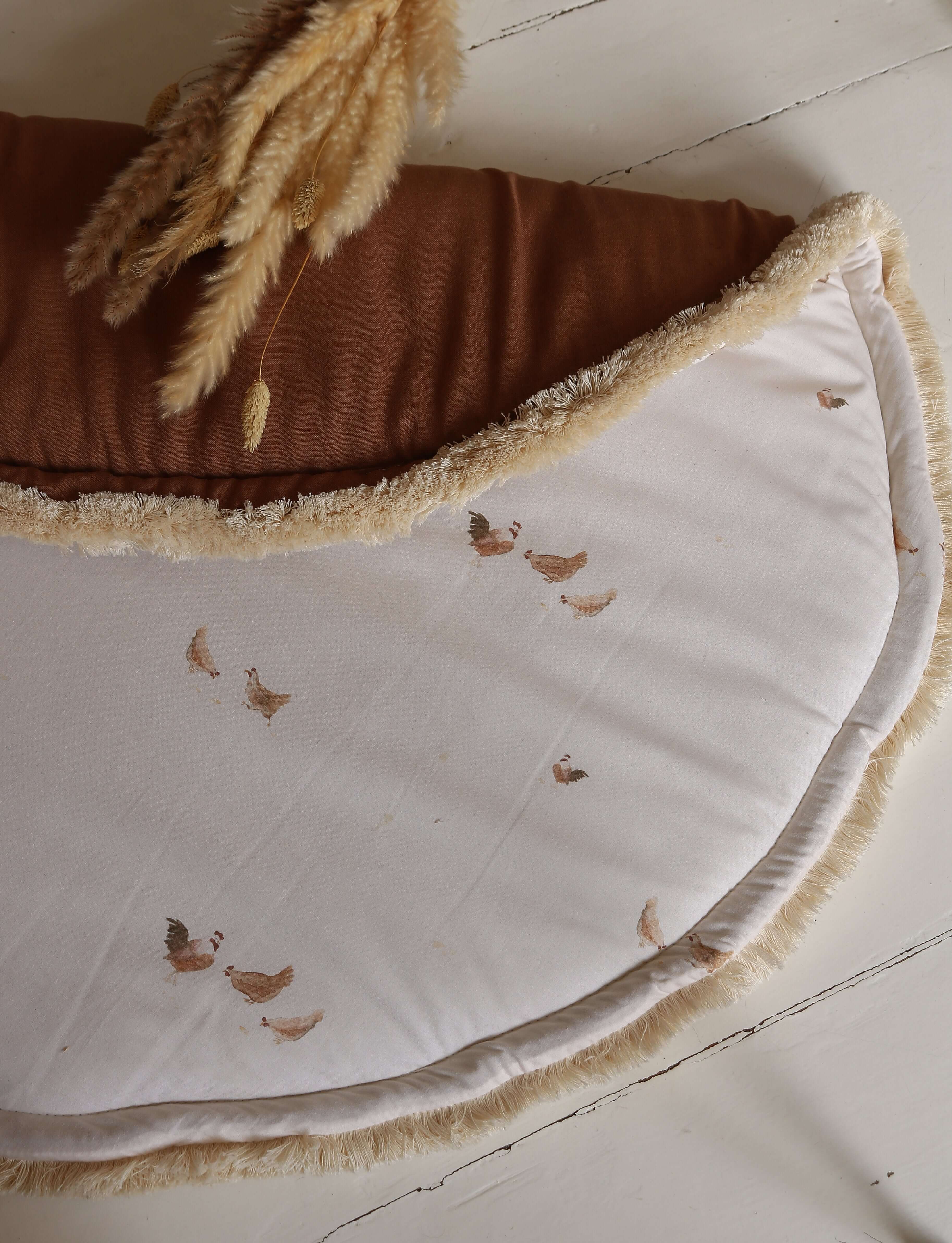 Designed and made in Amsterdam, the Netherlands. Double sided play mat, perfect for bedding your little one. Your child can use the play mat as a rug, a place to play, to learn to rest or a kick off for a journey into imagination. It works great a a floor for the tipi! Round play mat has become recently a must have in kids’ room interior design. Because it’s double sided, you can easily change the look of the room. It is soft and cosy, but above all it is SAFE for your child. The play mat has been carefully sewn using the high quality fabrics. I used the thick 100% cotton fabric with (OEKO-TEX Standard 100 Class 1 certified) . To give an extraordinary look, it is finished with a ecru fringe(97% cotton, 3%pp). The mat is filled with with fibre fill with a thickness of around 2 cm. Chosen filling is also lightweight and has anti allergic properties – it is odourless and chemical free, does not absorb moisture. Washing instructions: We recommend washing in max 30°C, using a special gentle cycle. Spin at 1200 rpm. Ideally with a washing detergent that does not contain phosphates. Iron onlyu the cotton side, at max 100°C (one dot setting) with a huge amount of steam. Don’t bleach or use other strong bleaching detergents. Don’t wring after washing. There is a possibility to make a mat in other size, let me know if you are interested 😉 The price above is including TAX(21%).