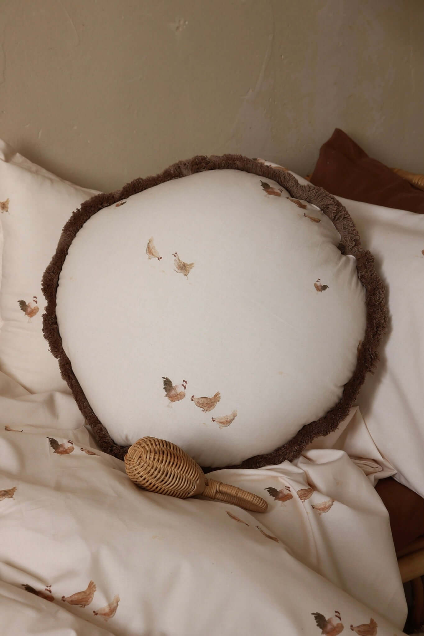 Gorgeous ecru „retro hens” pillow with ecru fringes. Size -diameter 40 cm You can combine different pillows to discover better results. Washing instruction:Machine wash in 40 degrees, dry flat Processing time: 1-3 work days