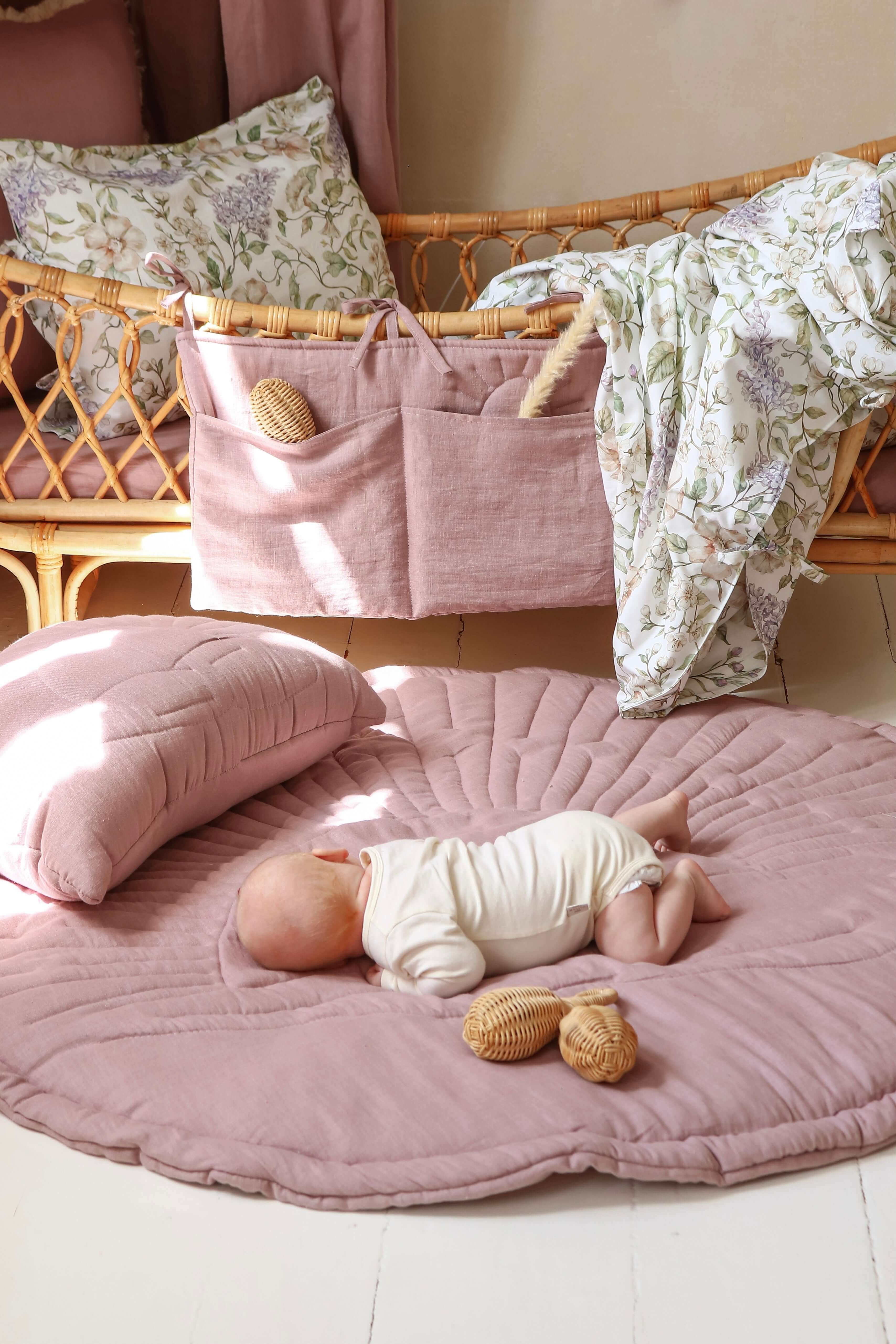 Add warmth and charm to your babyโs nursery with the Retro Pink Sun crib organizer โ a practical and beautiful bed pocket handcrafted from soft, breathable linen blend. With its vintage-inspired dusty pink shade and embroidered sun motif, it brings a retro aesthetic to modern baby rooms. This handmade nursery storage pocket features three spacious compartments to help you organize everyday essentials โ from diapers and wipes to pacifiers, toys, and muslin cloths. Designed to tie securely onto the side of a crib, cot, or toddler bed, itโs perfect for keeping everything within armโs reach โ even in smaller spaces. Why parents love it: โ Timeless, earthy color โ easy to style in neutral, bohemian or Scandinavian interiors โ Natural look and feel โ made from high-quality linen โ Lightweight, durable, and soft โ with quilted back and decorative sun stitching โ Machine washable at 40ยฐC โ easy to care for โ Handmade with care โ a unique and thoughtful gift for new parents Details: โข Dimensions: 50 x 32 cm โข Fabric: 100% linen โข Filling: Oeko-Texยฎ certified soft polyester โข Ties: adjustable fabric ties for easy attachment โข Preparation time: 2โ3 business days Whether youโre refreshing your own babyโs space or looking for a thoughtful baby shower gift, this retro-inspired crib pocket is the perfect blend of function and style.