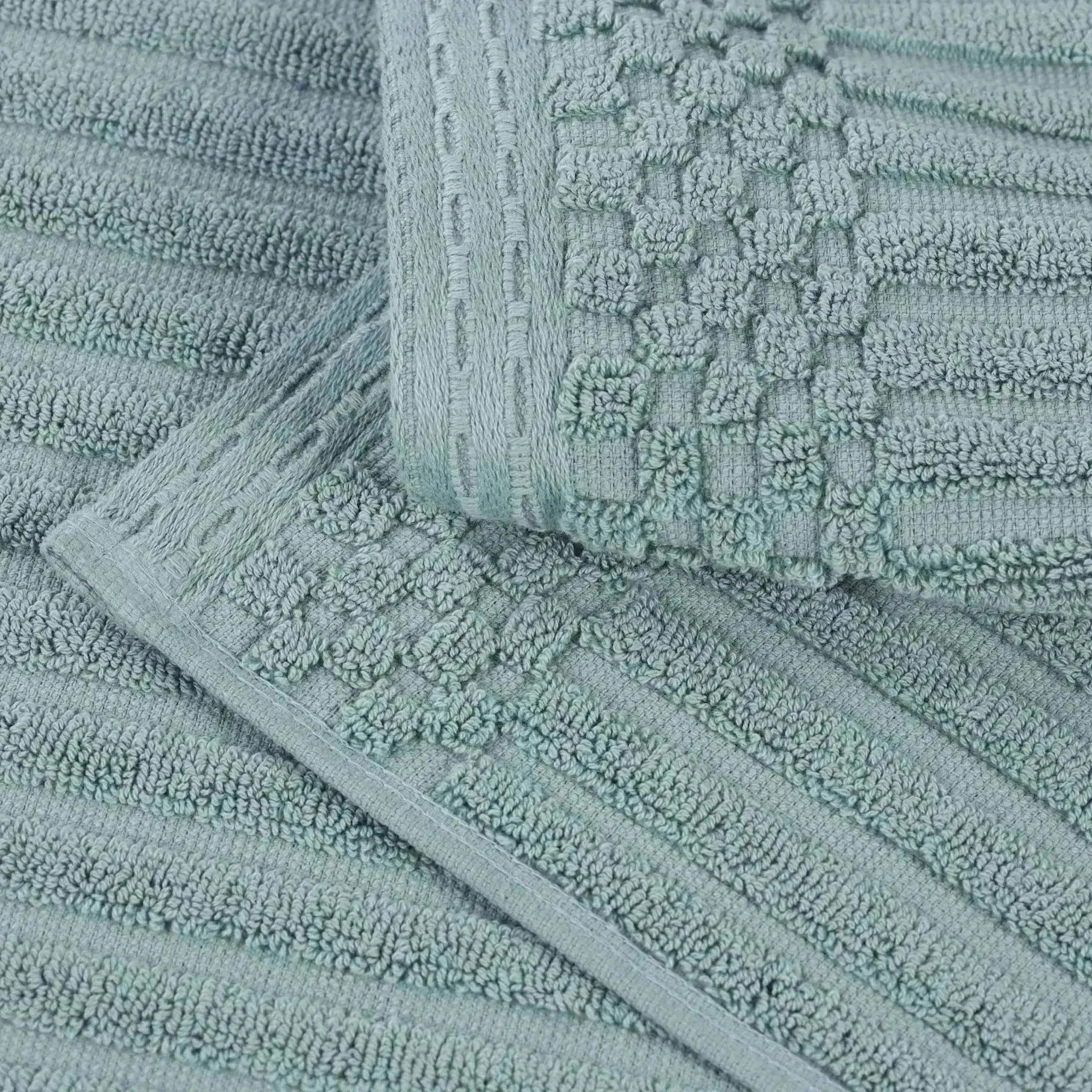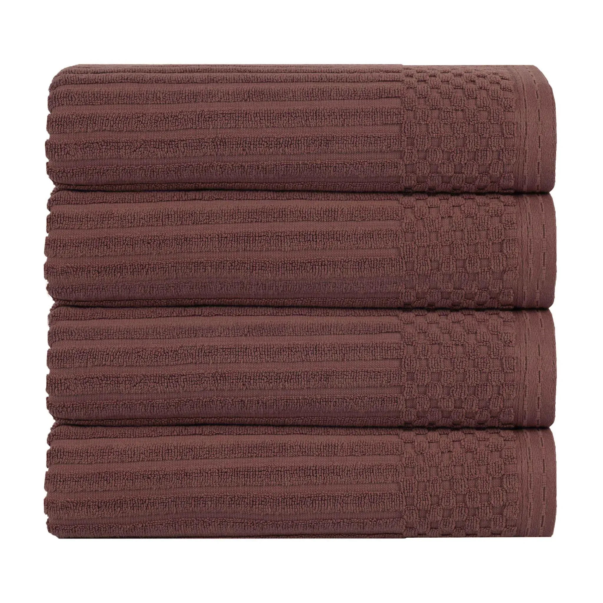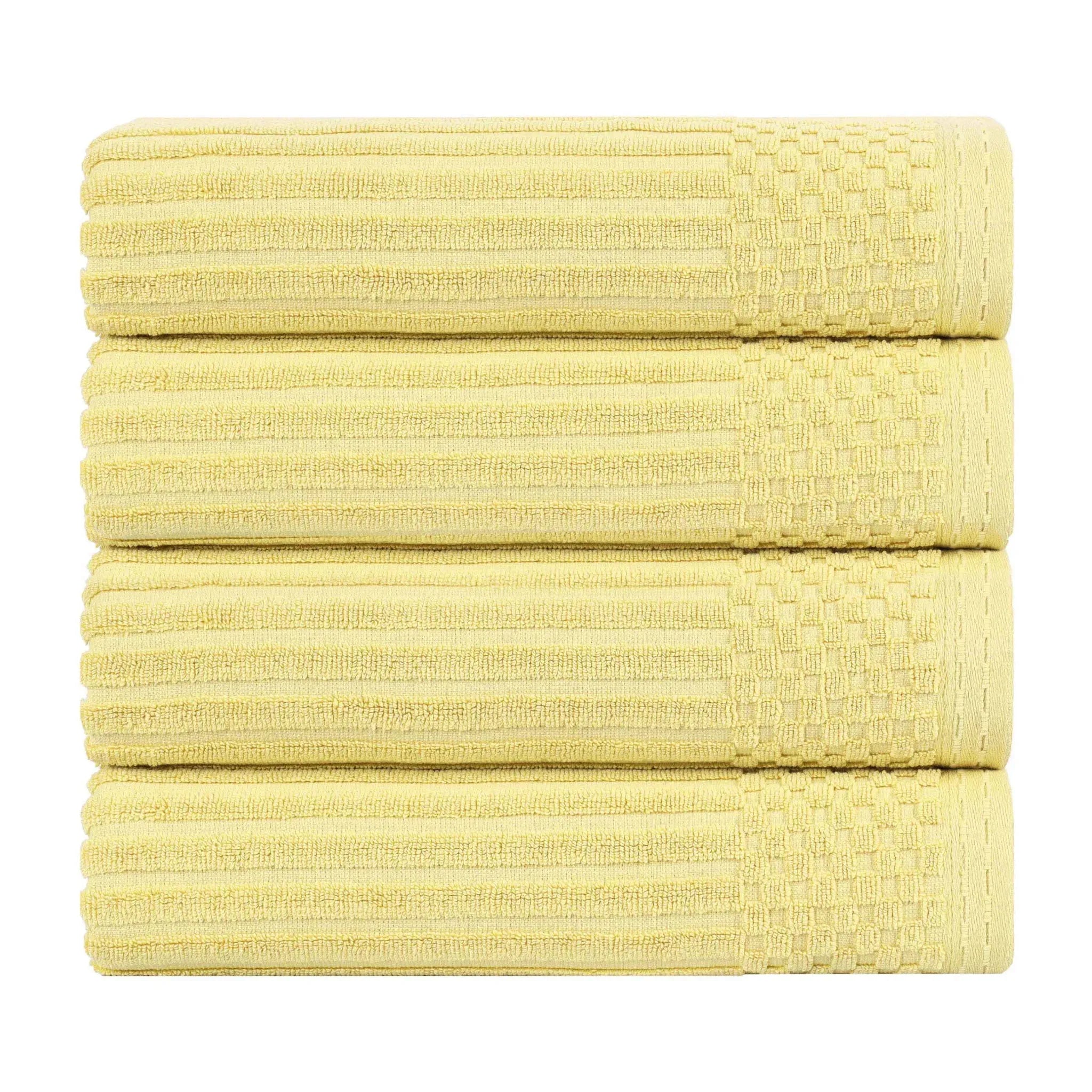 This is a set of towels crafted from 100% cotton, offering both softness and high absorbency. The towels feature a ribbed texture on the main body and a textured, grid – like border, adding a touch of style. They come in a wide range of solid colors, making them versatile for different bathroom decors.