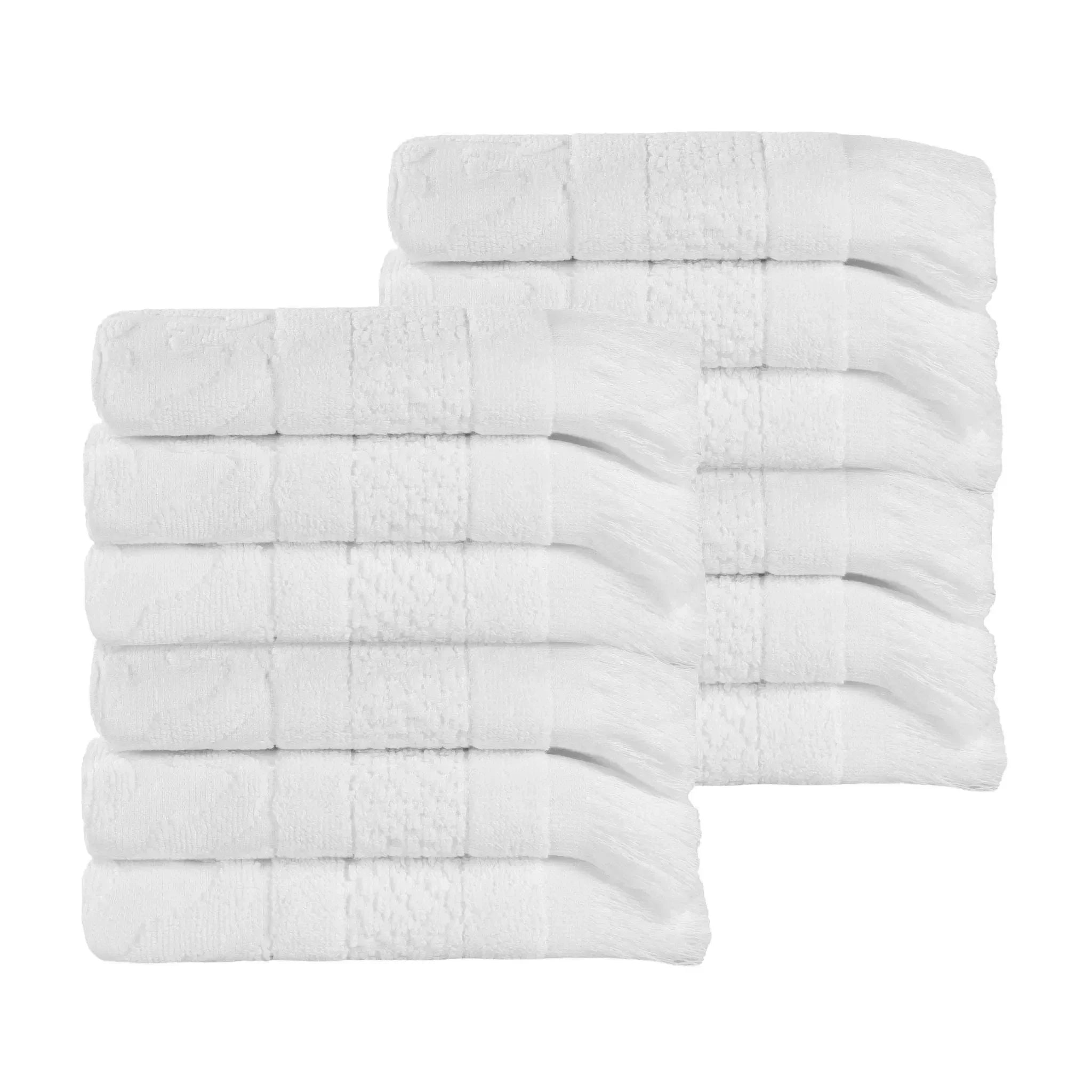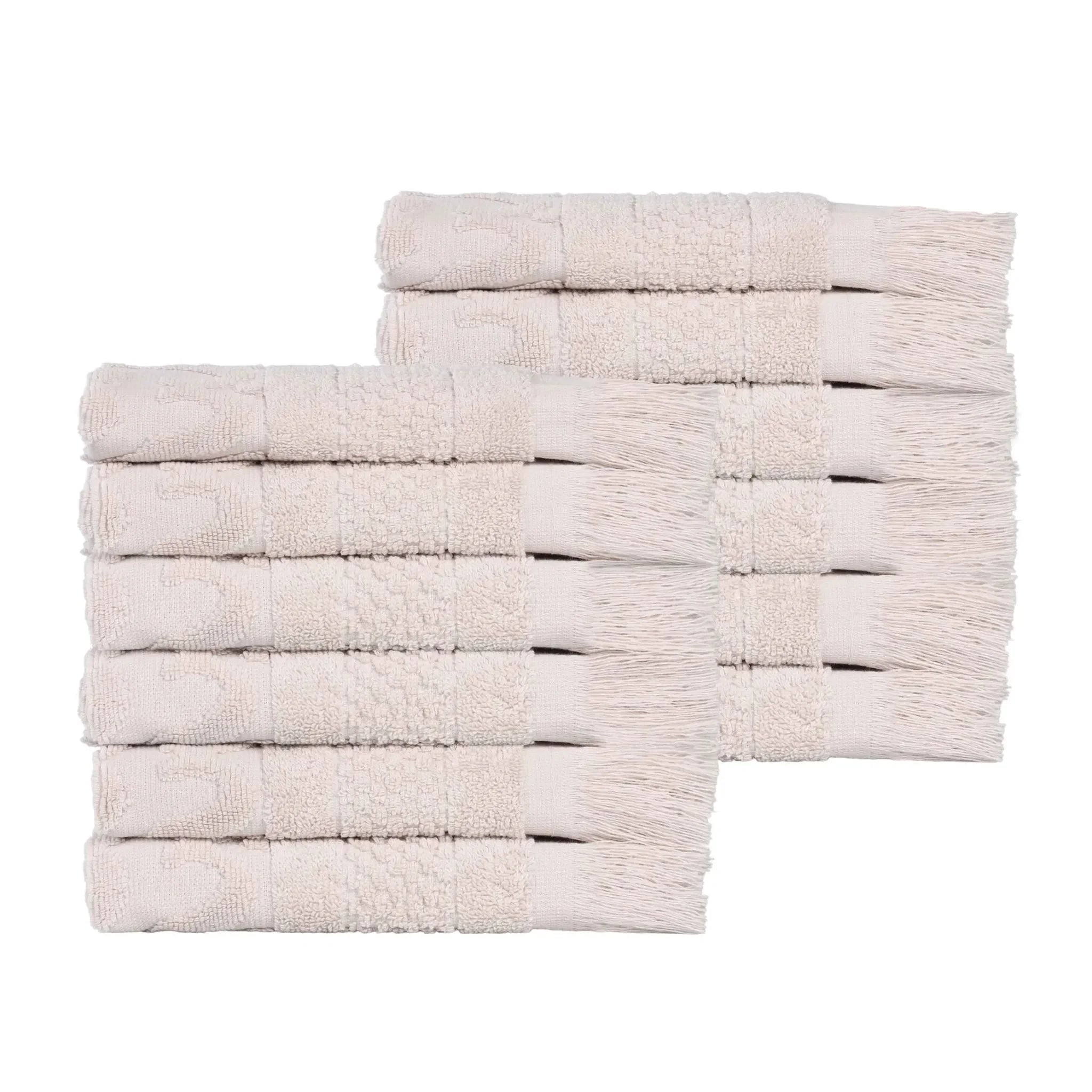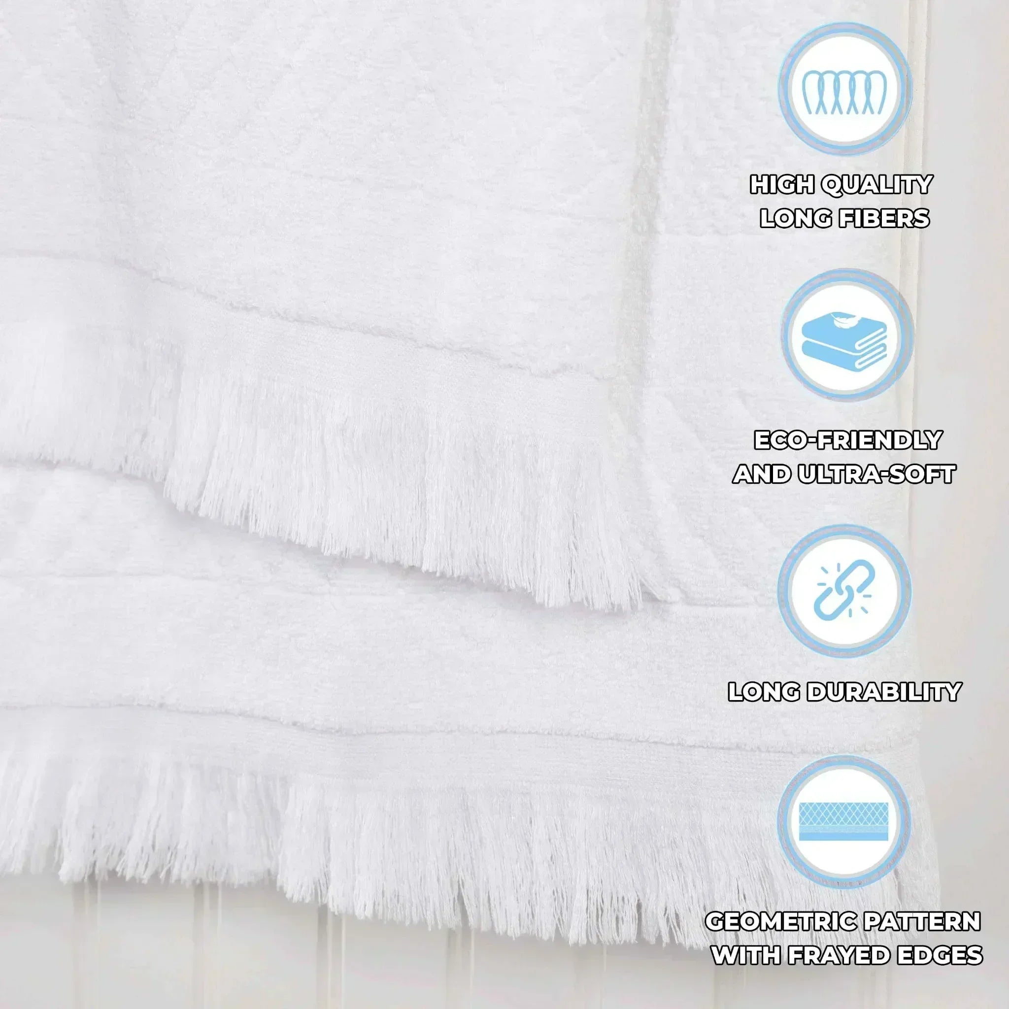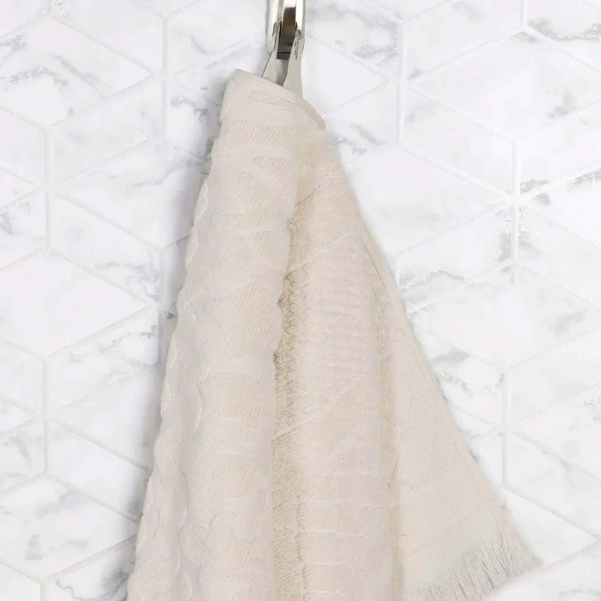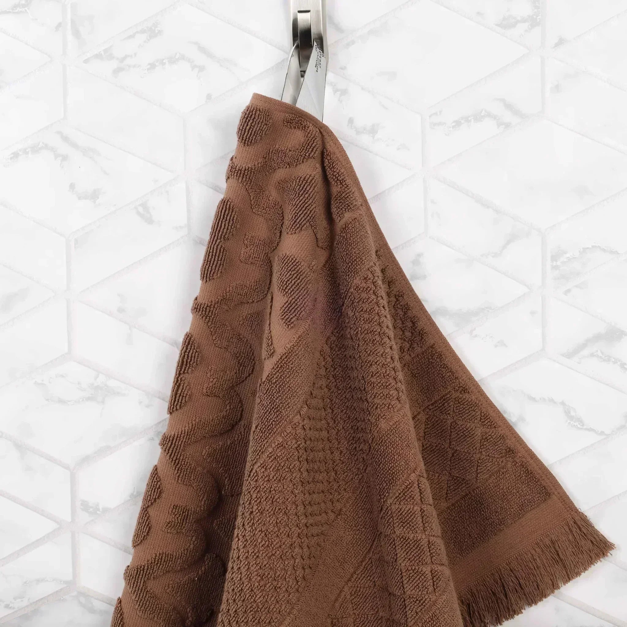 This towel set is crafted from 100% premium cotton, offering a soft and plush feel. It features a geometric embossed pattern on the main body, along with decorative fringes at the bottom. With multiple color options, it can easily match different bathroom decors.