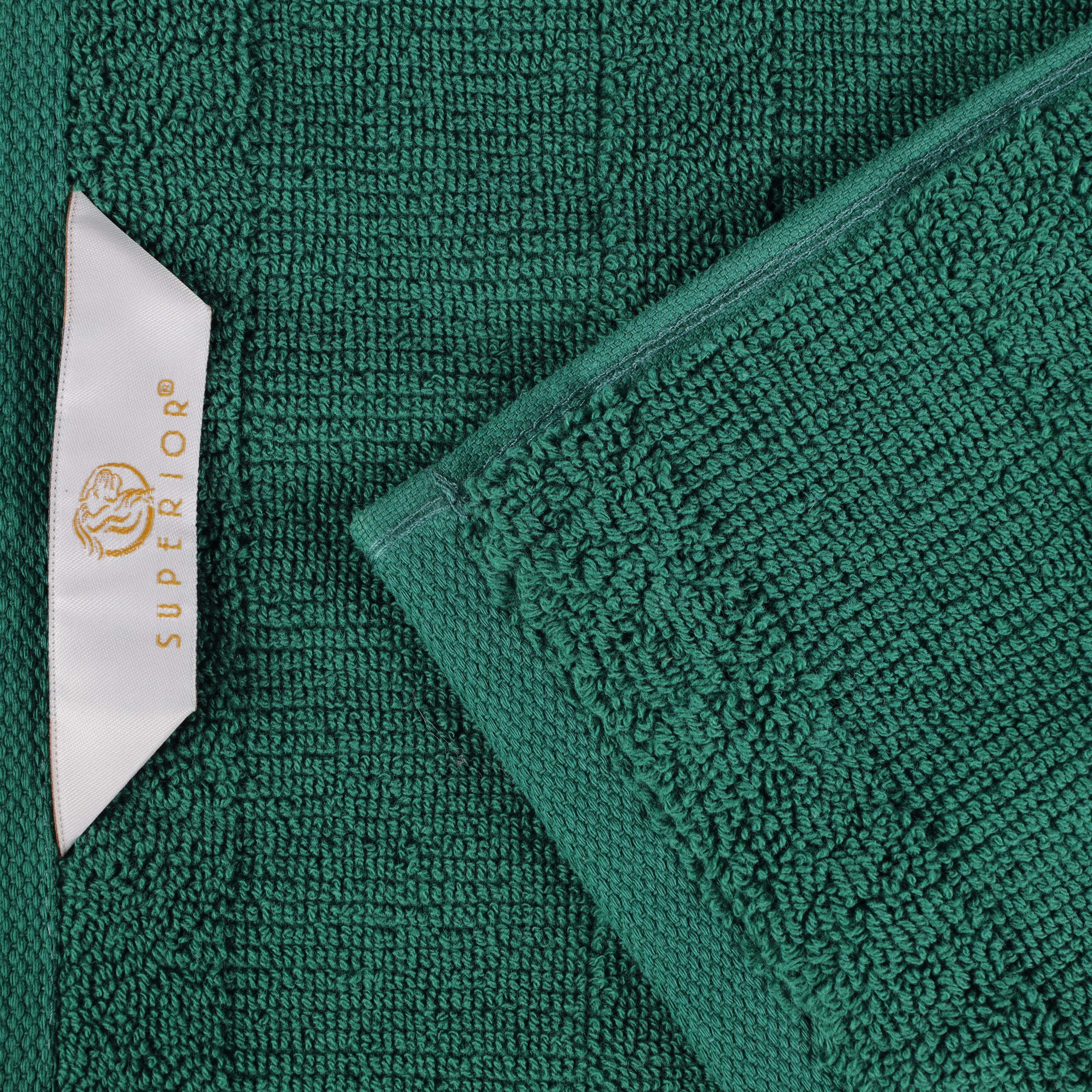 This towel set is a comprehensive collection for the bathroom. It includes both large bath towels and smaller hand towels or washcloths. Made of cotton terry cloth, it has a plush texture. The towels come in solid colors like evergreen, ivory, and white, with subtle geometric patterns adding a touch of visual interest.
