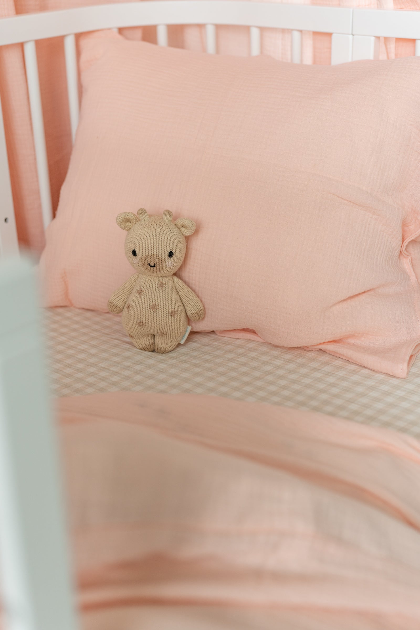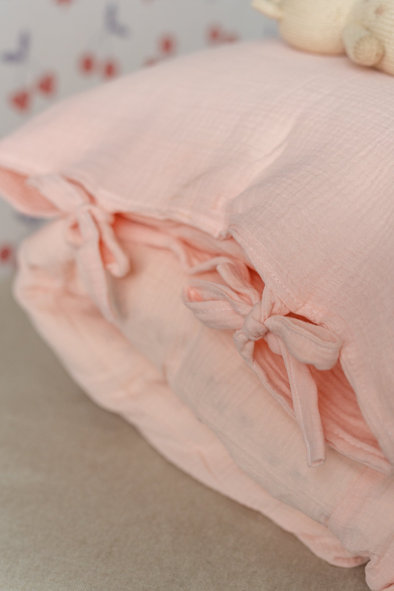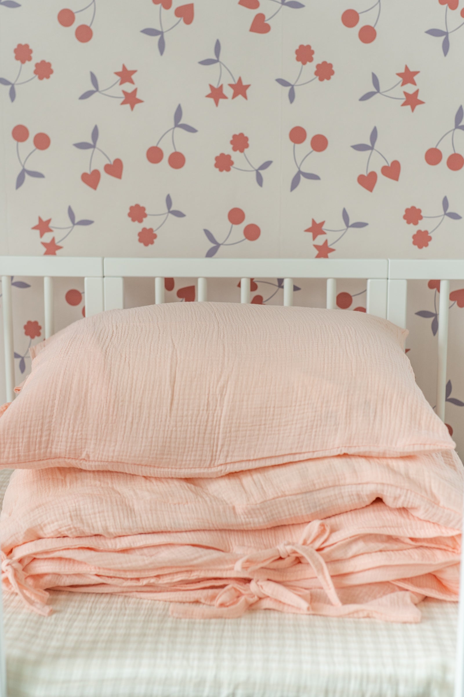 Create a soft and dreamy space for your little one with our Rosy Cloud bedding set – made from 100% double gauze cotton muslin. This warm, muted pink bedding features a delicate texture and timeless simplicity, perfect for cozy, gender-neutral nurseries and toddler rooms. The breathable muslin fabric ensures comfort all night long and is gentle on sensitive skin. With its relaxed look and natural softness, this set adds warmth and charm to both minimal and boho-inspired interiors. Each set includes a pillowcase and duvet cover with cotton tie closures – safe, stylish, and free from buttons or zippers. Available in sizes from crib to single bed. Product details: Fabric: 100% cotton muslin (double gauze), OEKO-TEX® certified Color: Warm muted pink / Rosy clay Closure: Cotton ties – no buttons or zippers Sizes: Crib, toddler, and single bed Care: Machine wash at 40°C, air dry, do not tumble dry Handmade in the Netherlands by Matuu Processing time: 2–3 next business days Perfect for: Baby or toddler bedding Soft, minimal or boho-style nurseries Gender-neutral baby gifts Natural cotton bedding lovers