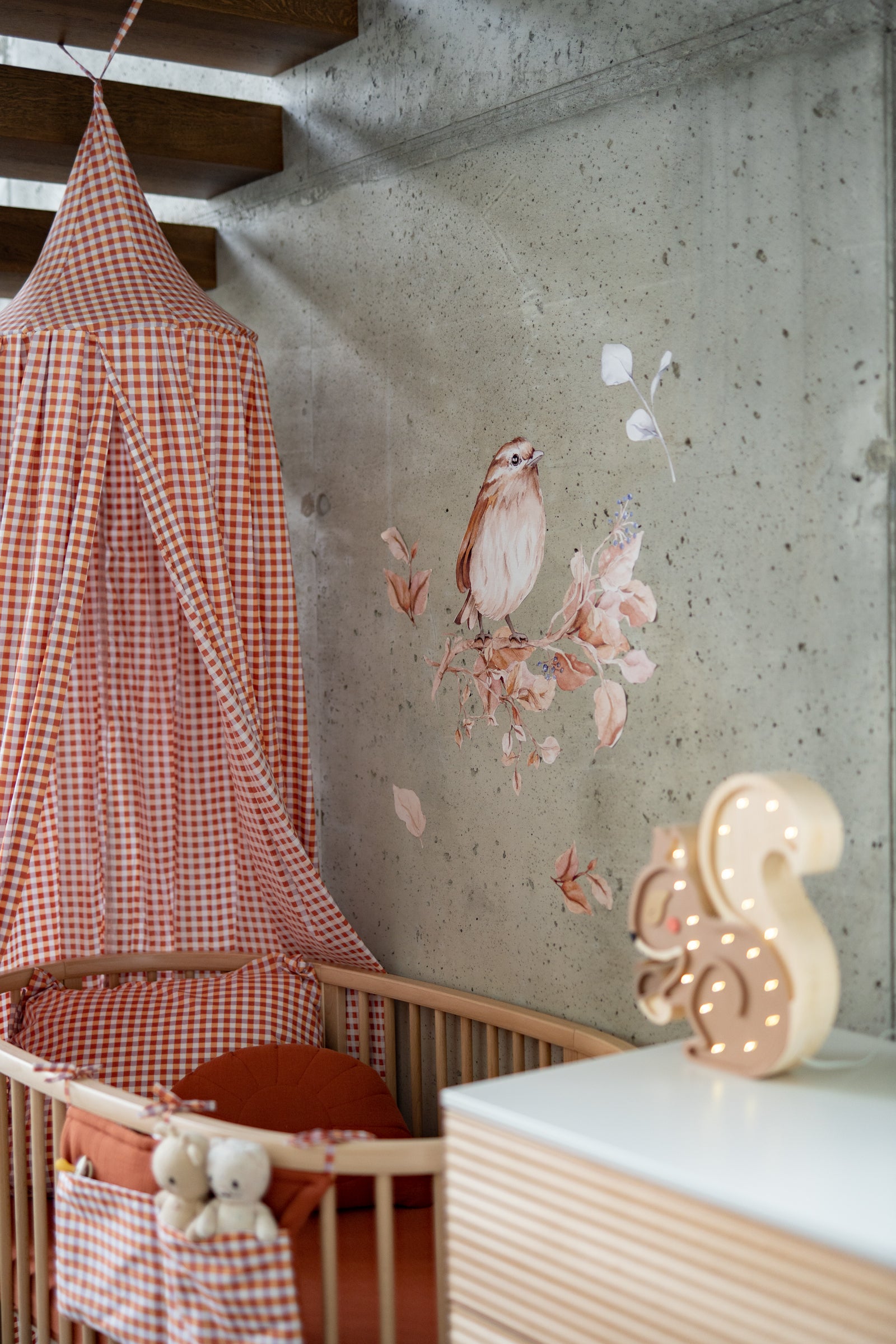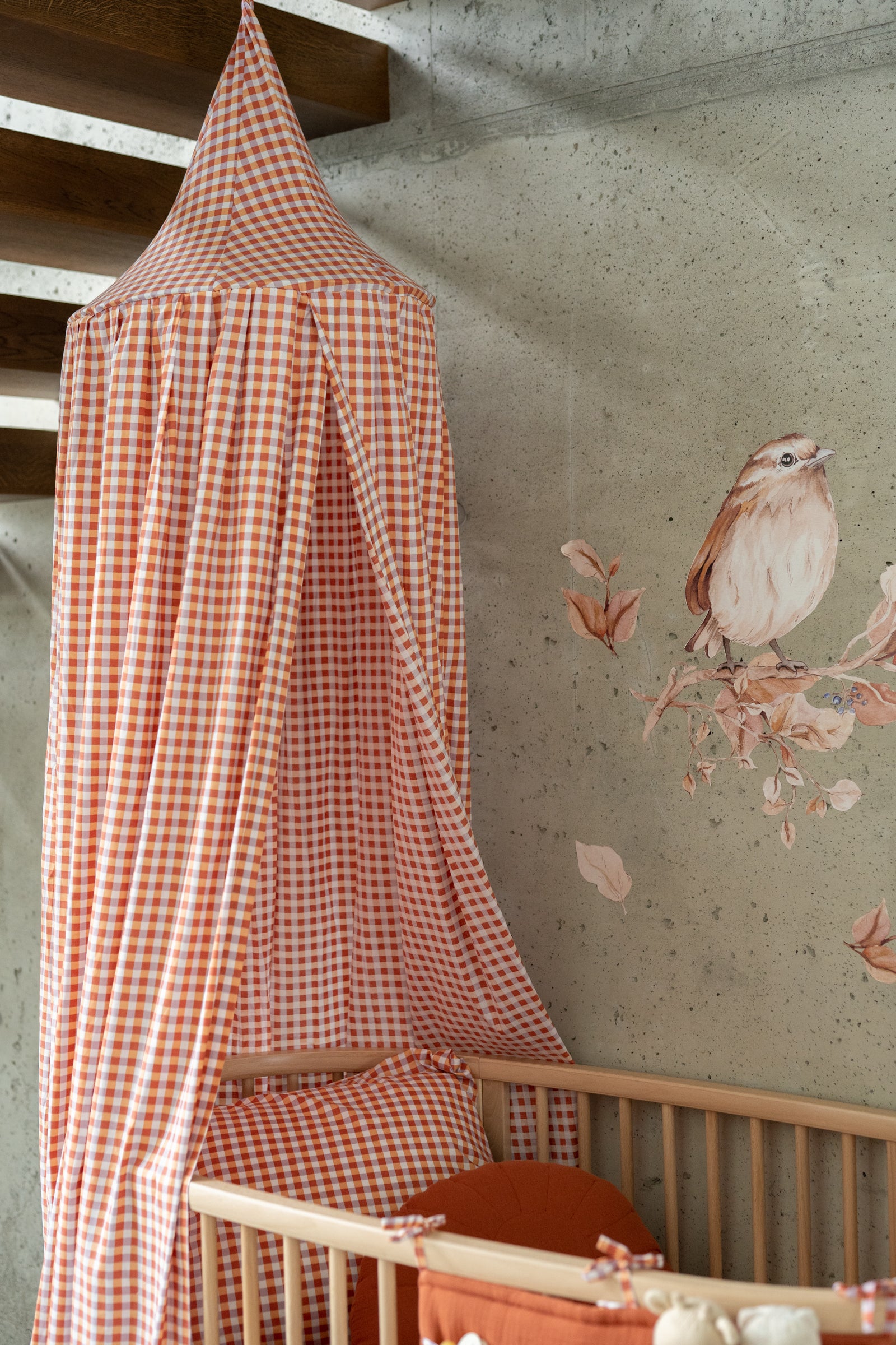 Create a warm, countryside-inspired atmosphere in your child’s room with our Rustic Gingham canopy – handcrafted from soft, breathable cotton muslin featuring a charming check pattern in rich plum and warm rust tones. This timeless design blends beautifully into boho, Scandinavian, or gender-neutral interiors. Whether hung above a crib, toddler bed, reading nook, or play corner, the lightweight fabric filters light gently, creating a cozy, calm space for your little one to rest or play. The fabric’s texture and natural color palette evoke a sense of rustic charm and comfort. Made with care in the Netherlands, the canopy is easy to hang using cotton ties and includes a concealed metal hoop plus an interior loop for hanging a pendant, mobile, or fairy lights. Product details: Fabric: 100% cotton muslin (single layer), OEKO-TEX® certified Color: Plum & rust gingham check Height: Approx. 235 cm (fabric) + 60 cm cotton hanging ties Hoop diameter: 50 cm (metal ring included, hidden inside) Mounting: Two cotton straps – compatible with any ceiling hook Interior loop: For hanging pendant, mobile, or lights Washing: Remove hoop before washing. Machine wash at 30 °C (gentle cycle), air dry Preparation time: 2–3 business days Handmade in the Netherlands by Matuu Perfect for: Crib or toddler bed canopy Rustic, boho, or gender-neutral nursery Cozy reading corner or play tent Thoughtful handmade baby shower gift