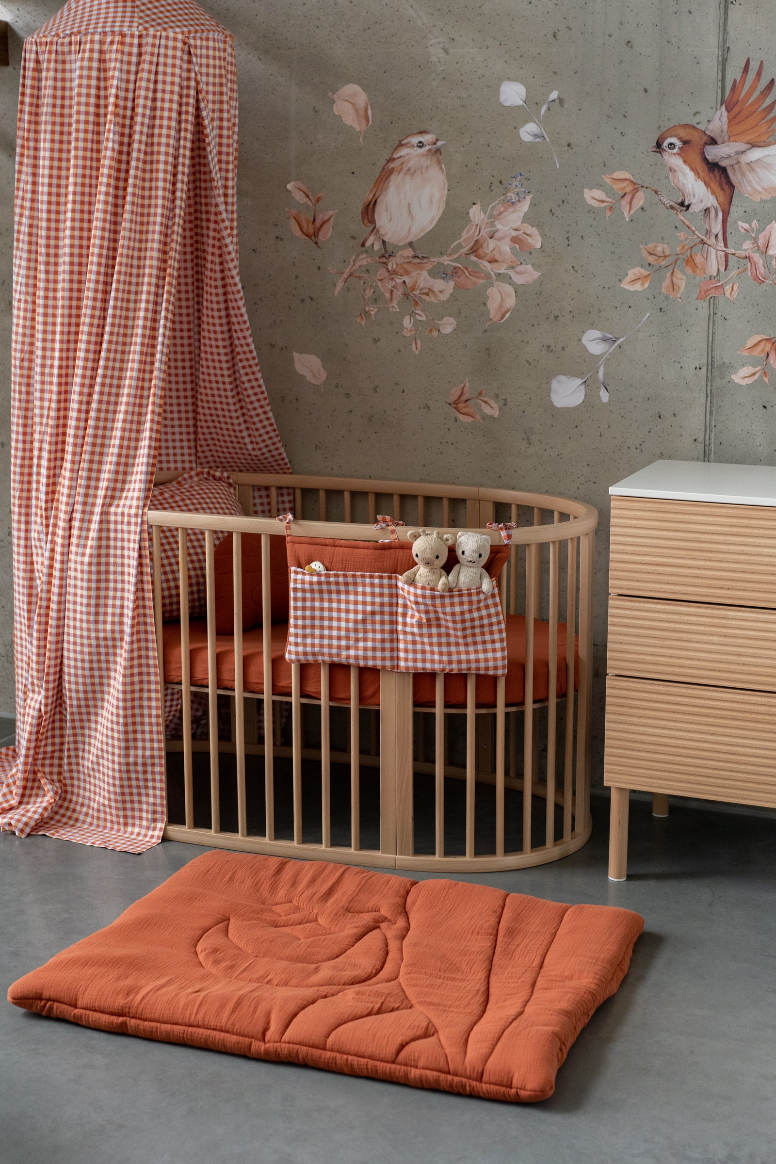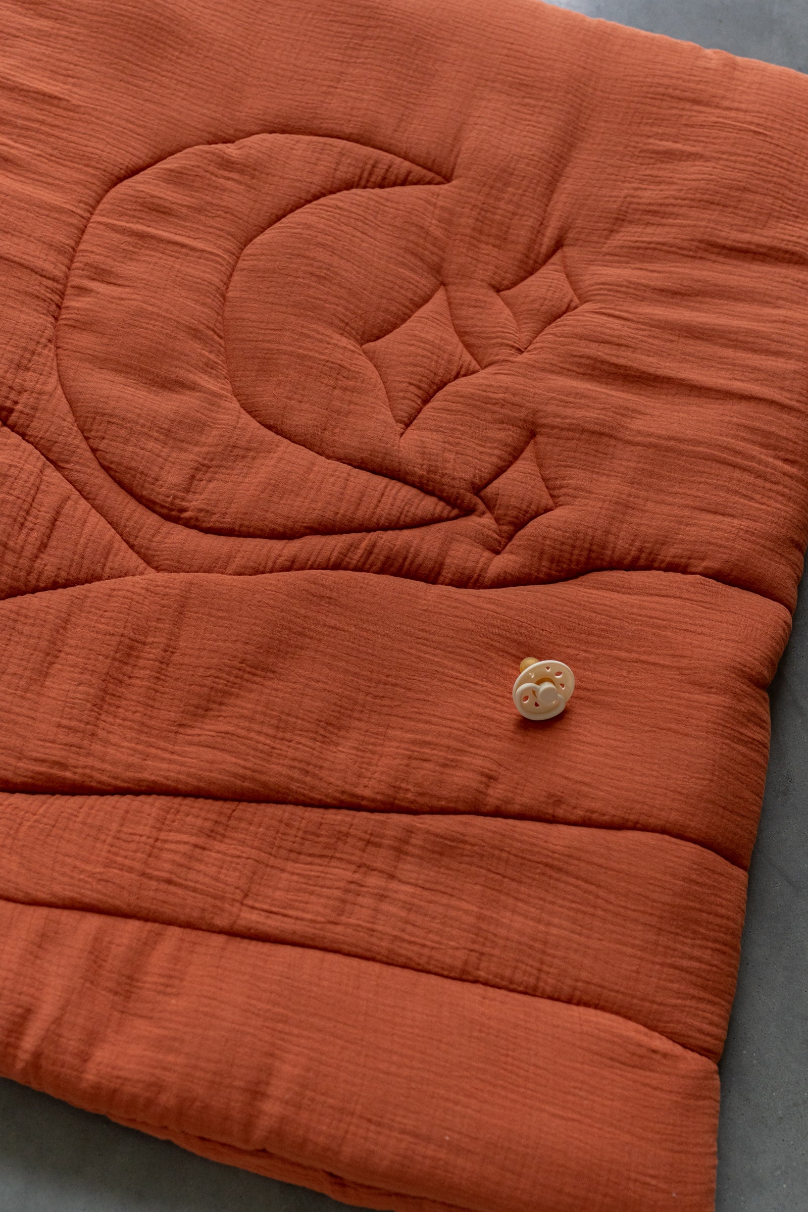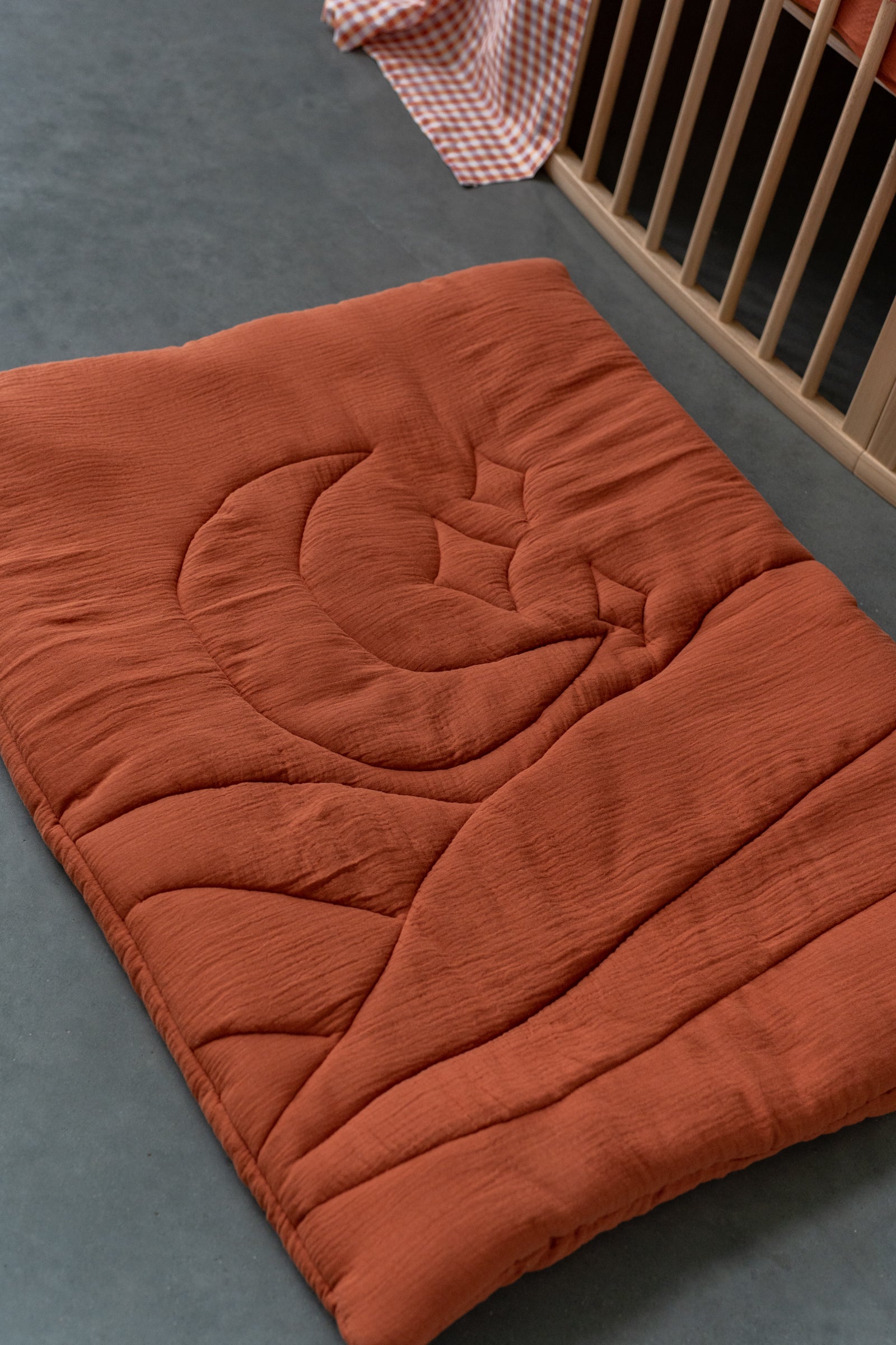 ย Quilted Playmat can be used for a newborn in a babybox or a play mat on the ground. Later as a stylish rug, bedcover for your toddler or on the wall as wallhanging. Soft baby muslin playmat with OEKOTEX-certified. Hypoallergenic filling. Color: ย rust/ Terracotta *small differences in the quilted illustration and mats may appear as everything is handmade and quilted by heart. Can be washed at 30ย degrees Delivery time: 1-3 business days (counting from the next business day)