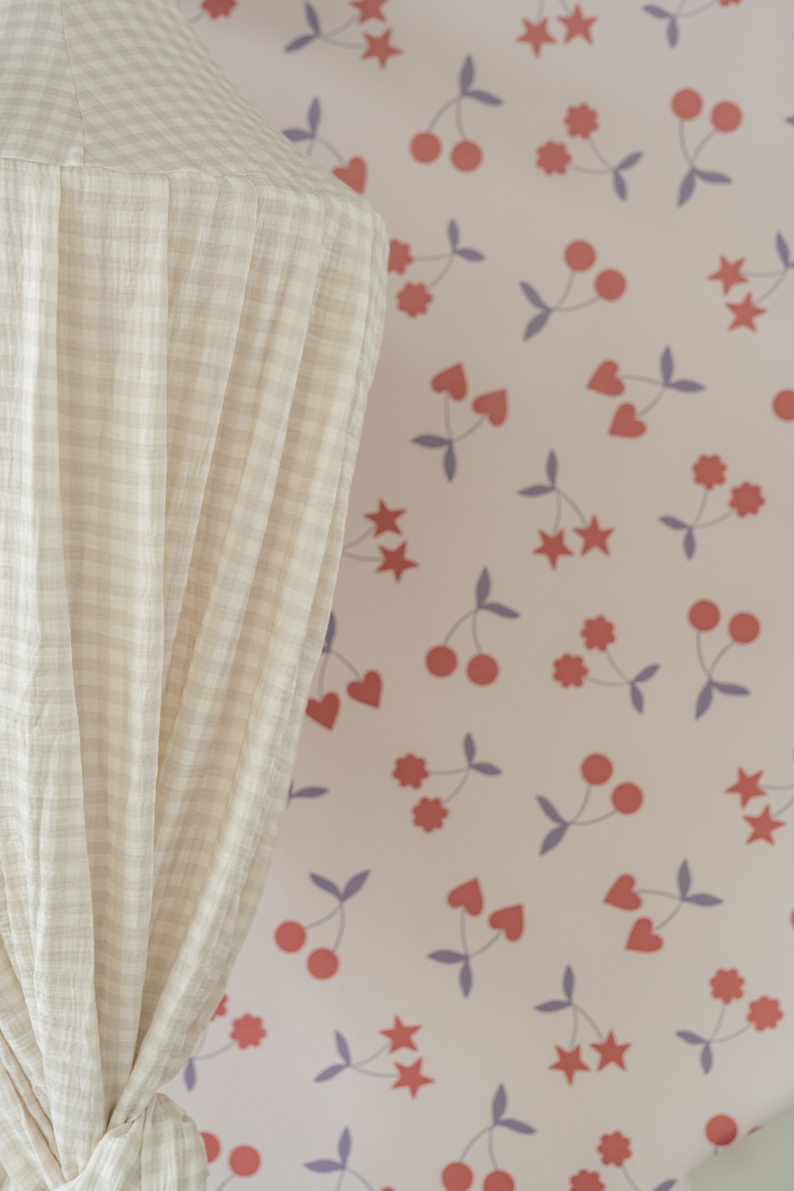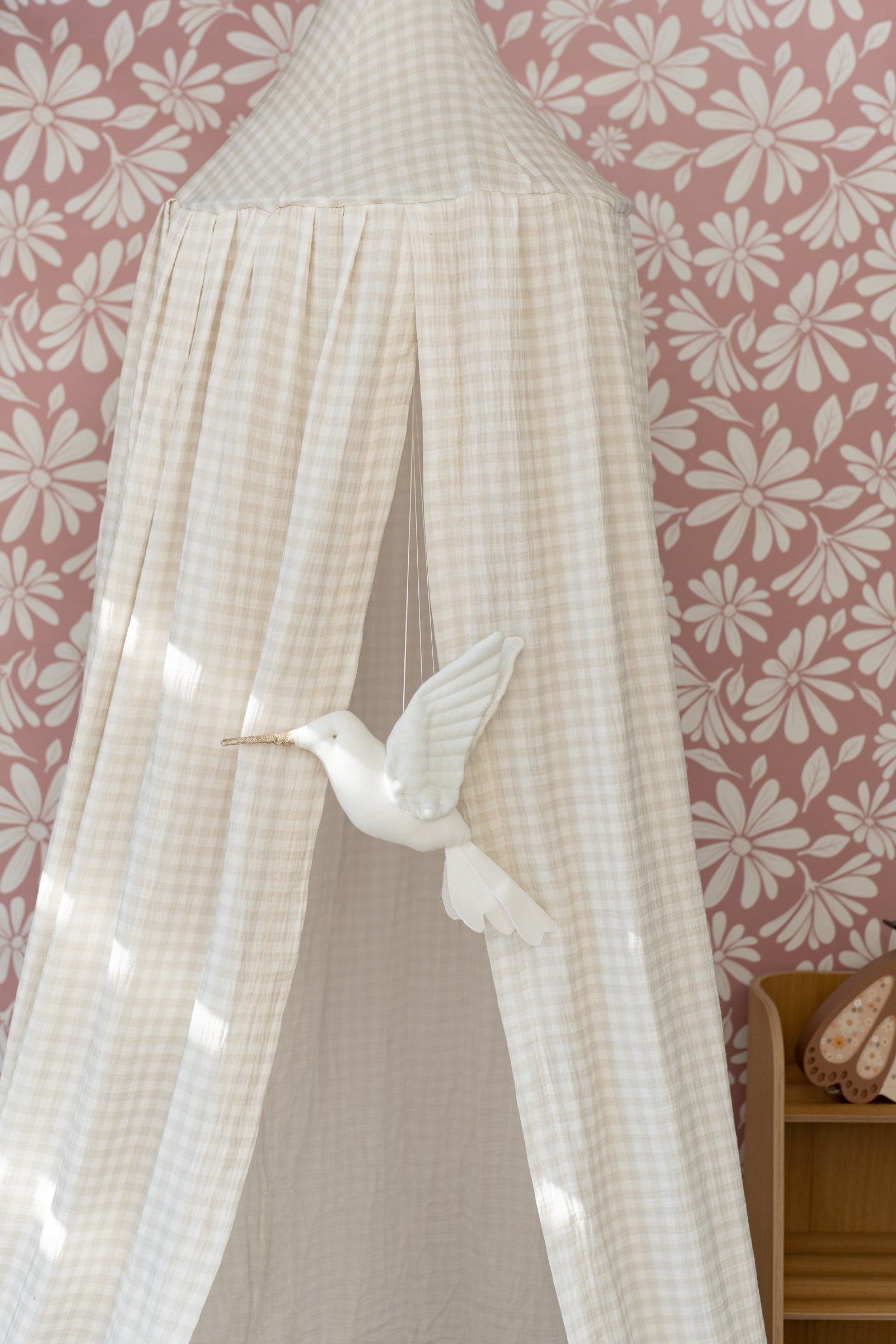 Create a peaceful and stylish space for your little one with our Sage Picnic Checked canopy. Handcrafted from soft, breathable muslin cotton, this lightweight canopy features a charming gingham pattern in calming sage green and warm beige tones – perfect for neutral, vintage-inspired or boho-style nurseries. The canopy softly filters the light and creates a cozy corner above a crib, toddler bed or reading nook. Whether you’re designing a dreamy baby room or a cozy play area, this canopy brings comfort, texture and a timeless feel to any interior. Suspended from a sturdy hidden hoop (50 cm diameter) and finished with long cotton ties, it’s easy to hang, remove and wash. Inside, there’s a handy loop for hanging a mobile, fairy lights or a soft pendant. Product details: • Fabric: 100% cotton muslin (single layer), OEKO-TEX® certified • Pattern: Gingham in sage green and beige • Height: approx. 235 cm + 60 cm hanging ties • Hoop: 50 cm diameter metal ring (included, hidden inside) • Mounting: Two cotton straps – fits any ceiling hook • Interior loop: For hanging a mobile or decor • Care: Remove hoop before machine washing at 30°C, air dry • Preparation time: 2–3 next business days • Handmade in the Netherlands by Matuu Perfect for: • Baby bed or crib canopy • Gender-neutral nursery decor • Cozy reading or play corner • Handmade baby shower gift