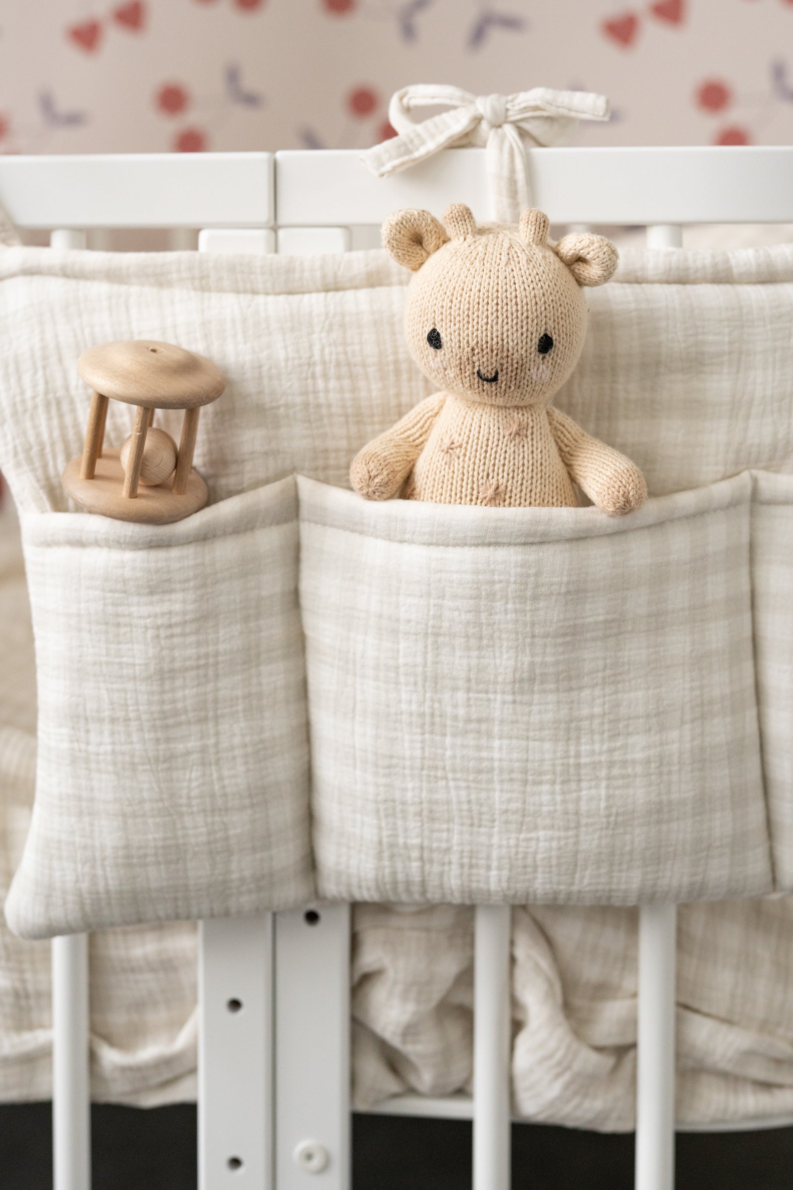Add a fresh and playful touch to your babyโs nursery with the Sage Picnic crib organizer โ a practical and charming storage solution crafted from soft cotton with a classic green gingham check. This cozy bed pocket keeps your little oneโs essentials โ like pacifiers, wipes, teethers, or soft toys โ neatly stored and always within reach. With two spacious front compartments and matching cotton ties, it attaches easily to any crib, cot, or toddler bed. Its soft structure and cheerful pattern make it a beautiful addition to boho, vintage, or farmhouse-style interiors. Handmade with care in the Netherlands using high-quality natural fabrics. Product Details: Size: 55 x 30 cm Fabric: 100% cotton (OEKO-TEXยฎ certified) Color: Soft sage green gingham Closure: Fabric ties โ easy to attach and remove Washing: Machine washable at 40ยฐC Processing time: 2โ3 next business days Handmade by Matuu in the Netherlands