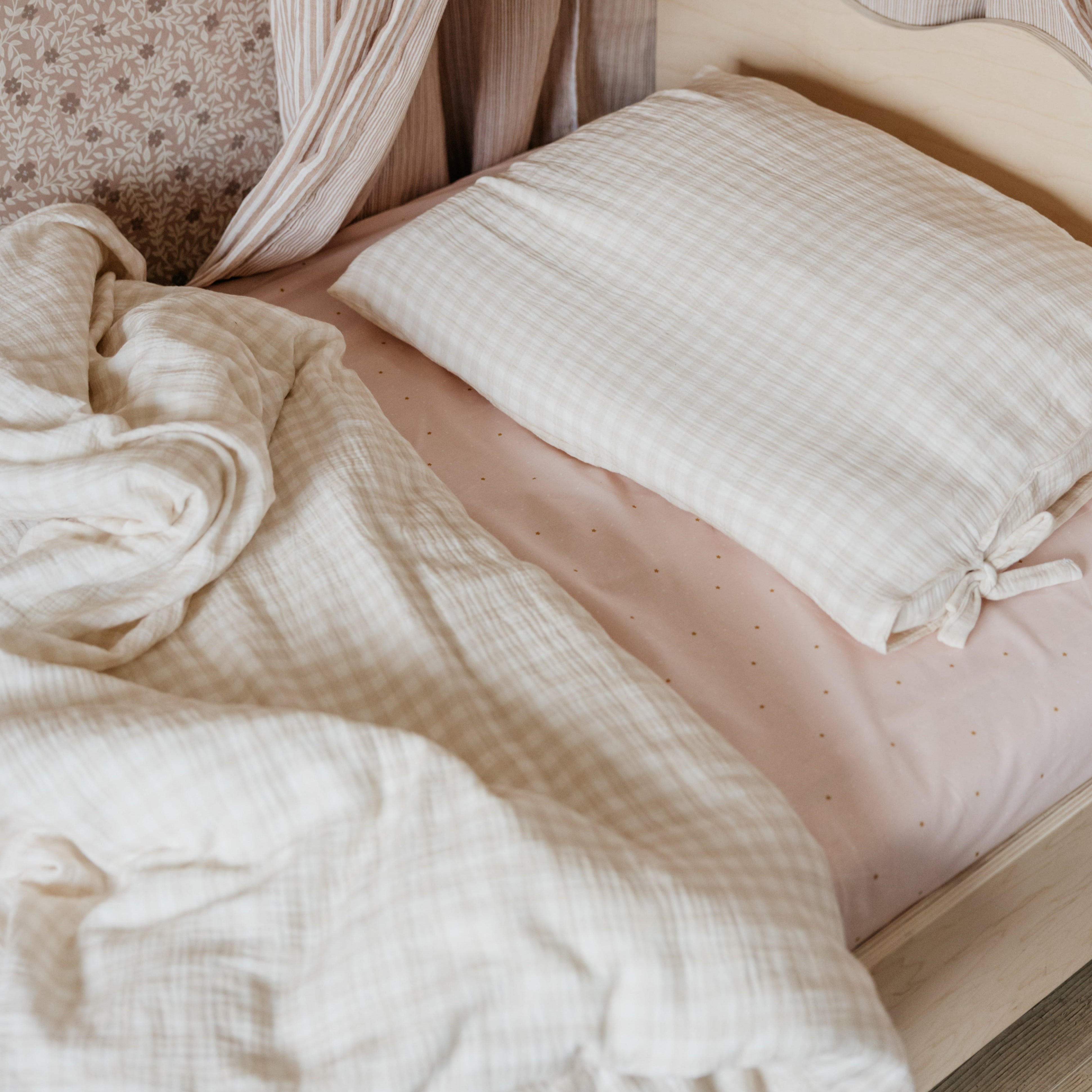 Add softness and timeless style to your child’s room with our Sand Gingham bedding set. Made from high-quality cotton muslin in a warm beige gingham pattern, this bedding brings natural charm and cozy comfort to any crib or toddler bed. The breathable, double-layer muslin fabric is gentle on delicate skin, lightweight yet warm, and OEKO-TEX® certified – making it safe for even the youngest sleepers. The muted check design is easy to style in boho, vintage, or Scandinavian-inspired interiors. This handmade set includes a duvet cover and a matching pillowcase, both with hidden envelope closures for safety and a seamless look. Product details: • Fabric: 100% cotton muslin – double gauze, OEKO-TEX® certified • Color: Beige gingham / sand check • Closure: Envelope-style (no zippers or buttons) • Handmade in the Netherlands by Matuu • Machine washable at 30°C (delicate cycle) • Preparation time: 2–3 business days Perfect for: • Baby bedding set for crib or cot • Toddler duvet cover with pillowcase • Boho, vintage or gender-neutral nursery decor • Thoughtful handmade baby shower or birthday gift