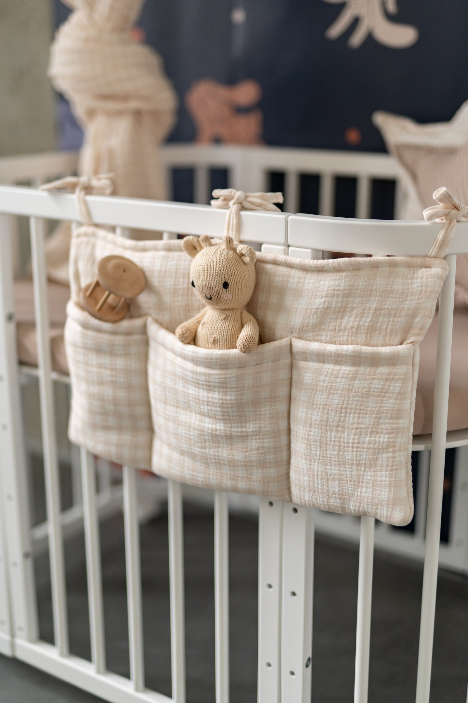 Keep it minimal. Keep it soft. Meet the Sand Gingham crib organizer. Stay organized with this cozy Sand Gingham crib organizer, crafted from soft muslin cotton in a gentle beige gingham pattern. Perfect for storing diapers, pacifiers, toys or teethers – everything stays within reach and looking lovely. Easily ties to any crib or cot for a charming and practical nursery solution. Product features Dimensions: 55 x 30 cm Fabric: 100% cotton muslin – airy, soft and textured (OEKO-TEX certified) Color: Warm beige gingham Washing: Machine washable at 40°C Preparation time: 2–3 next business days Handmade with love in the Netherlands by Roksana (Matuu)