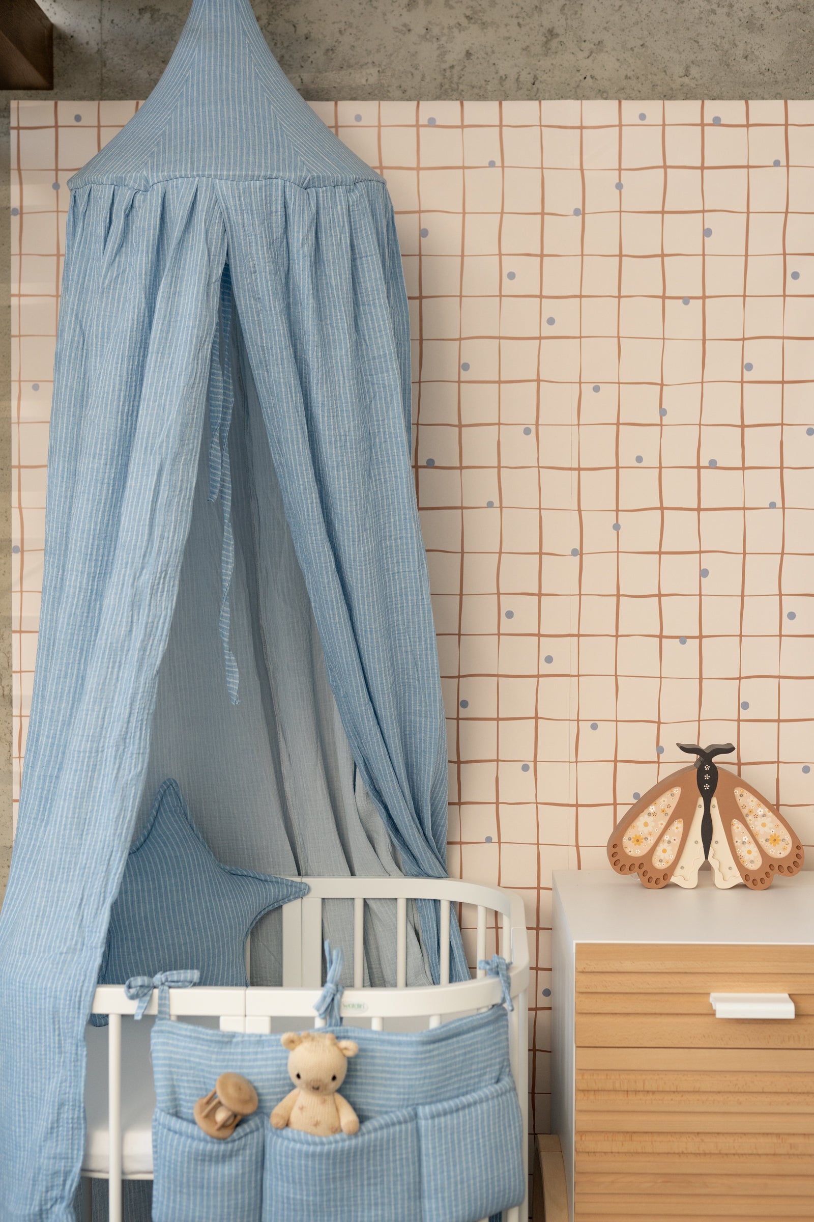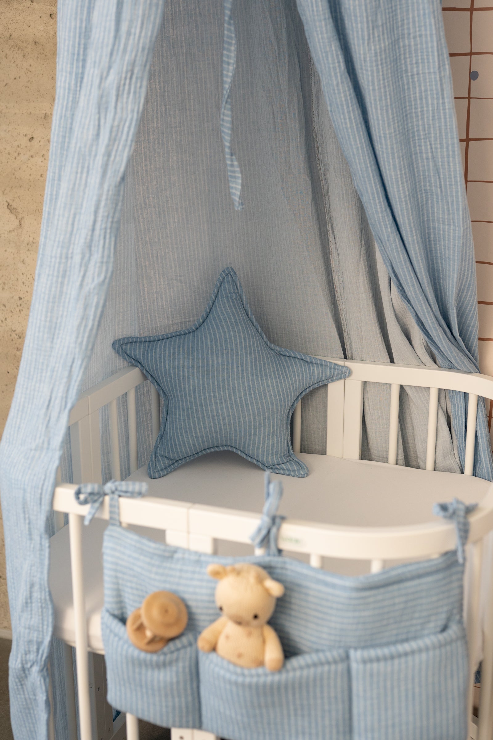 Bring a soft, airy feel to your babyโs nursery with our Sky Blue Stripes canopy โ a light and breathable canopy made from 100% muslin cotton in subtle blue stripes. The fabric gently filters the light, creating a peaceful, cozy space for naps, playtime or reading. This single-layer canopy is perfect for hanging above a crib, bed, reading nook or play mat. Its calm color and minimalist pattern blend beautifully into Scandinavian, coastal or gender-neutral interiors. Handmade with love in the Netherlands, itโs easy to install, remove and wash โ a practical and beautiful choice for modern nurseries. Product details: Fabric: 100% muslin cotton (single layer), OEKO-TEXยฎ certified Color: Soft sky blue with narrow white stripes Height: approx. 235 cm (fabric) + 60 cm hanging ties Hoop diameter: 50 cm (metal ring included, hidden inside) Inner loop: for hanging a pendant, mobile or fairy lights Closure: Two fabric ties โ suitable for any ceiling hook Washing: Remove metal hoop before washing. Machine wash at 30ยฐC (delicate cycle) Preparation time: 2โ3 business days Handmade in the Netherlands by Roksana (Matuu) ย Perfect as: Bed canopy for crib or toddler bed Scandinavian or minimalist nursery decor Light filtering tent for reading/play corner Thoughtful handmade baby shower gift ย