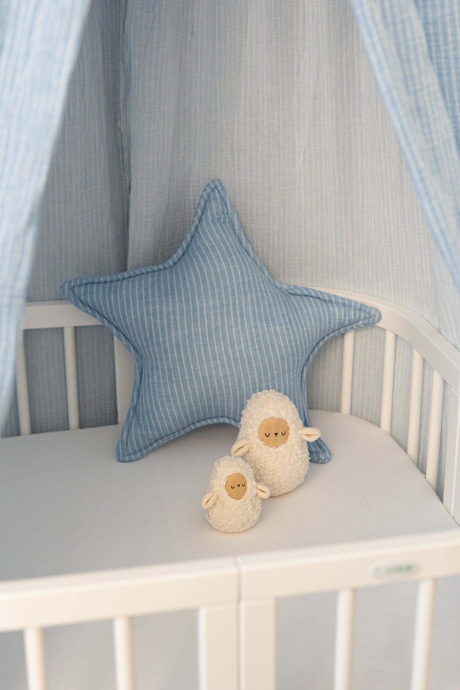 Add a gentle touch of whimsy to your child’s room with our Sky Blue Stripes Stars Pillow. Featuring a soft star shape and made from breathable muslin cotton in a classic blue-and-white stripe, this decorative pillow brings both comfort and charm to any nursery, toddler bed, or play corner. Perfect for cuddling, relaxing, or styling shelves and beds, it’s a sweet accessory that blends beautifully with coastal, boho or Scandinavian interiors. Product details: • Shape: Star • Size: approx. 40 × 40 cm • Material: 100% cotton muslin (OEKO-TEX® certified) • Color: Soft blue with white stripes • Filling: Hypoallergenic polyester wadding • Washing: Machine washable at 30°C (gentle cycle) • Preparation time: 2–3 business days • Handmade with care in the Netherlands by Matuu Perfect for: • Nursery decoration • Toddler bed or crib styling • Playroom or reading nook decor • Baby shower or birthday gift