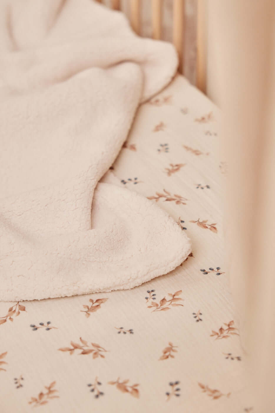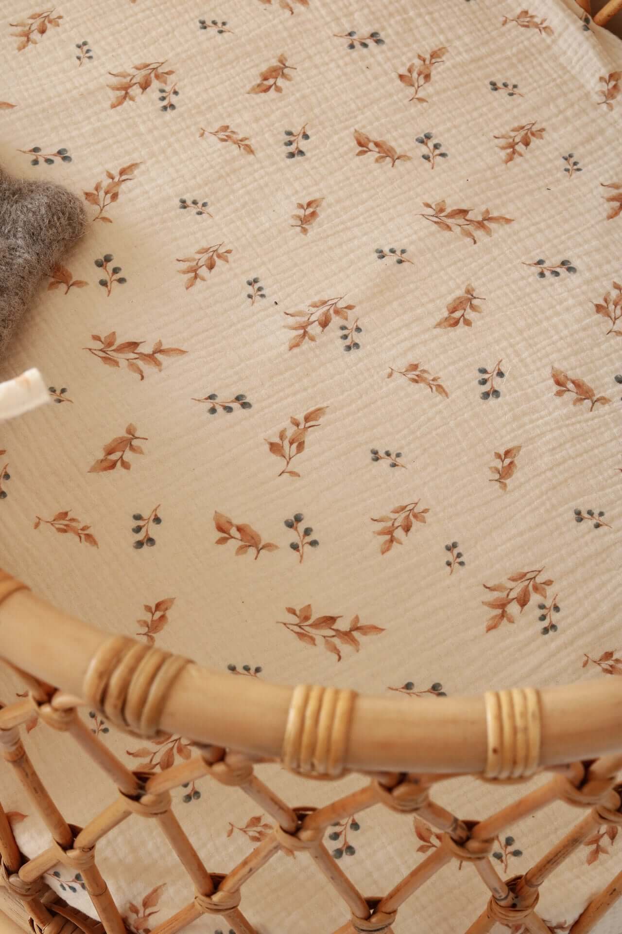 Add a natural and cozy touch to your nursery with our Small Leaves fitted sheet. Made from soft and breathable cotton muslin, it features a delicate pattern of brown leaves with tiny blue berries on beige branches — a calm, nature-inspired design that brings warmth and harmony to any baby room. The elasticated edges ensure a snug fit and keep the sheet perfectly in place, offering your little one a soft and comfortable surface to rest or play on. Available in multiple sizes to suit cribs, toddler beds, or changing baskets.   Product details:  • Fabric: 100% cotton muslin (double gauze) — soft and breathable • Pattern: Brown leaves and blue berries on beige background • Sizes: Available from crib to single bed • Fit: Elasticated edges for a secure fit • Care: Machine wash at 40°C • Preparation time: 2–3 business days • Handmade with care in the Netherlands by Matuu   Perfect for:  • Crib or toddler bed — ideal for babies and young children • Neutral and nature-inspired nursery styling • Matching with Matuu bedding, canopies, pillows, and décor • A thoughtful handmade gift for new parents or baby showers
