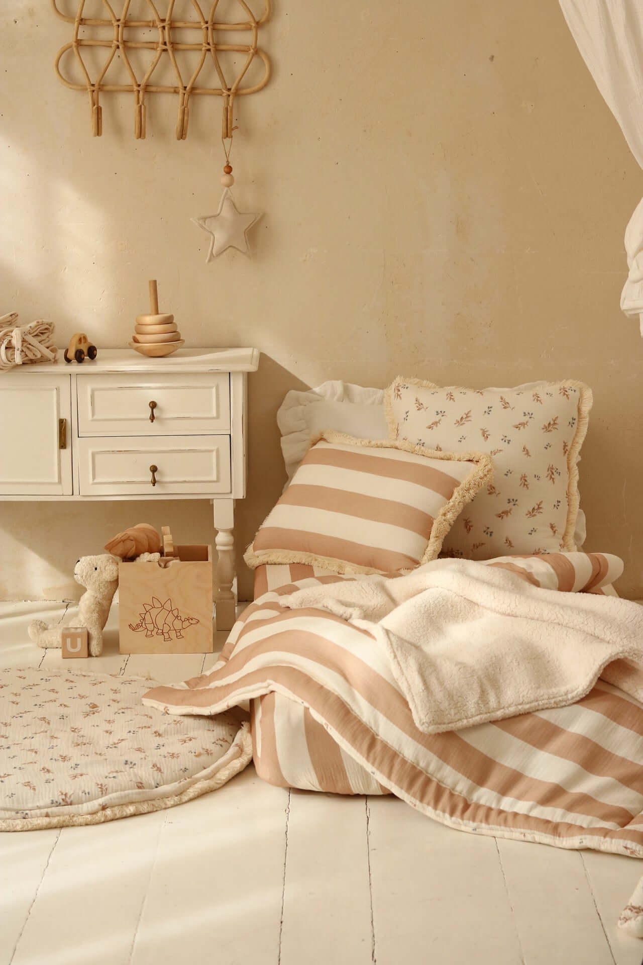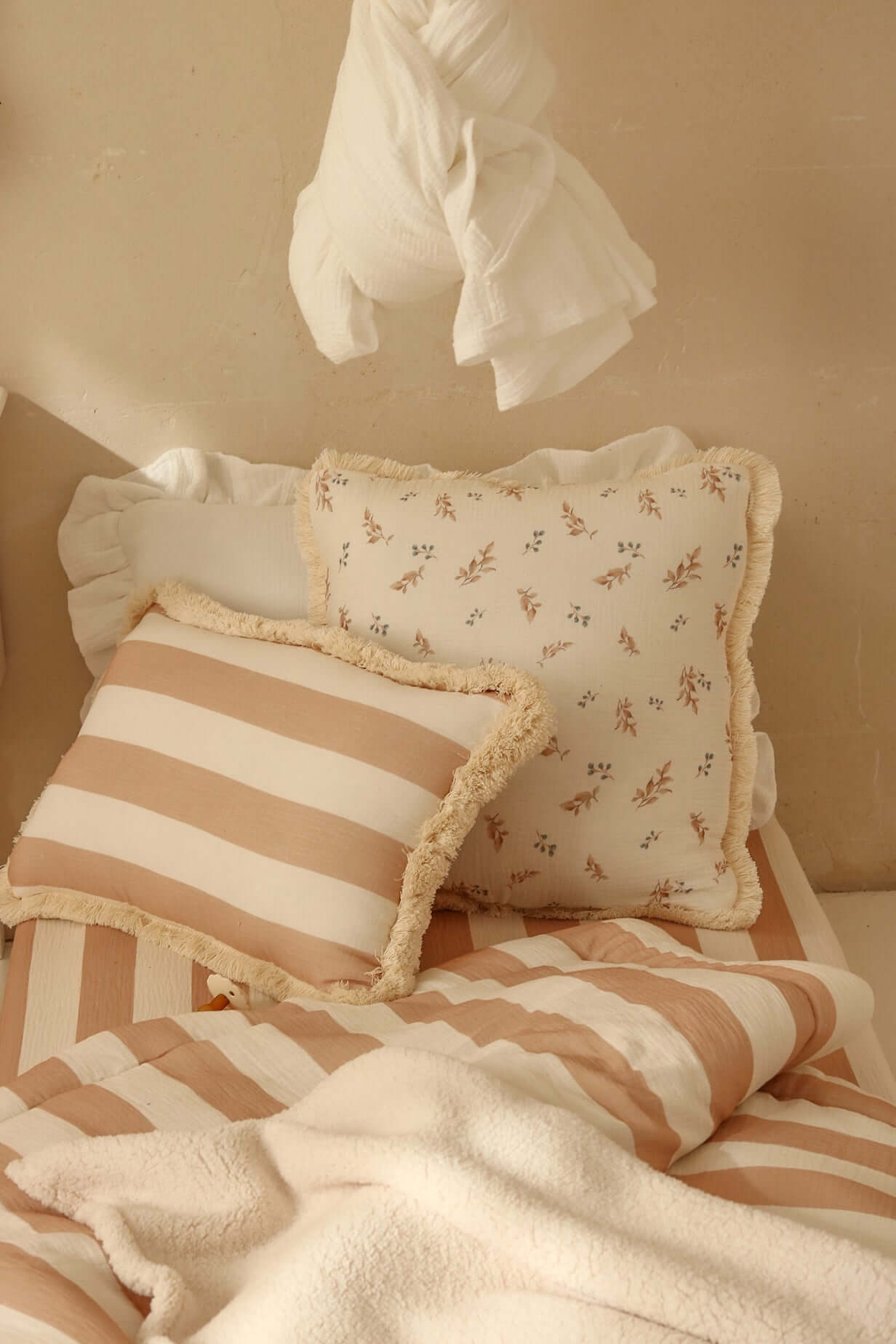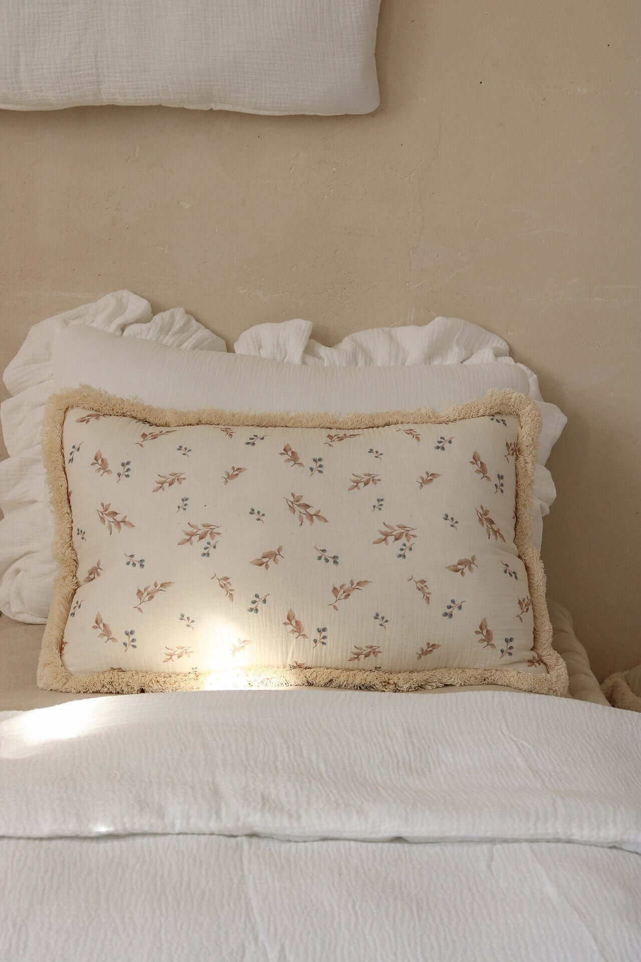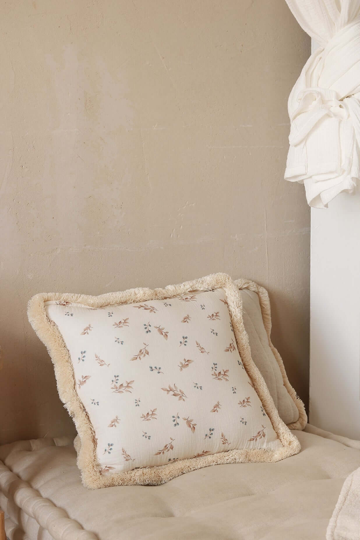 Gorgeous,small leaves muslin pillow finished with cream fringes in 2 shapes – Square 40×40 cm – Rectangle 35×60 cm You can combine different pillows to discover better results. Washing instruction:Machine wash in 40 degrees, dry flat Processing time: 1-3 work days