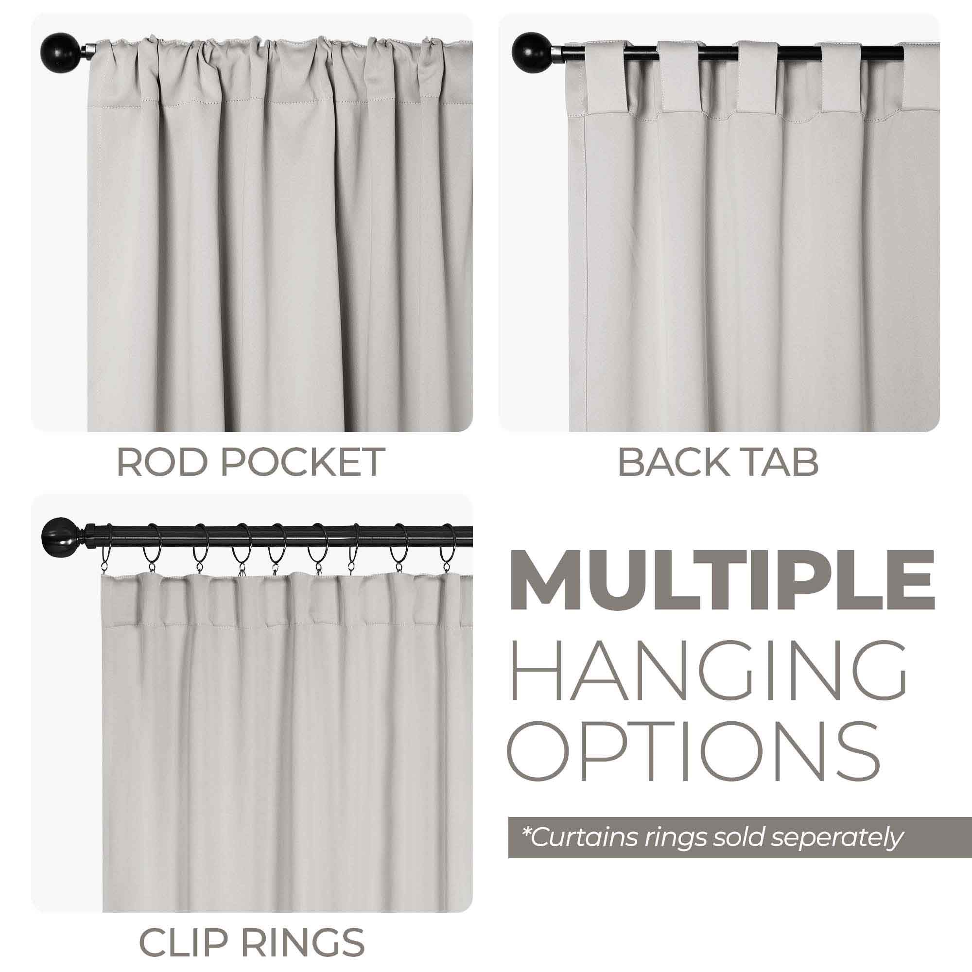 - Multiple hanging options including rod pocket, back tab, and clip rings (clip rings sold separately)