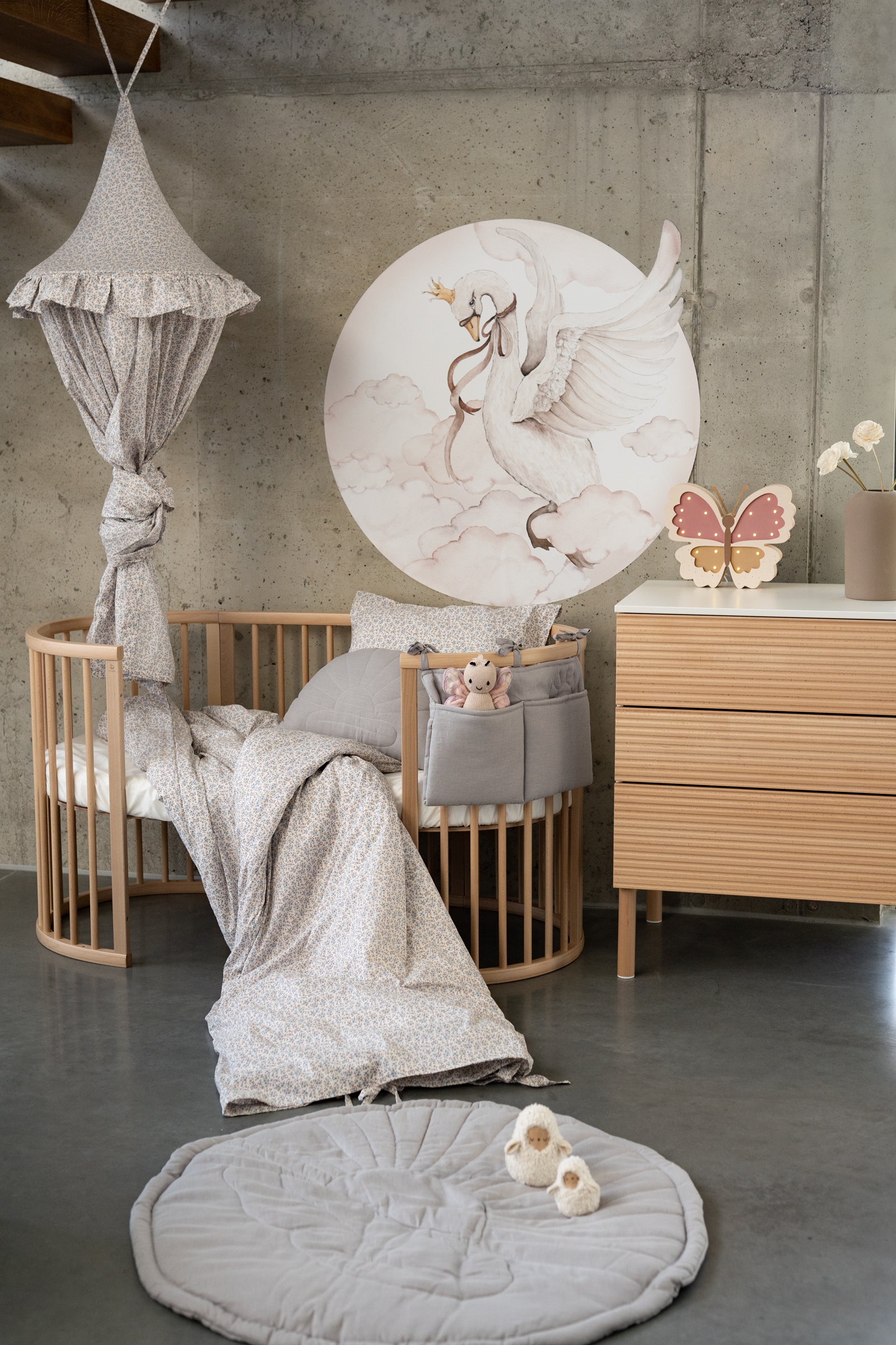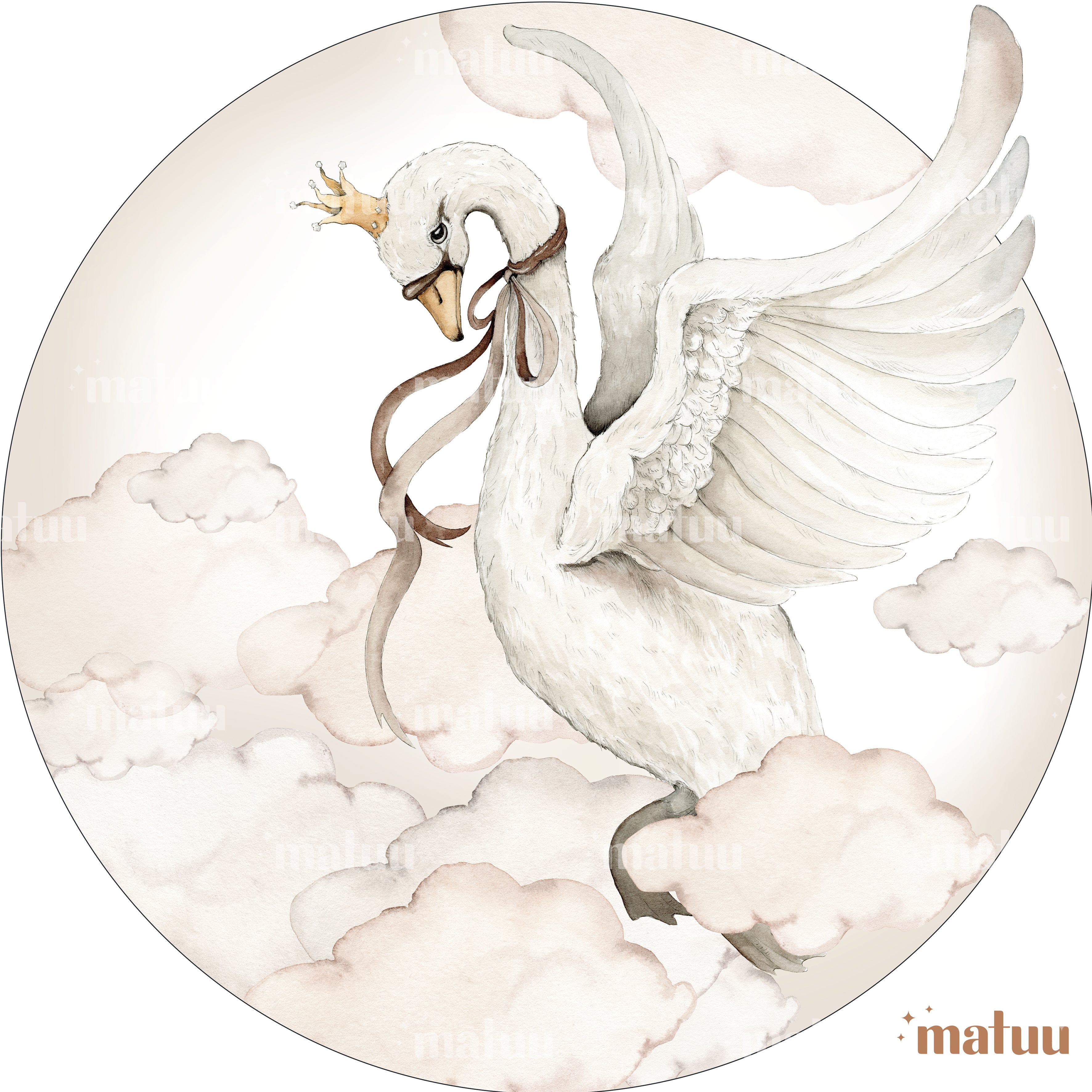 Turn your childβs room into a fairytale with the Swan Princess Wall Sticker β a majestic white swan soaring through the clouds, wearing a golden crown and a soft flowing ribbon. This poetic and dreamy round wall decal brings a serene, magical touch to any nursery, toddler room or soft-themed interior. Printed on eco-friendly, PVC-free matte vinyl, itβs removable, safe for children, and easy to apply without leaving marks. A beautiful centerpiece above a crib, reading nook, or bed β perfect for imaginative little dreamers. Material Matte, self-adhesive PVC (95 ΞΌm) Washable and fade-resistant EN 13501-1 B-s2-d0 fire safety certified Safe for childrenβs spaces Available sizes Round Γ 100 cm Round Γ 120 cm Application Peel & stick β no tools or glue needed For smooth, clean walls or furniture Full instructions: Processing time 5β10 business days * Please note: Our wall stickers are printed to order and are therefore non-returnable, unless there is a defect or a mistake in printing. If you experience any issue with your order, please contact us and we will be happy to help. Perfect for: Fairytale or princess-themed nurseries Cloud or dreamy bedroom decor Gender-neutral magical spaces Scandinavian, boho or romantic interiors Baby shower or birthday gifts