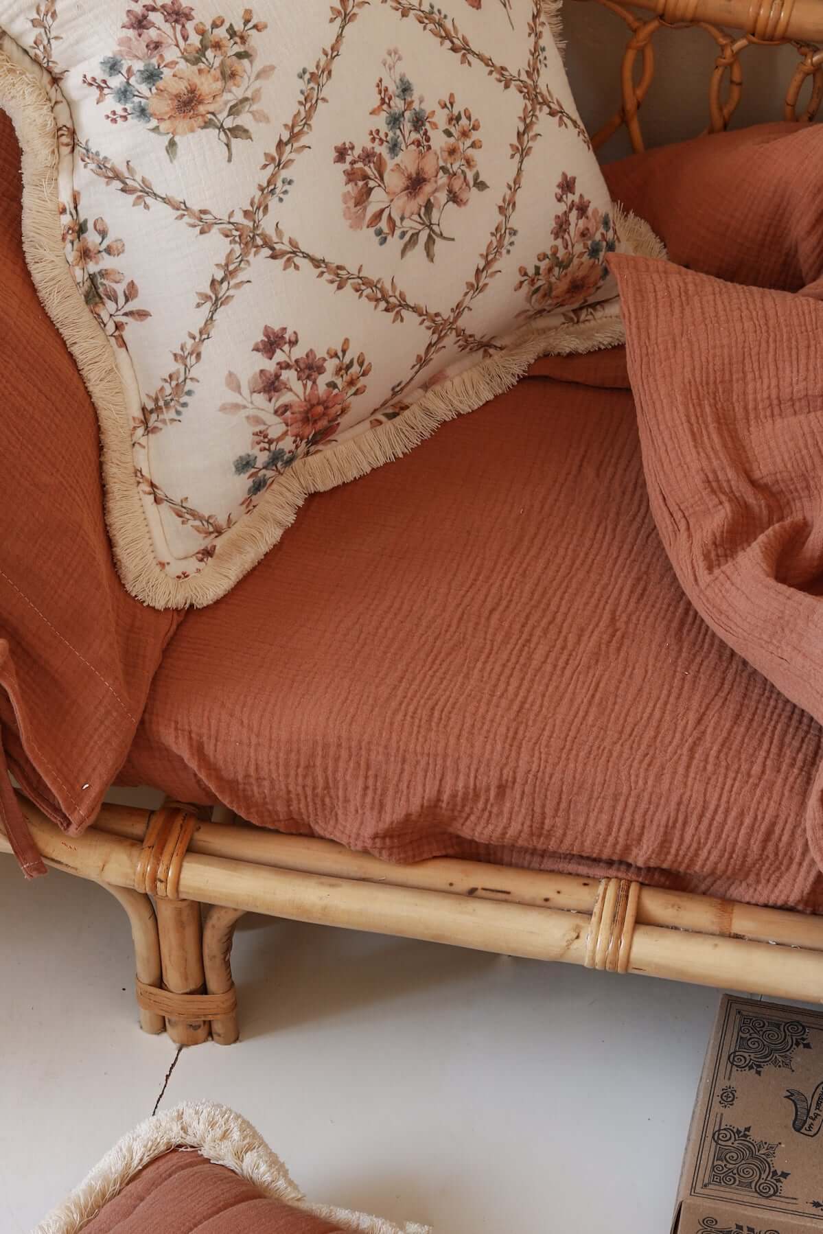 Add warmth and softness to your nursery with our Sweet Peach fitted sheet. Made from soft and breathable cotton muslin, it features a beautiful warm peach tone — gentle, cozy, and full of natural charm. Perfect for creating a calm and inviting space for your little one. The elasticated edges ensure a snug fit and keep the sheet securely in place, offering your baby a soft, breathable surface to rest and play on. Available in multiple sizes to fit cribs, toddler beds, or changing baskets. Product details: • Fabric: 100% cotton muslin (double gauze) — soft and breathable • Color: Warm peach • Sizes: Available from crib to single bed • Fit: Elasticated edges for a secure fit • Care: Machine wash at 40°C • Preparation time: 2–3 business days • Handmade with care in the Netherlands by Matuu Perfect for: • Crib or toddler bed — ideal for babies and young children • Warm, cozy, and gender-neutral nursery styling • Matching with Matuu bedding, canopies, pillows, and décor • A sweet handmade gift for new parents or baby showers