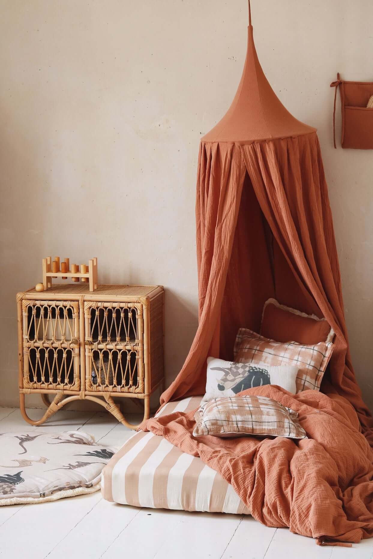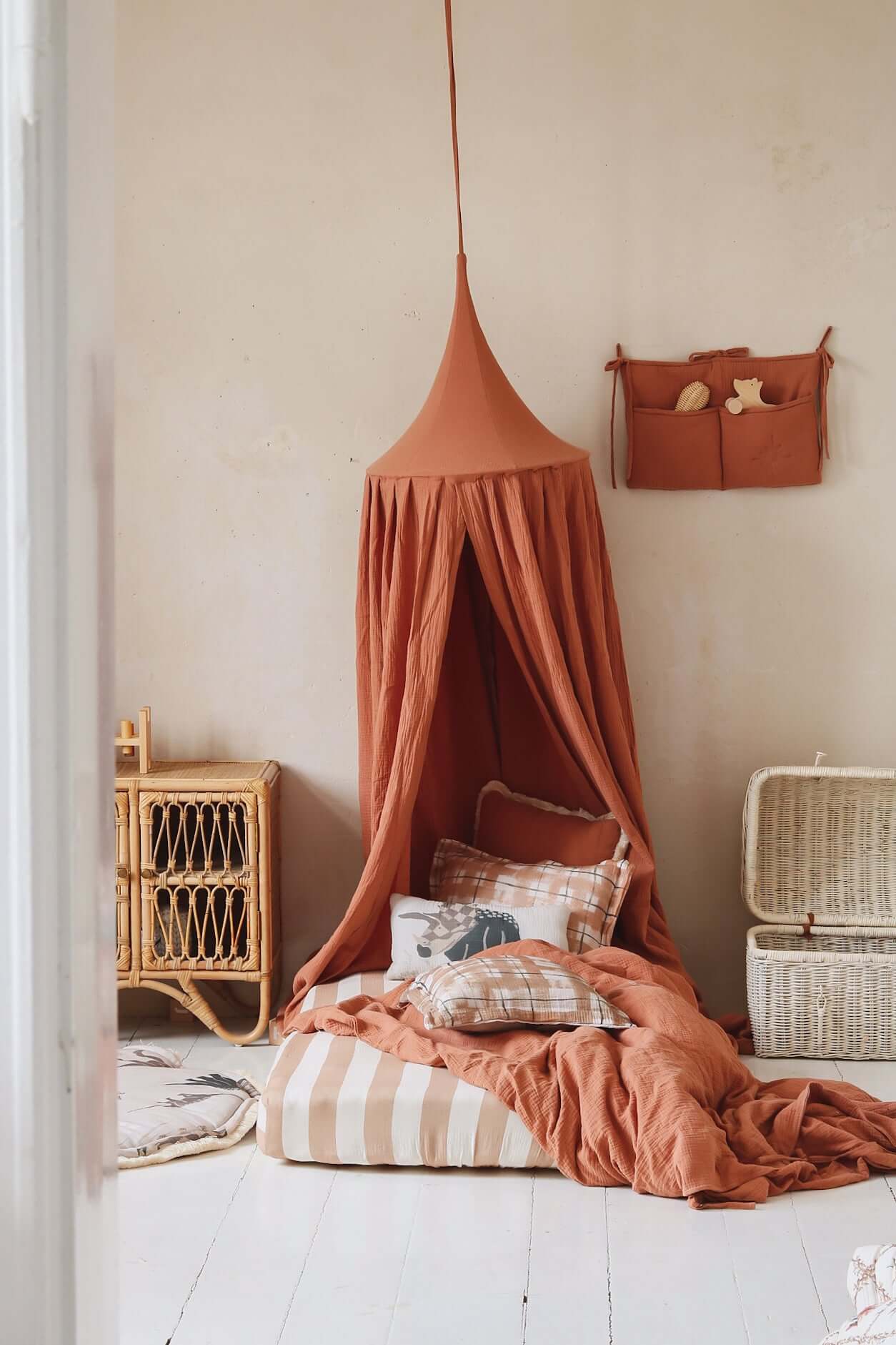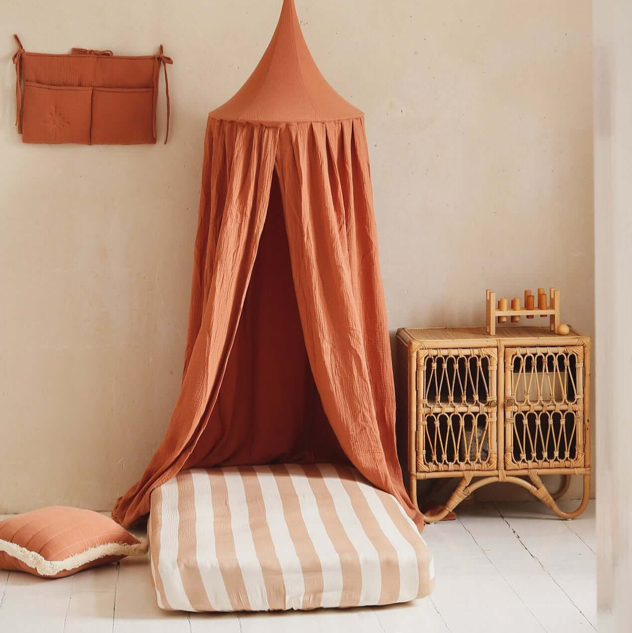 Wrap your baby’s room in warmth and softness with our Sweet Peach muslin canopy – handcrafted from breathable, lightweight double gauze cotton in a gentle peach tone. The fabric’s airy texture softly diffuses light, creating a soothing, cozy space for rest, reading, or quiet play. Whether hung over a crib, toddler bed, or a cozy play corner, the Sweet Peach canopy adds a calm and charming touch to any interior. Its soft tone works beautifully in boho, minimal or gender-neutral nurseries – adding warmth without overwhelming the space. Designed with care and simplicity in mind, this canopy features a hidden metal hoop, long cotton ties for easy hanging, and an interior loop – perfect for suspending a mobile, fairy lights, or a pendant. Product Details • Fabric: 100% cotton muslin – OEKO-TEX® certified • Color: Warm peach • Height: approx. 235 cm (fabric) + 60 cm cotton hanging ties • Hoop diameter: 50 cm (metal ring included, hidden inside) • Mounting: Two fabric straps – fits any ceiling hook • Interior loop: For hanging a mobile or pendant • Care: Remove hoop before washing. Machine wash at 30°C (gentle), air dry • Preparation time: 2–3 business days • Handmade in the Netherlands by Matuu Perfect for: • Crib or toddler bed canopy • Boho or minimalist nursery decor • Warm-toned baby rooms • Soft reading/play corner • Thoughtful handmade baby gift