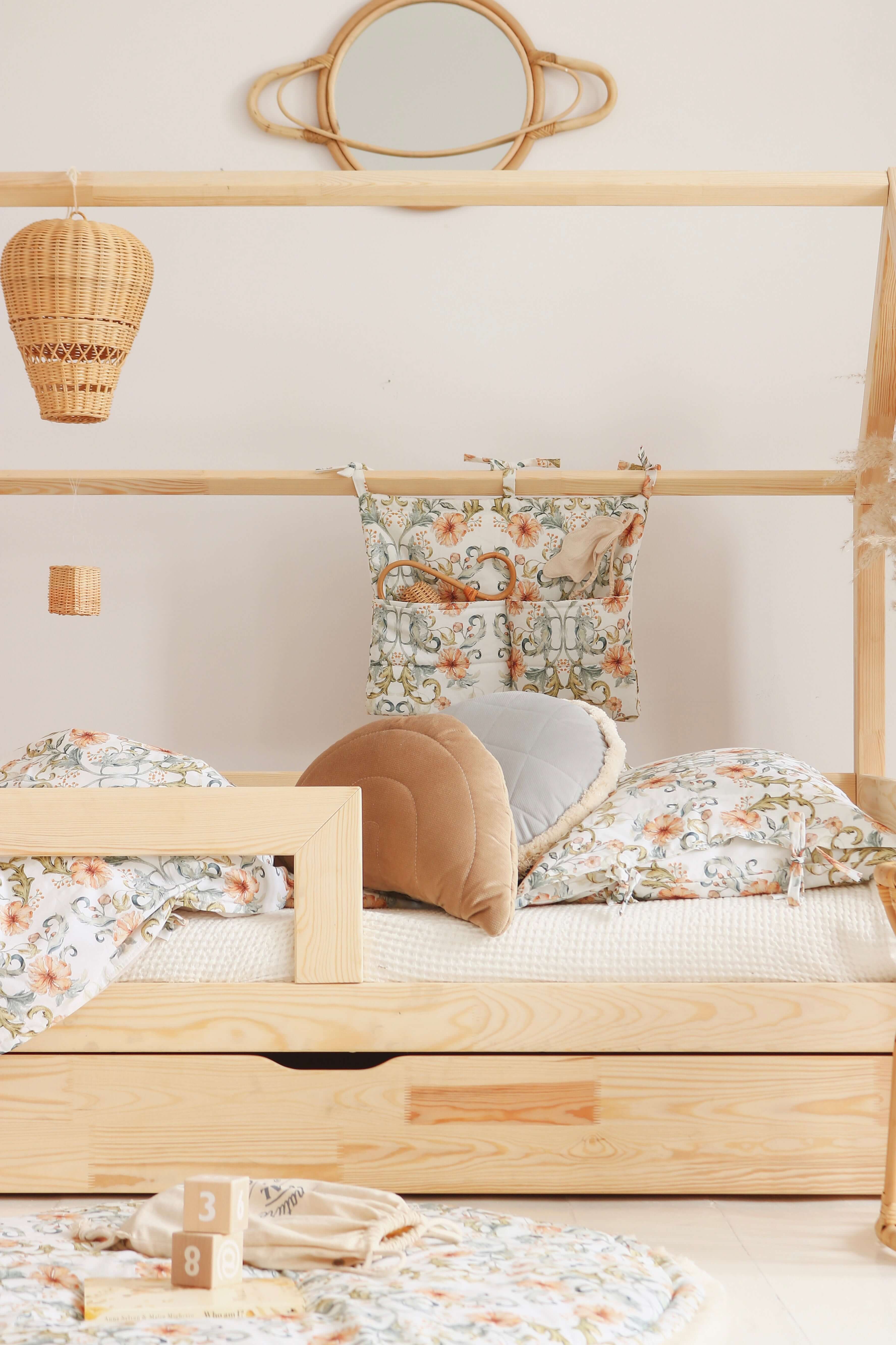 With your baby at home, you want to have everything at hand! The bed/box organizer is not only practical but also eye-catching. Easy to attach to the playpen or crib with straps / cords. Place a pacifier, a cuddly toy etc., “everything” you need :)Dimensions: 50 x 32 cmFabric: carmel cotton muslin fabric Filled with light and soft filling.Can be washed at 40 degreesDelivery time: 1-3 business daysDesigned, made and quilted by hand, by me – Roksana (heart of Matuu) in Amsterdam, the Netherlands There is a possibility to make a bed pocket in other size, let me know if you are interested 😉
