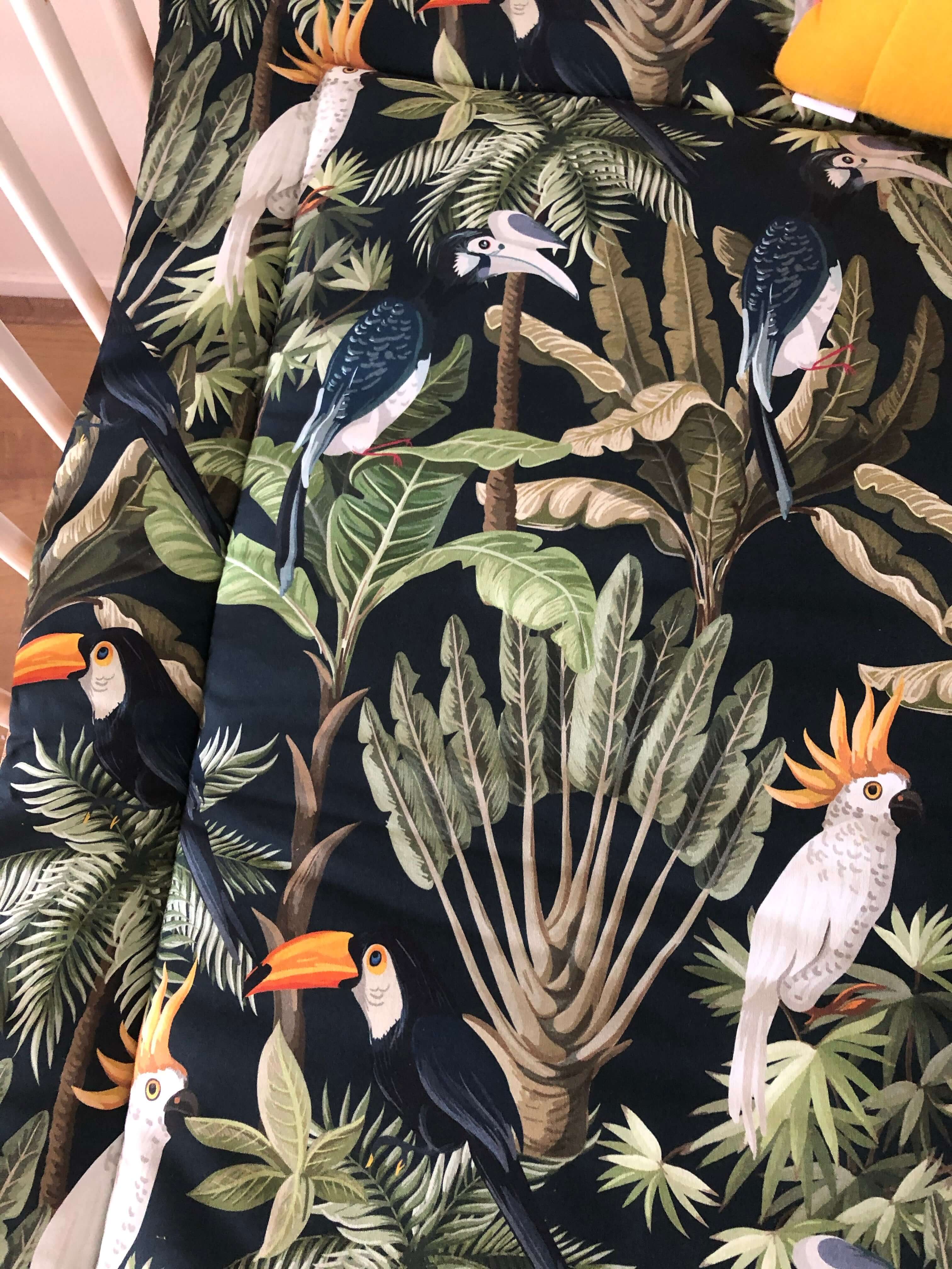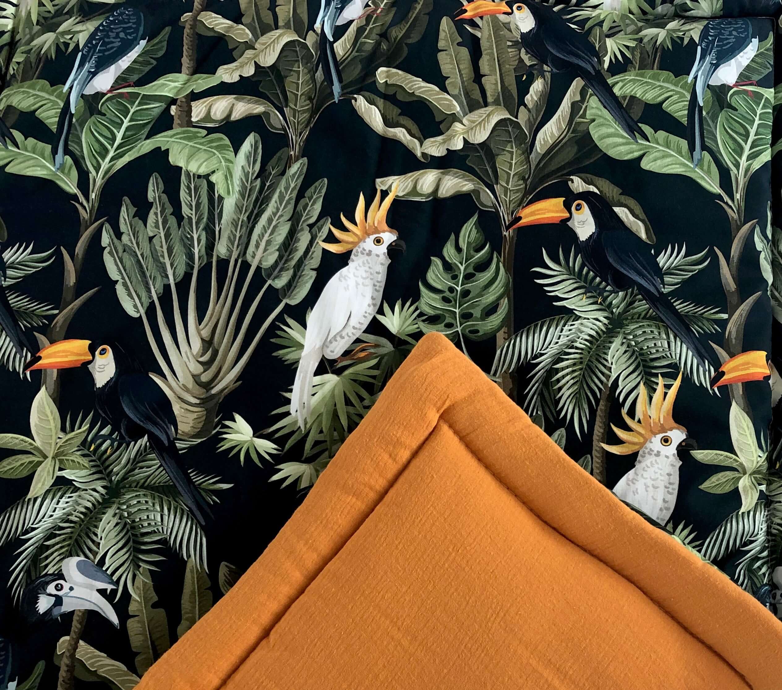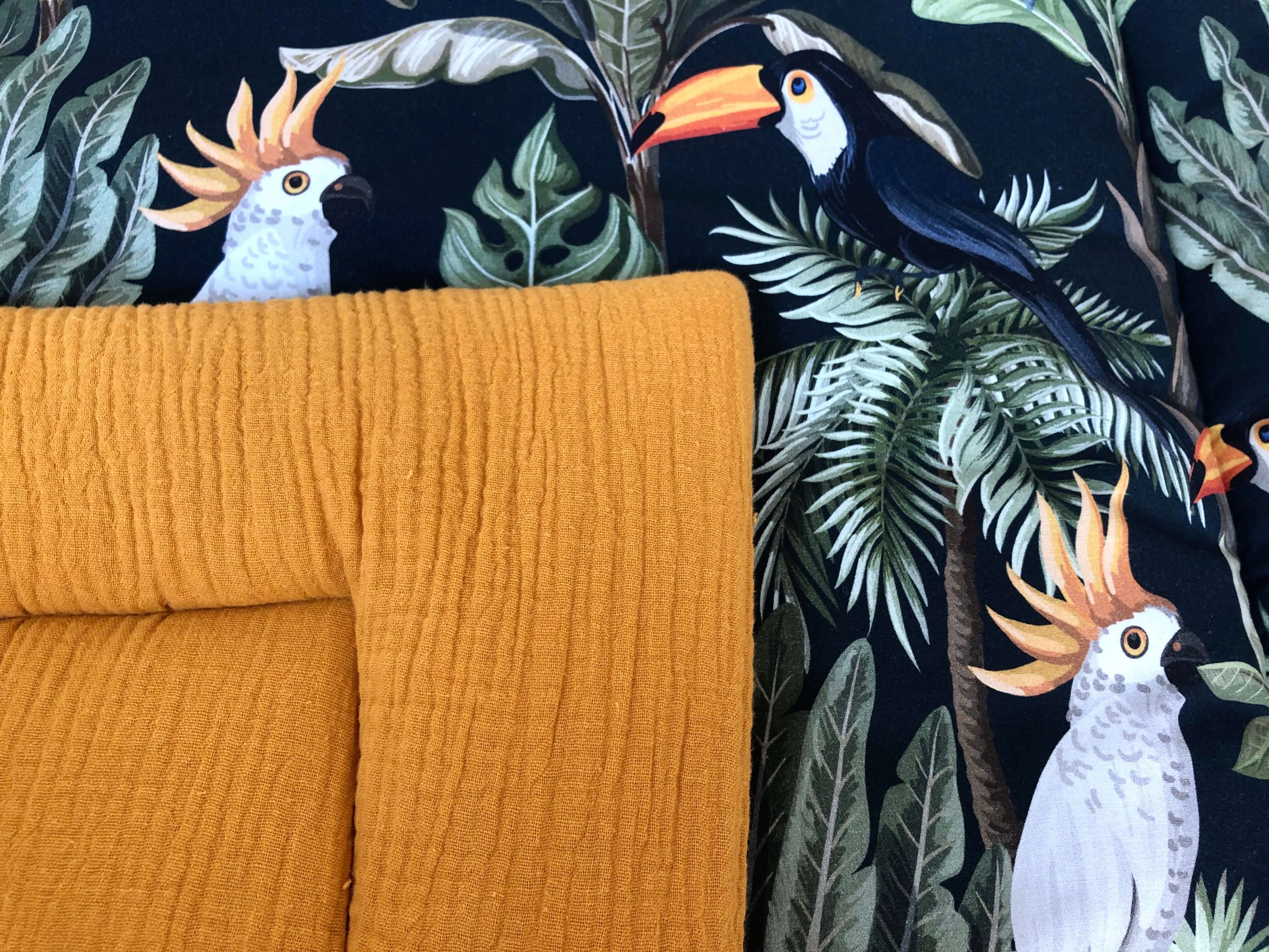 Are you looking for a fun box rug for your box or maybe baby quilt blanket or fun play mat? We have the product that suits all these cases. Simply choose one of the many box rugs (baby blankets) that we have to offer. Whether you are looking for a square box rug or rug with a beautiful print on it, you will find it all in here. A beautiful thick soft quilt or crib blanket with the tropical print ( jungle and parrots) on one side and mustard muslin (mousseline fabric) on the other. It will be perfect also as a box rug, making the child’s little home very comfy. Unique design will please the eye and make your nursery feel more… yours.Filled: 100% polyester. This makes the quilt wonderfully fluffy thick / soft. And has ANTIALLERGICAL propertiesFabrics are made from 100% cottonMachine washable at 30 °C.There is a possibility to make a mat in other size, let me know if you are interested ;)(processing time up to 2 weeks) Designed and made in Amsterdam, the Netherlands.