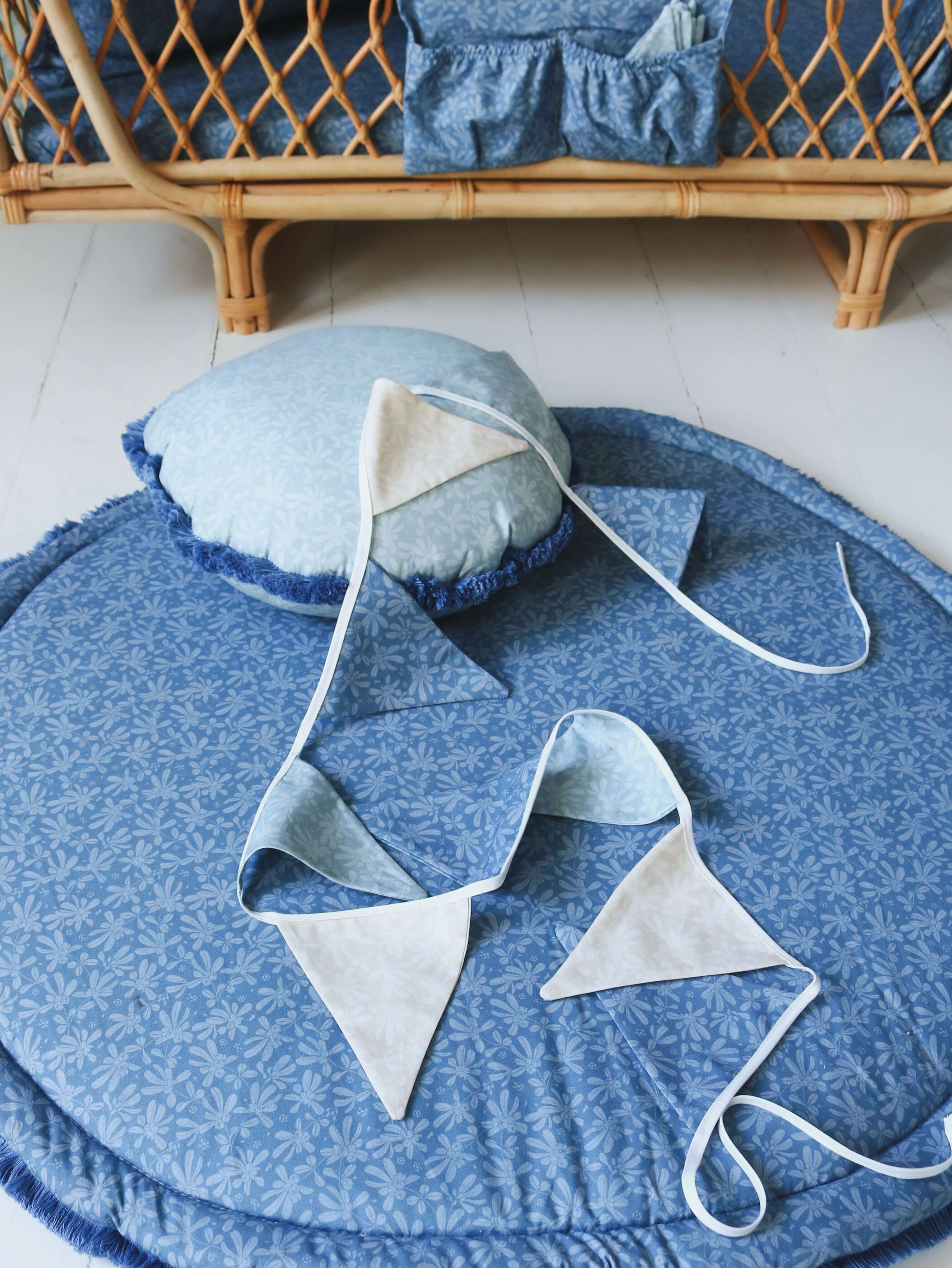 Bring calm, coastal charm to your childโs room with ourย Trio Blue Barberries garland. Made from 100% cotton fabrics, this garland combines navy blue, Ecru Barberries, and Blue Barberries prints โ a beautiful mix of soft, natural tones that create a peaceful and timeless look. Perfect for neutral, boho or seaside-inspired interiors. Each flag is double-sided and measures 20.5 cm high, while the full garland includes 9 flags and is approximately 250 cm long. Finished with cotton ribbons on both ends for easy hanging โ perfect for nursery walls, canopies, or play areas, as well as baby showers and birthdays. Product details Material: 100% cotton Colors & Prints: Navy blue, Ecru Barberries, Blue Barberries Length: approx. 250 cm Flags: 9 double-sided flags, 20.5 cm each Trim: Cotton binding Care: Machine wash at 40ยฐC Made in: The Netherlands Delivery time: 1โ3 business days Perfect for Nursery, toddler or kidsโ room decoration Boho, coastal or vintage interiors Baby showers, birthdays and playrooms A beautiful handmade gift ย
