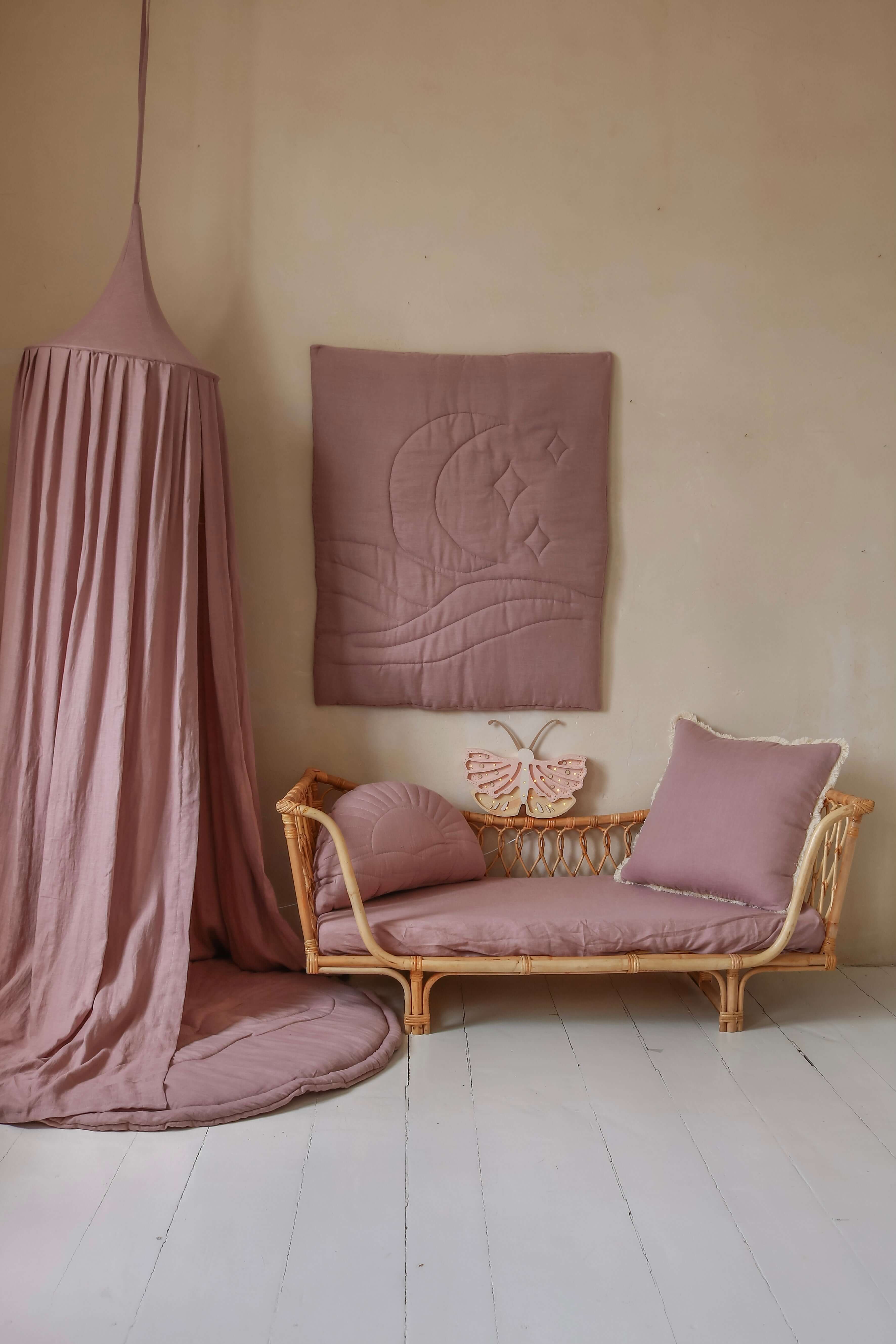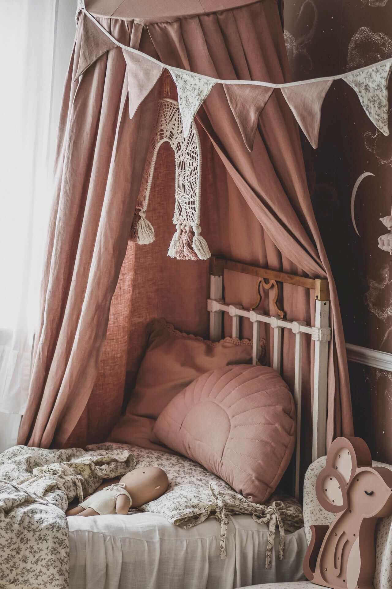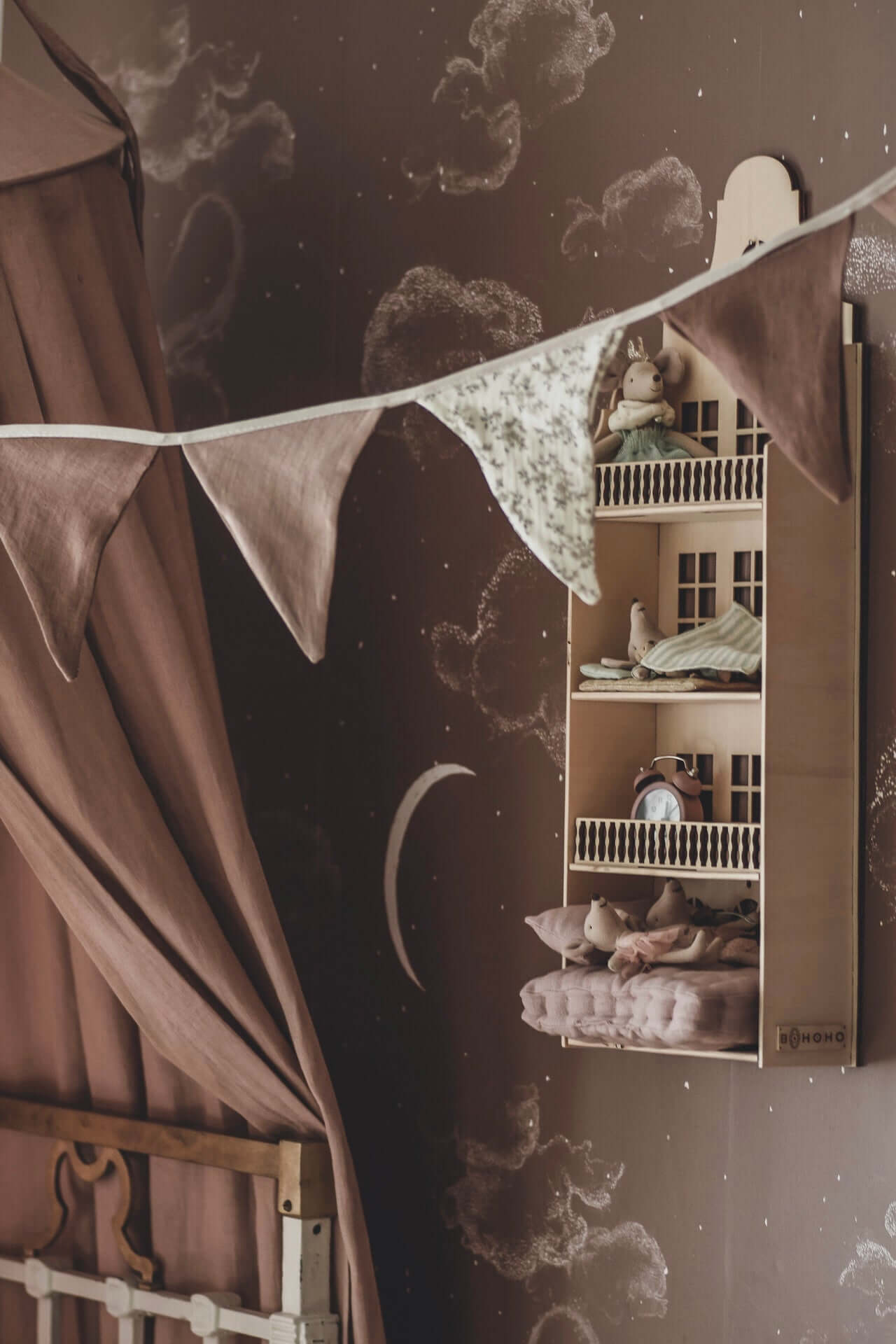 Add warmth and vintage charm to your child’s room with our Trio Linen Garland. This beautiful garland combines two linen fabrics in brown and retro pink tones with a muslin fabric featuring a delicate neutral floral print. The result? A perfectly balanced mix of texture and color that brings a cozy, natural look to any space. Each flag is double-sided and measures 20.5 cm high. The garland features 9 flags in total, is approximately 250 cm long, and comes with cotton ribbons at both ends for easy hanging. Perfect for nurseries, kids’ rooms, or play areas, and a lovely addition to birthday parties, baby showers, or seasonal decorations. Product details Materials: Linen and muslin (cotton) fabrics Colors: Retro pink, retro neutral floral, and brown Length: approx. 250 cm Flags: 9 double-sided flags, 20.5 cm each Trim: Cotton binding Care: Machine wash at 40°C Made in: The Netherlands Delivery time: 1–3 business days Perfect for Nursery or kids’ room decoration Boho, vintage or neutral interiors Baby showers and birthdays A beautiful handmade gift