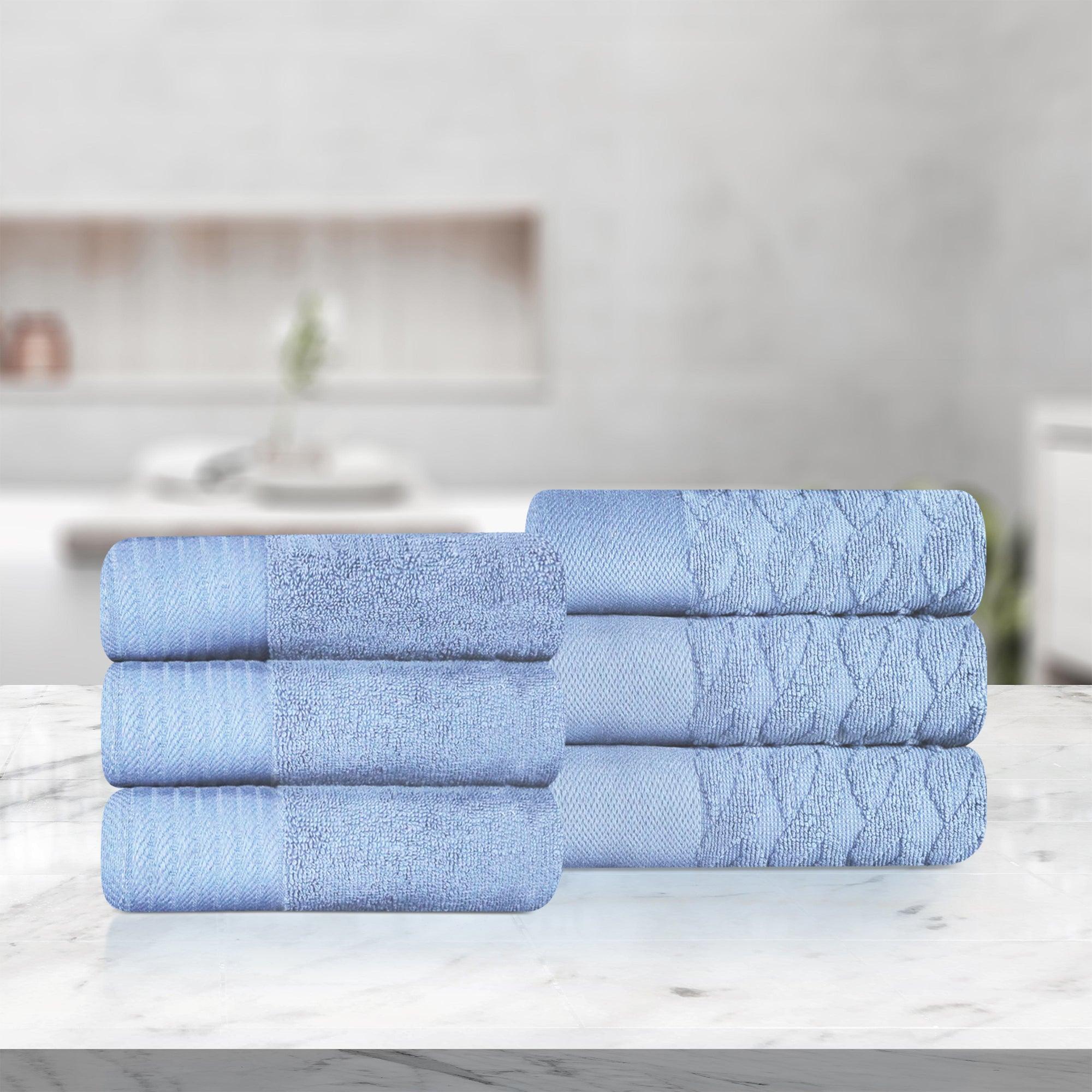 This is a set of cotton hand towels with a unique textured – border design. The towels have a plush, looped body that is highly absorbent, perfect for personal hygiene needs. They come in a variety of attractive colors, adding both functionality and aesthetic appeal to your bathroom.