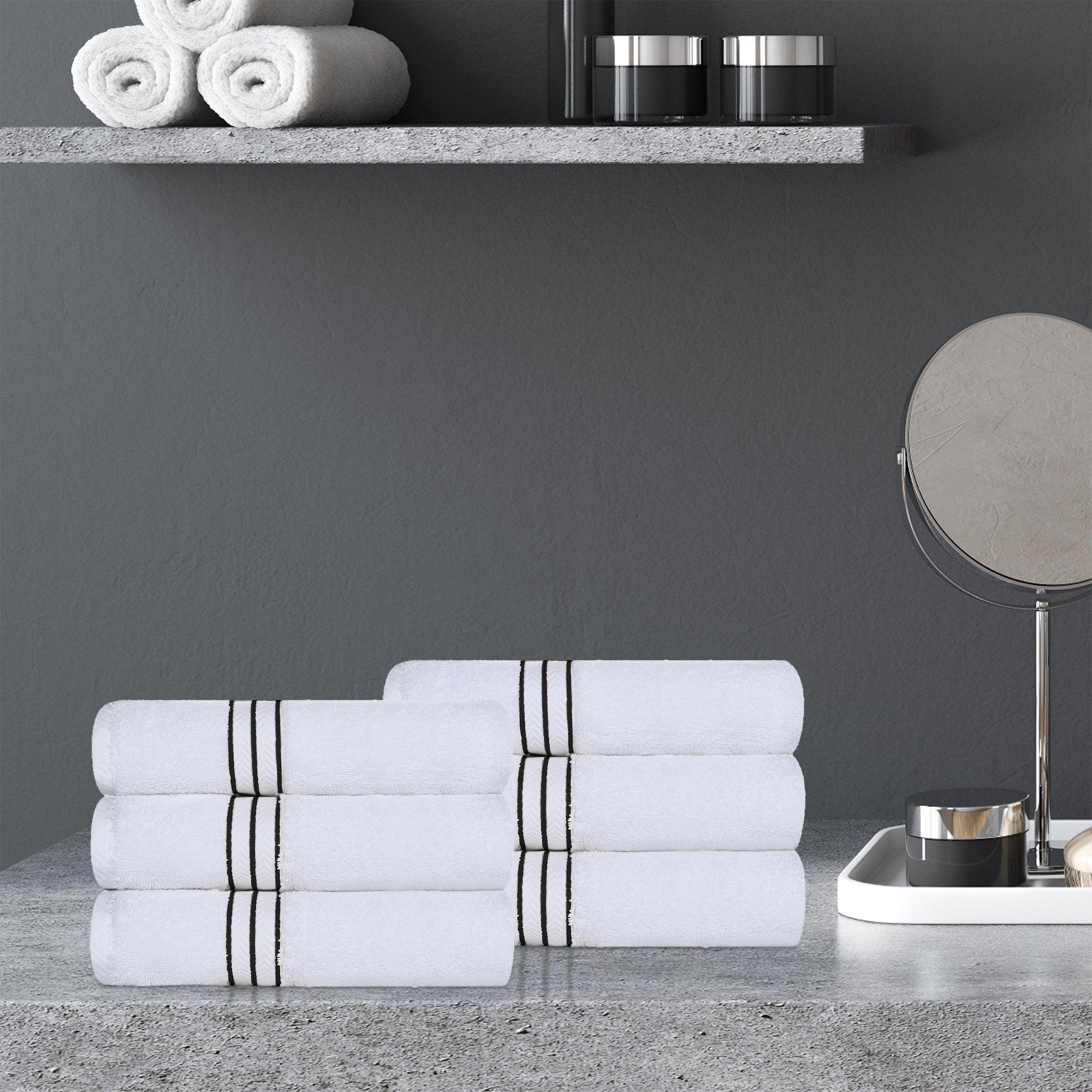 - Aesthetic cohesion with a uniform white base and colored stripes that can complement bathroom decor.