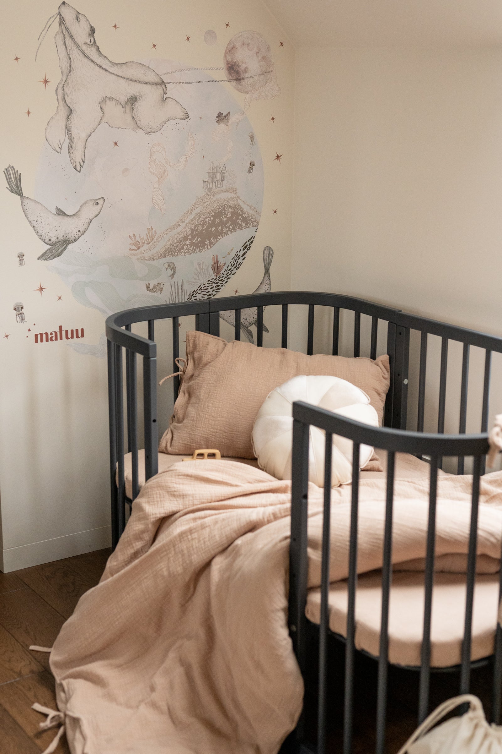 Bring calm, natural beauty into your nursery or bedroom with the Warm Beige – Linen Look Bedding Set. This handcrafted set is made from soft, breathable muslin cotton with a beautiful linen-effect texture, combining the timeless style of linen with the comfort and easy care of cotton. The warm beige shade makes it the perfect choice for neutral baby rooms, boho nurseries, Japandi or Scandinavian interiors. Its minimalist yet cozy look blends seamlessly with modern, rustic, or vintage-inspired décor. Lightweight, durable, and OEKO-TEX® certified, this bedding is safe for sensitive skin, offering comfort for babies, toddlers, kids, and even adults. Each set includes a duvet cover and a matching pillowcase, finished with soft cotton ties instead of zippers or buttons for a natural, artisanal look. Every piece is handmade in the Netherlands with love and care. Product Details Material: 100% muslin cotton – OEKO-TEX® certified Design: Warm beige with natural linen-look texture Closure: Cotton ties (no zippers or buttons) Set includes: 1 duvet cover + 1 pillowcase (all sizes) Sizes: Crib, toddler, junior, and single bed Care: Machine wash at 40 °C, gentle cycle; do not tumble dry; iron on low if needed Production time: 2–3 business days Handmade in the Netherlands by Matuu Perfect For Neutral or gender-neutral baby and kids’ rooms Japandi, Scandinavian, boho or minimalist interiors Cozy toddler and single beds Parents seeking eco-friendly, breathable, OEKO-TEX® cotton bedding A timeless baby shower or birthday gift Matching with other accessories from Matuu