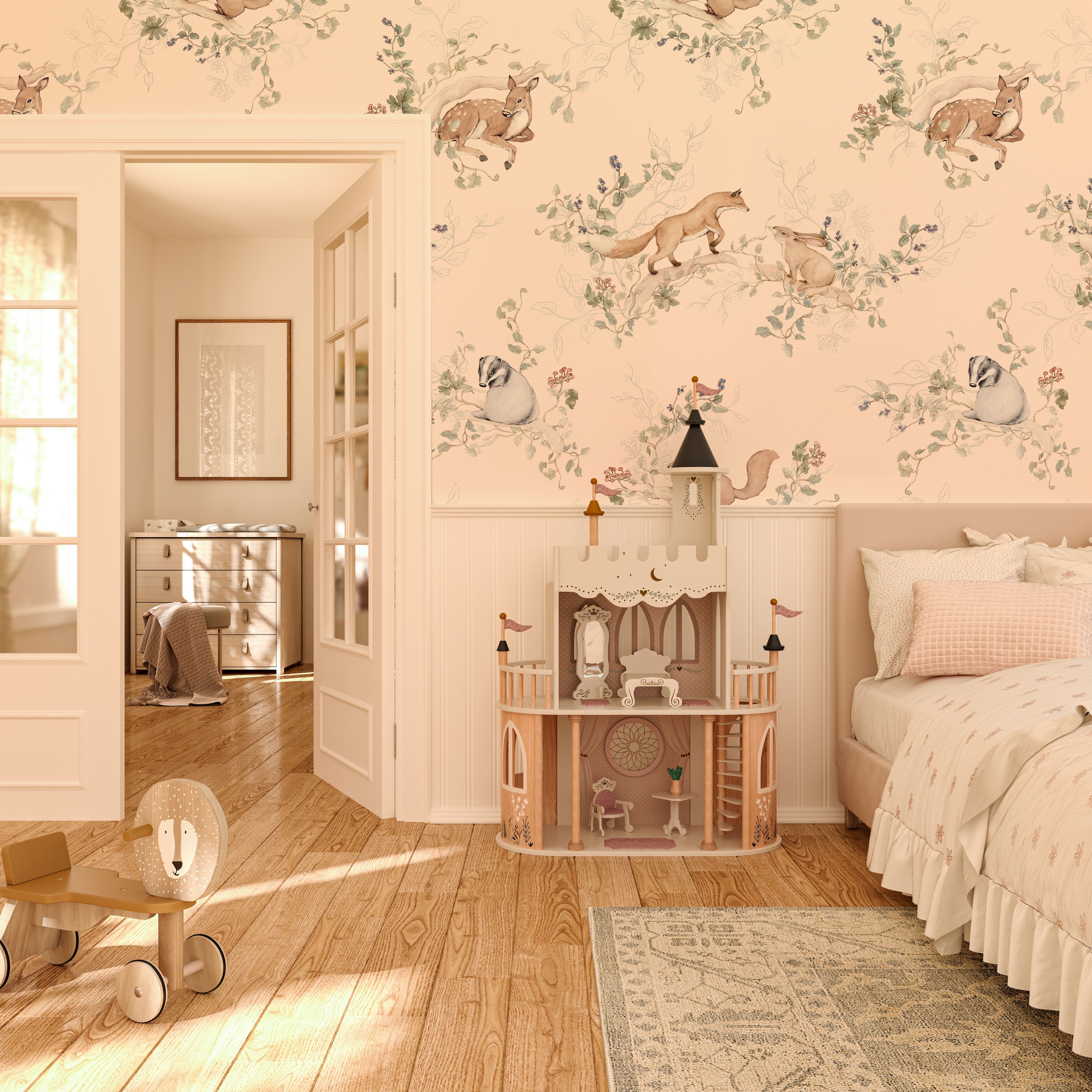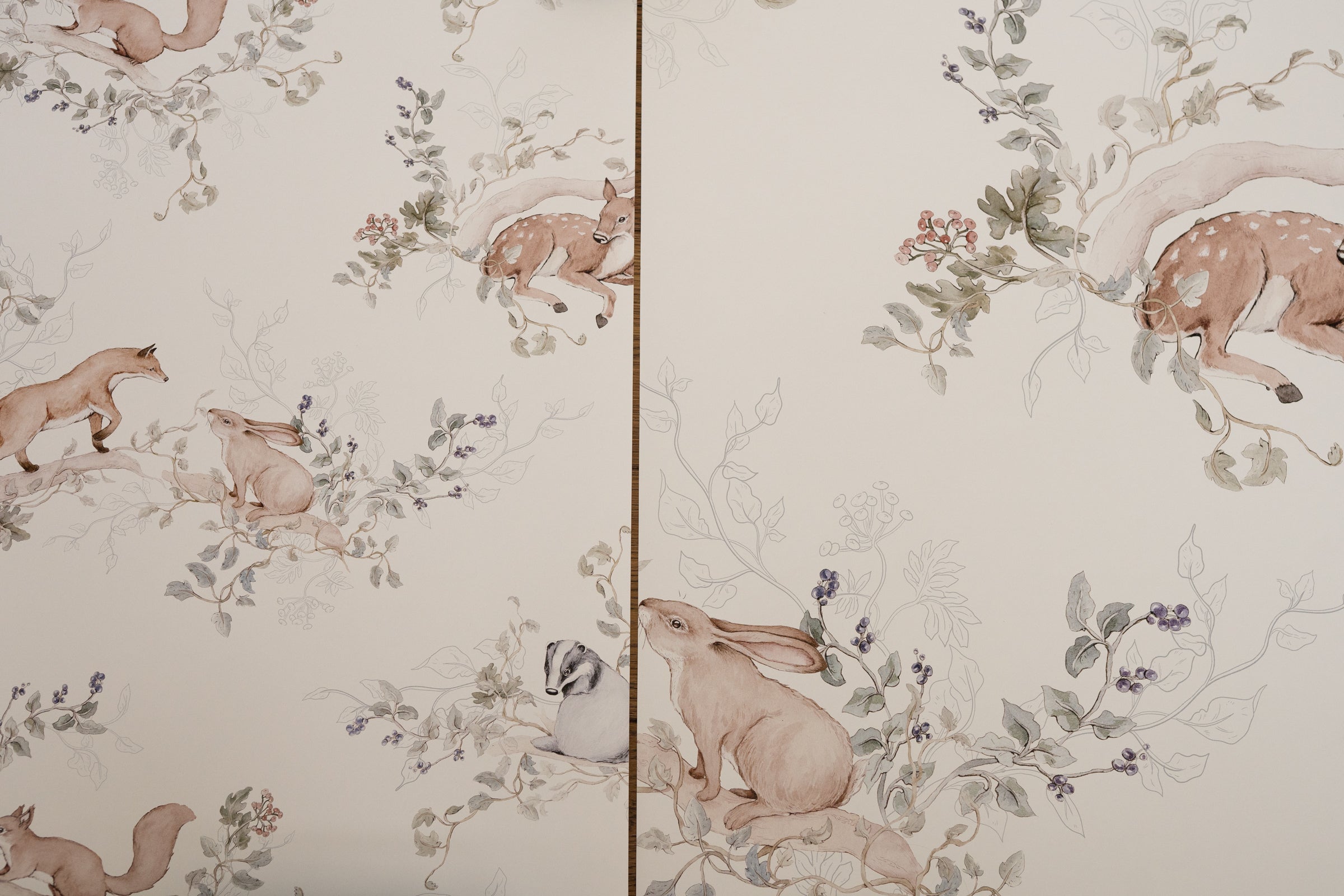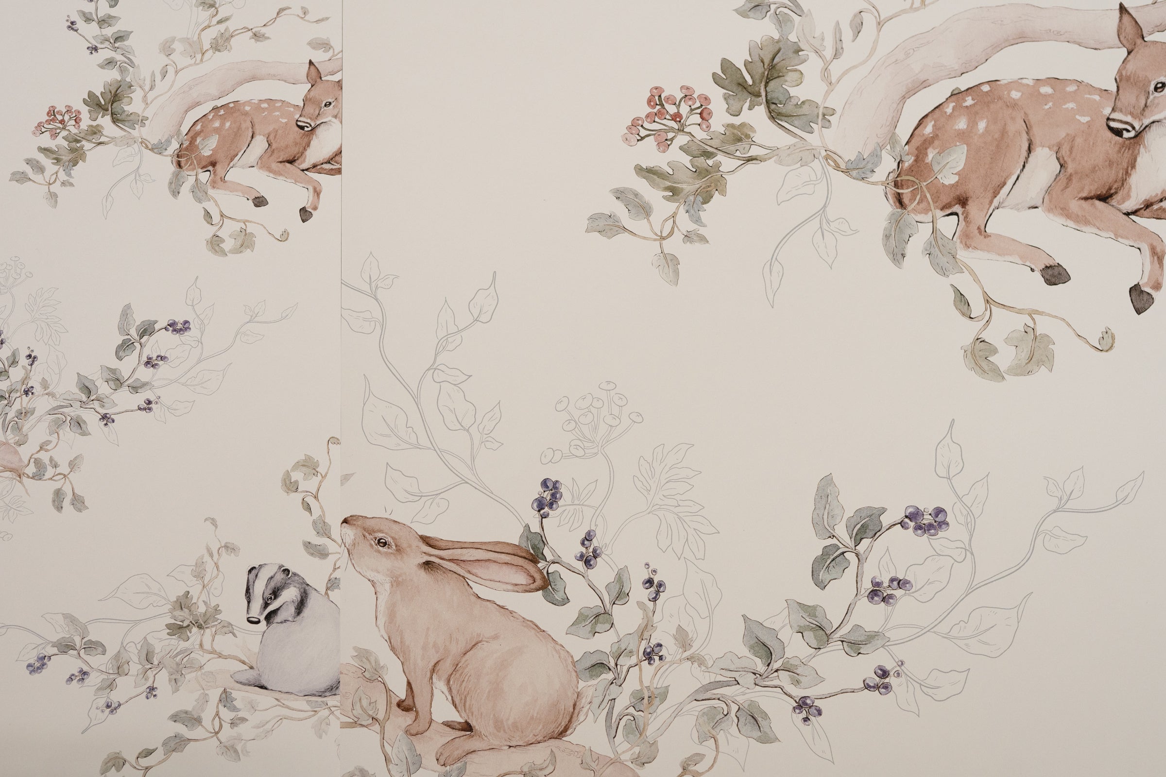 Woodland Whisper – cream forest animal wallpaper brings peaceful woodland charm to your nursery, kids’ room or any calm interior. This premium non-woven wallpaper features delicate forest animals – foxes, deer, rabbits and squirrels – beautifully hand-painted among wild berries and leafy branches, all set against a warm cream background. Designed to create a soft, storybook-inspired atmosphere, this woodland animal wallpaper adds warmth and calm to children’s rooms, nurseries and nature-themed spaces. The neutral cream tones make it a timeless and versatile choice for both modern and classic interiors. Easy to apply and printed on high-quality non-woven material – just glue the wall and smooth on the strips. A gentle forest scene for anyone who loves quiet, natural design. Product features Design: hand-painted forest animals with botanical elements Color palette: muted browns, greens, light grey, berry accents on a creamy beige background Material: high-quality non-woven (vlies) wallpaper Finish: elegant matte texture Pattern repeat: every 50 cm in the medium version and every 100 cm in the large version Printed to order: each roll is custom-made just for you Dimensions & Installation Available sizes: • 2 strips measuring 50 × 270 cm • 2 strips measuring 50 × 310 cm Coverage: 1 set covers 1 meter wall width Installation: • Paste the wall (not the wallpaper) • Use non-woven wallpaper paste • Surface must be clean, smooth, and dry • Instructions: Download the step-by-step non-woven wallpaper guide How many rolls do I need? Each set includes 2 vertical strips (50 cm wide), covering 1 meter in width. Examples: Wall width 2.3 m → order 3 sets Wall width 4 m → order 4 sets Tip: Always add 5–10 cm margin, as walls are rarely perfectly straight. Production & Delivery Production time: 1-3 business days Shipping time: 2–7 business days (Europe) Check – Double Check Please carefully inspect your wallpaper before installation. Verify colours, pattern alignment, and length immediately upon delivery. We allow a cutting tolerance of up to 1 mm per strip. If the deviation is larger, we will gladly reprint your order. *Once the wallpaper has been cut and installed, it is no longer possible to objectively determine whether any irregularity originates from production or from handling during installation. For this reason, claims raised after installation are very difficult to assess. Important Notes This wallpaper is not kept in stock – it’s printed to order. Not sure about the colour or pattern scale?We recommend ordering a sample first.