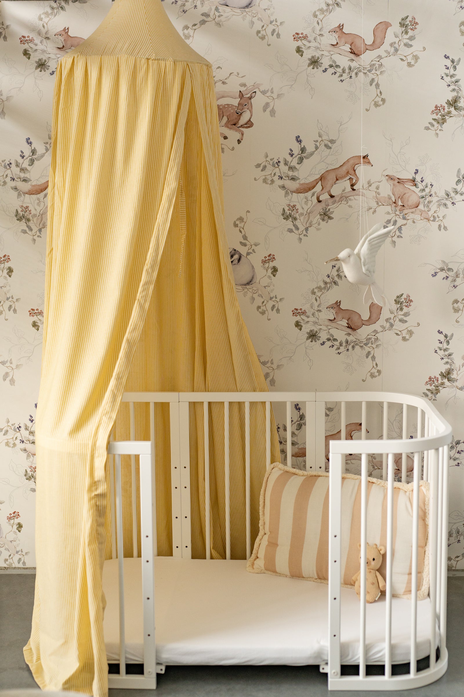 Bring a sunny, playful vibe to your child’s room with the Yellow Stripes Canopy. Made from 100% breathable cotton, this bed canopy features a cheerful yellow-and-white stripe pattern that adds both brightness and coziness to any nursery or kids’ space. Perfect above a crib, toddler bed, or as a magical play corner, it creates a dreamy atmosphere where children feel safe and inspired. Handmade in the Netherlands, the canopy is lightweight, durable, and OEKO-TEX® certified – safe for even the youngest dreamers. Its timeless stripe design makes it easy to style in boho, vintage, or Scandinavian-inspired interiors. Product details: Fabric: 100% cotton, OEKO-TEX® certified Color: Yellow and white stripes Size: Universal – suitable for crib, toddler bed, or play area Care: Machine wash at 30 °C, gentle cycle; air dry; do not tumble dry Handmade in the Netherlands by Matuu Perfect for: Baby canopy for crib or cot Play corner with a cheerful, cozy vibe Gender-neutral nursery décor Boho, Scandinavian, or vintage kids’ interiors A thoughtful baby shower or birthday gift