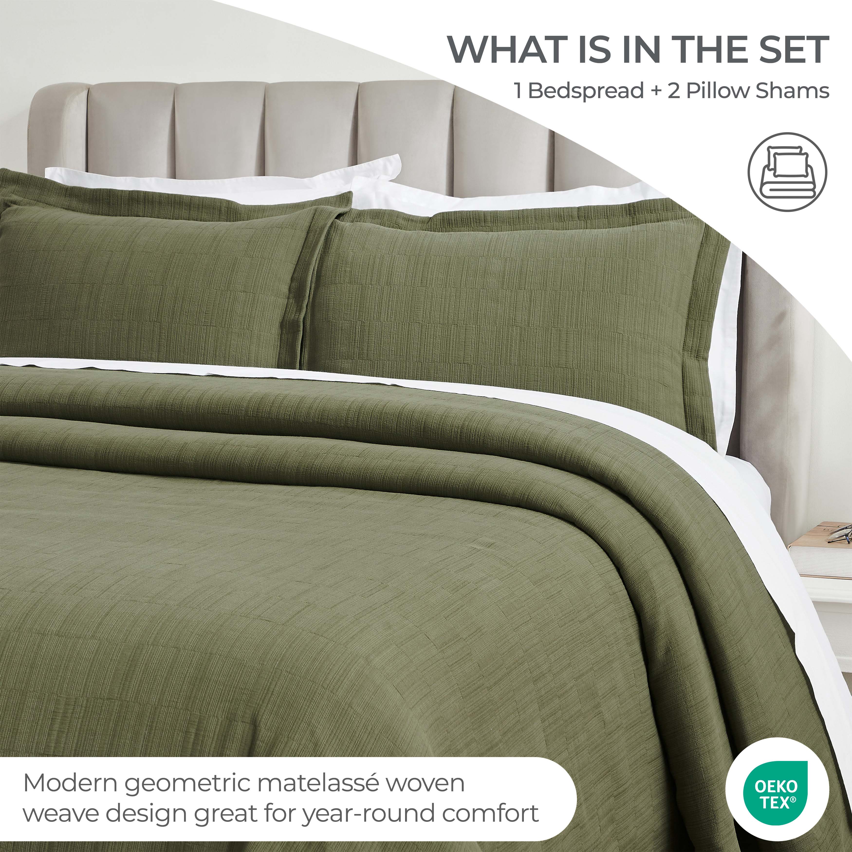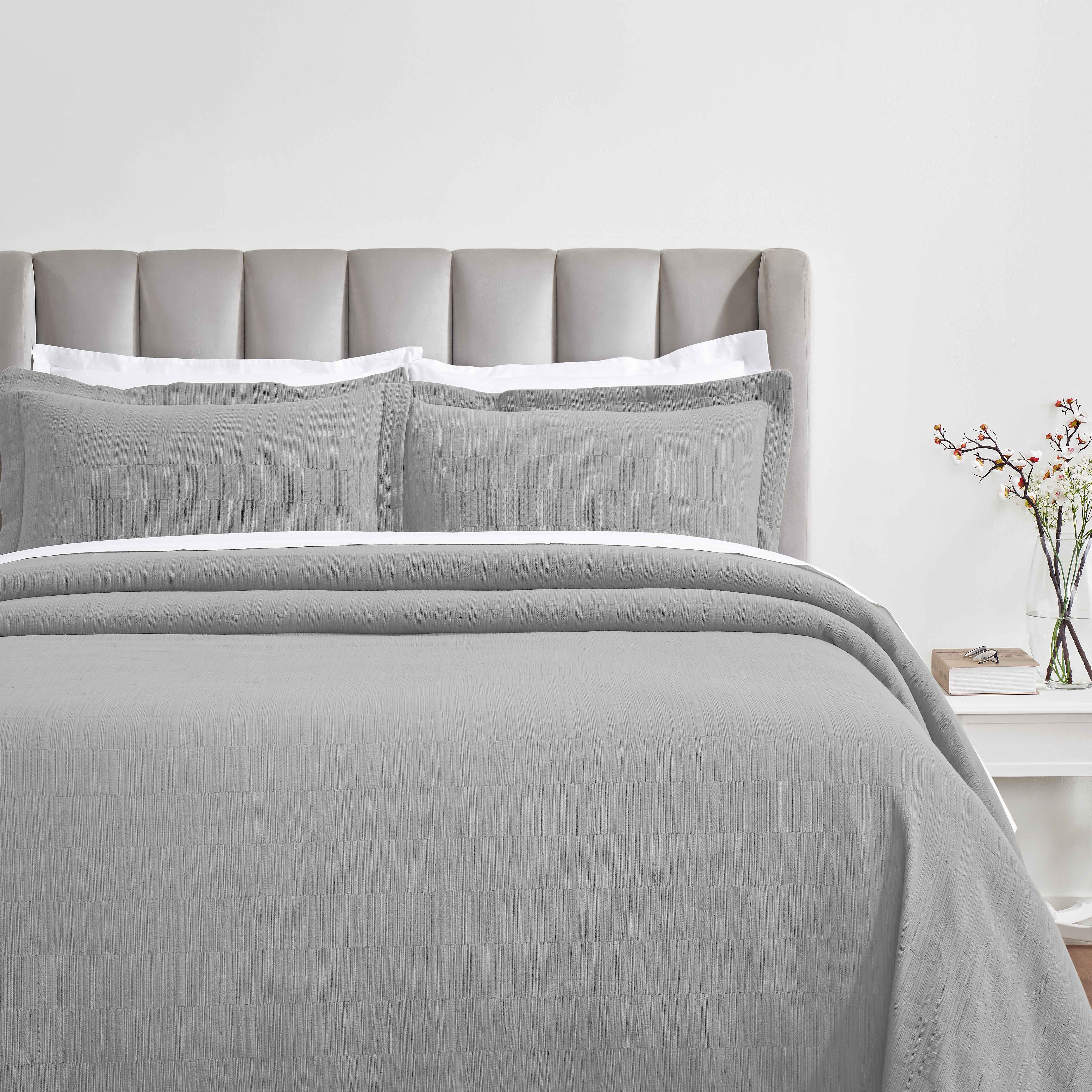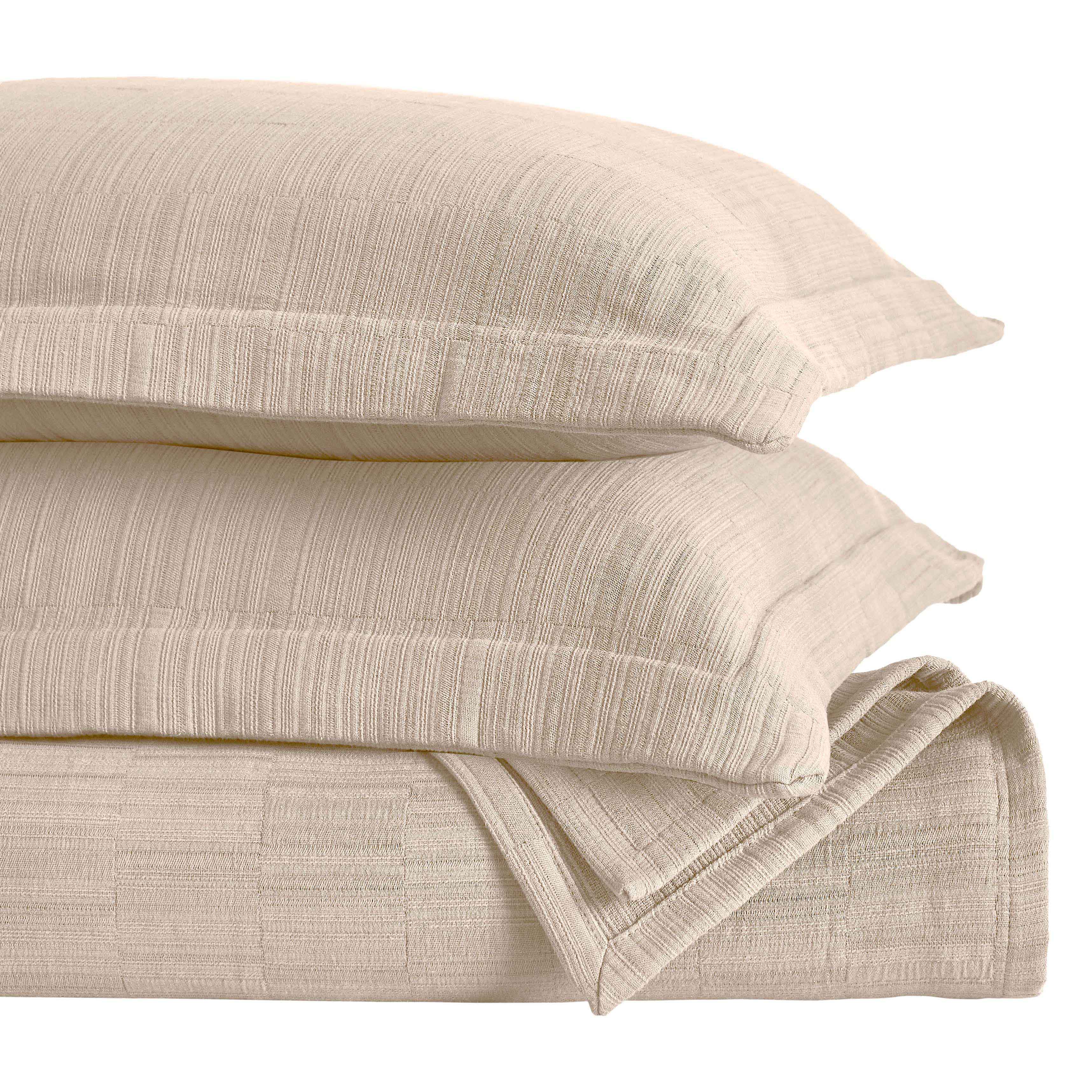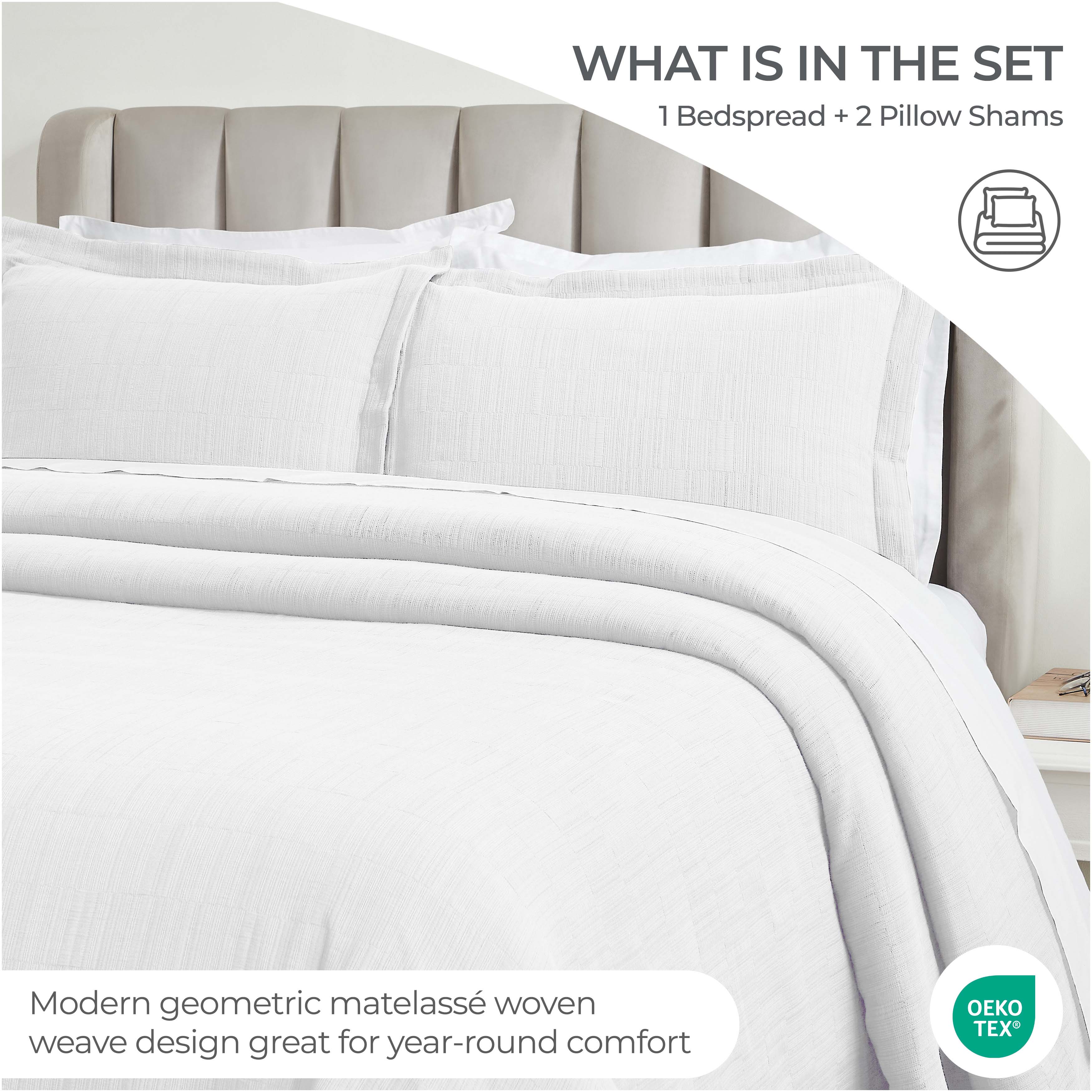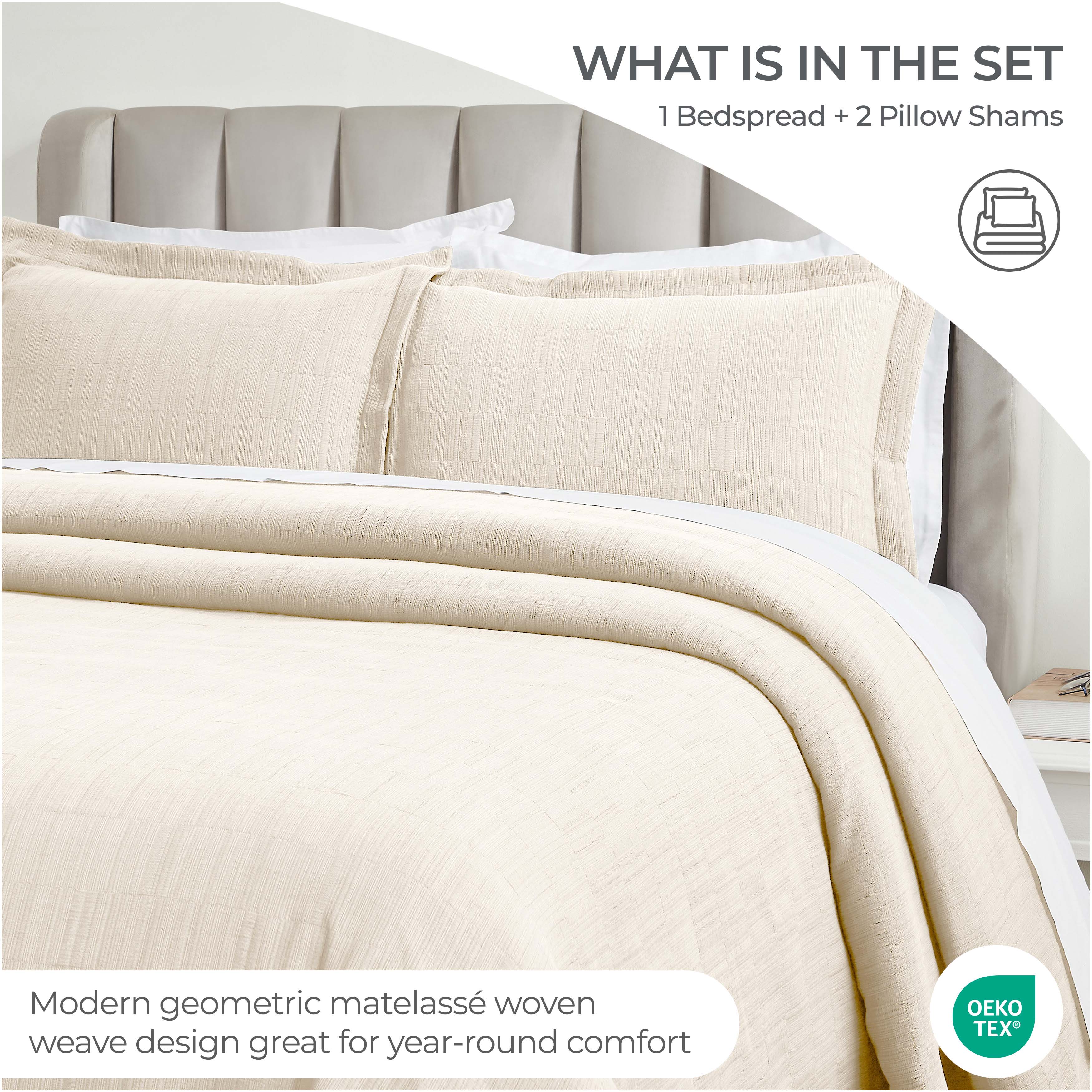 This bedspread set is a perfect addition to any bedroom. It consists of 1 bedspread and 2 pillow shams, crafted from a woven textile with a matelassé weave. The modern geometric design with a neutral color palette offers a clean and contemporary look while providing both comfort and style.