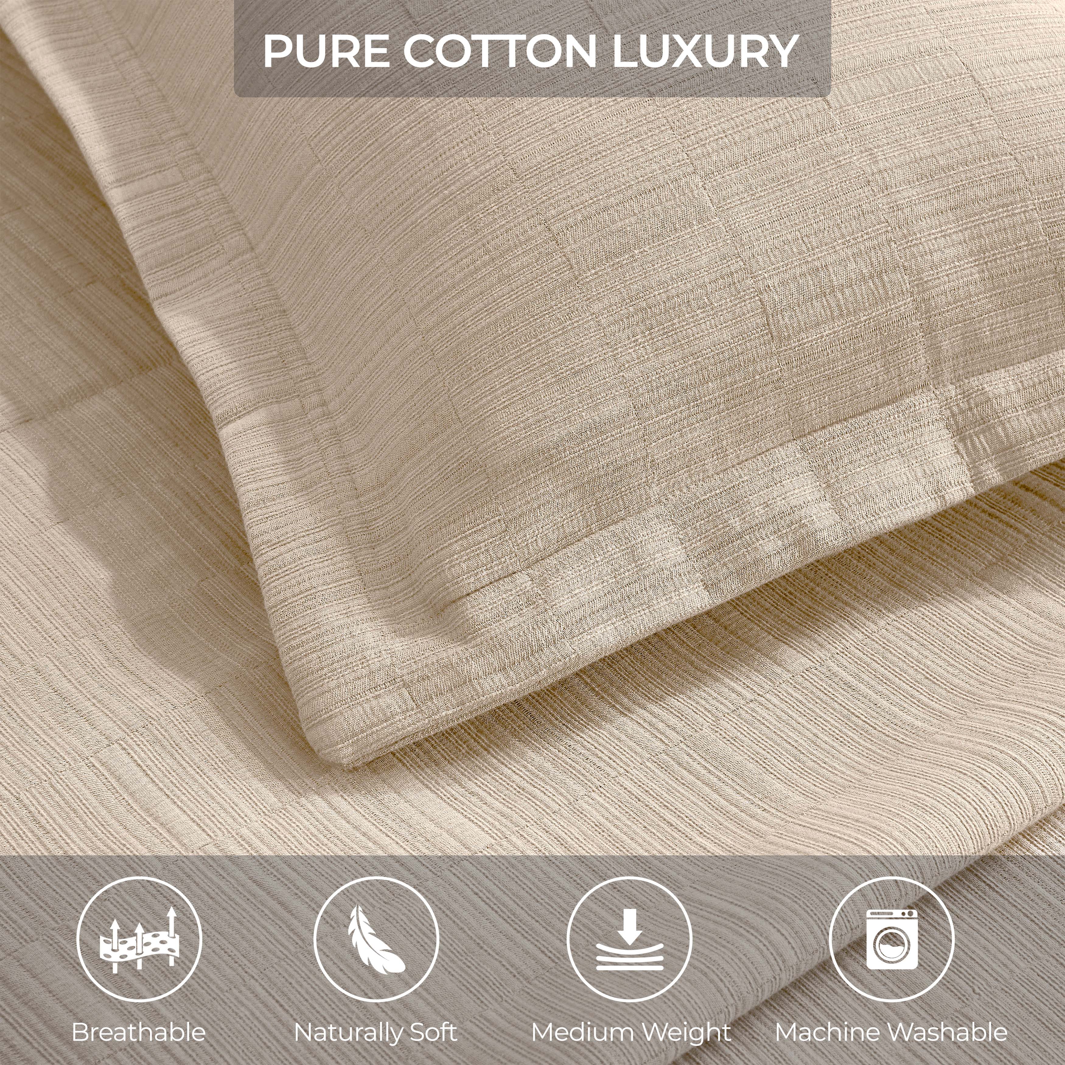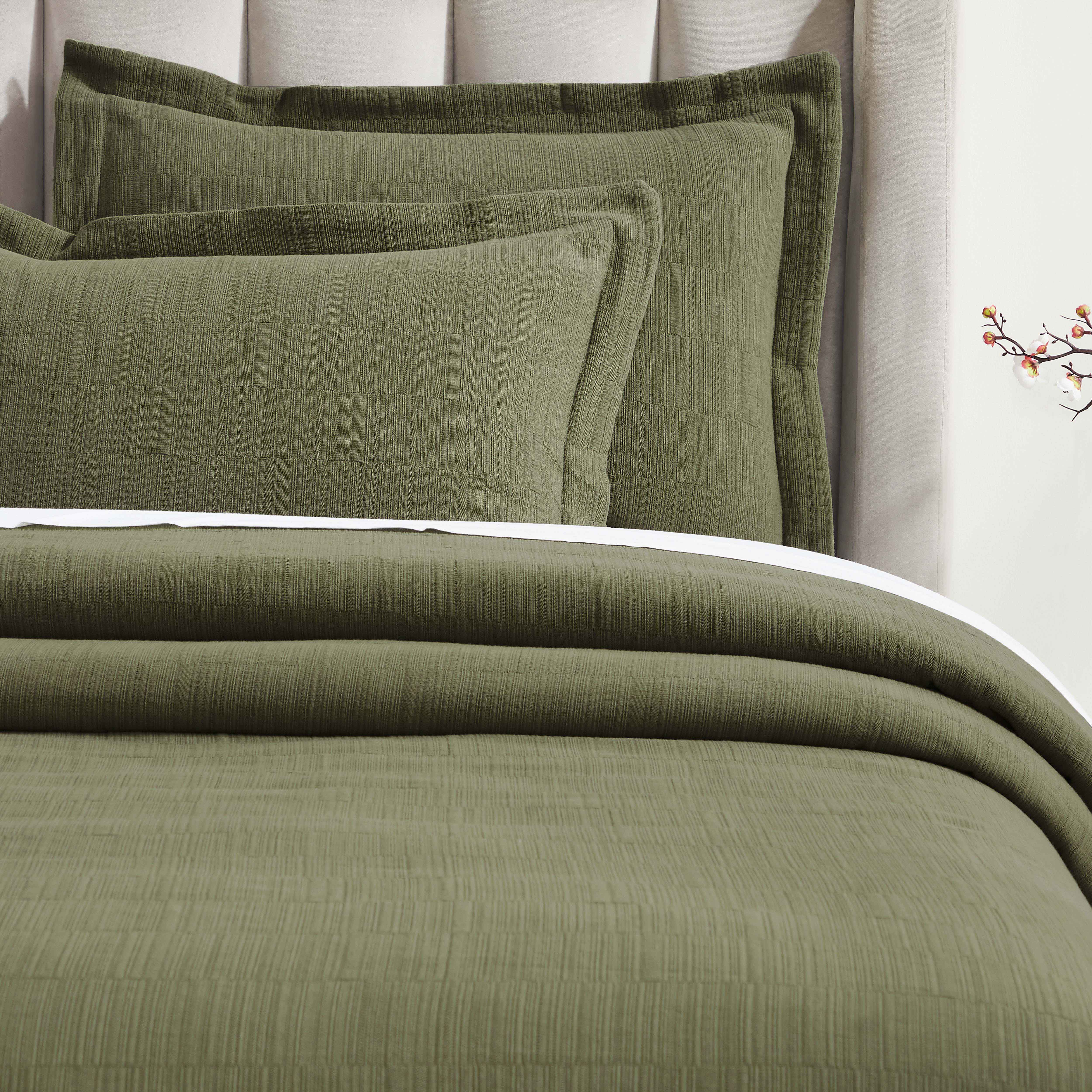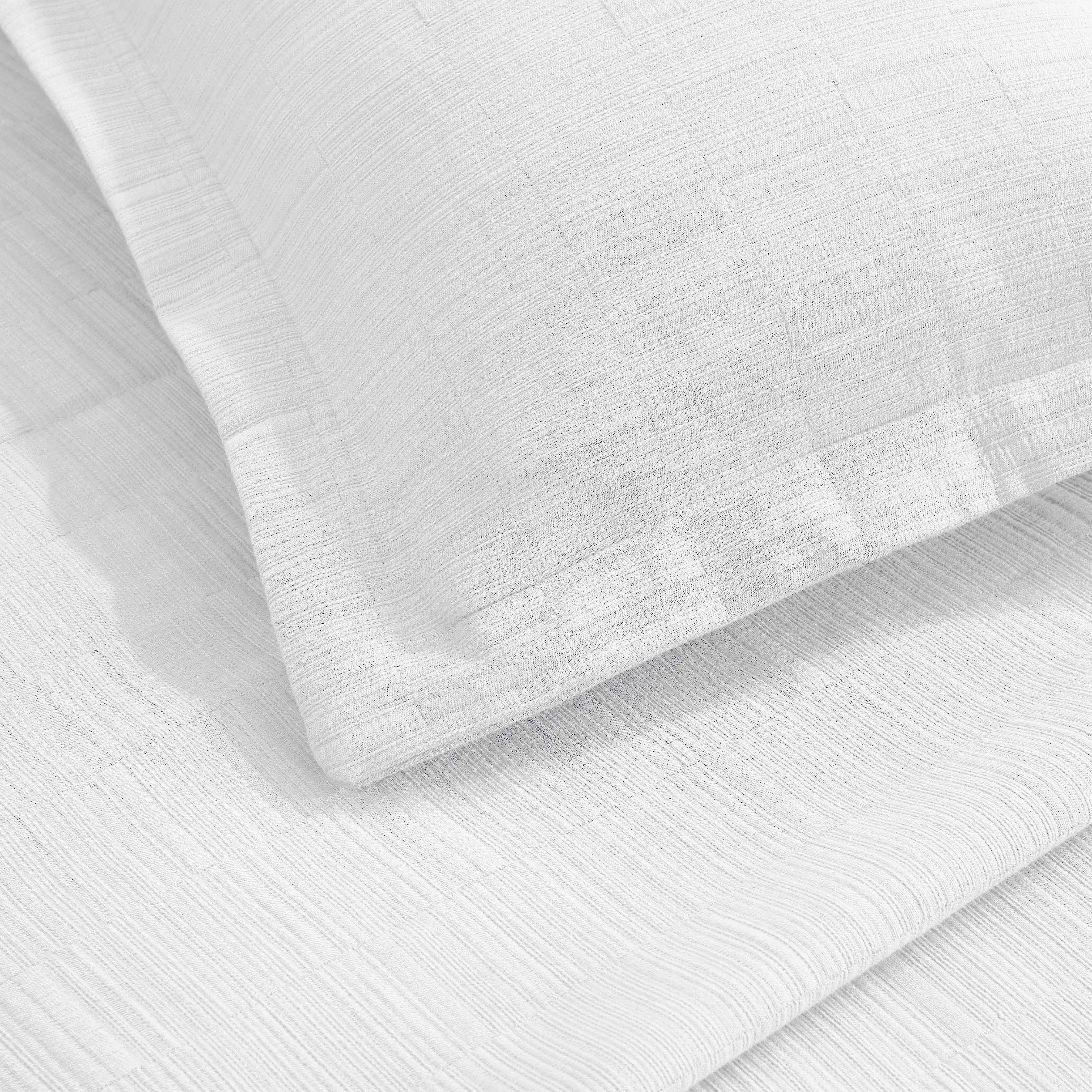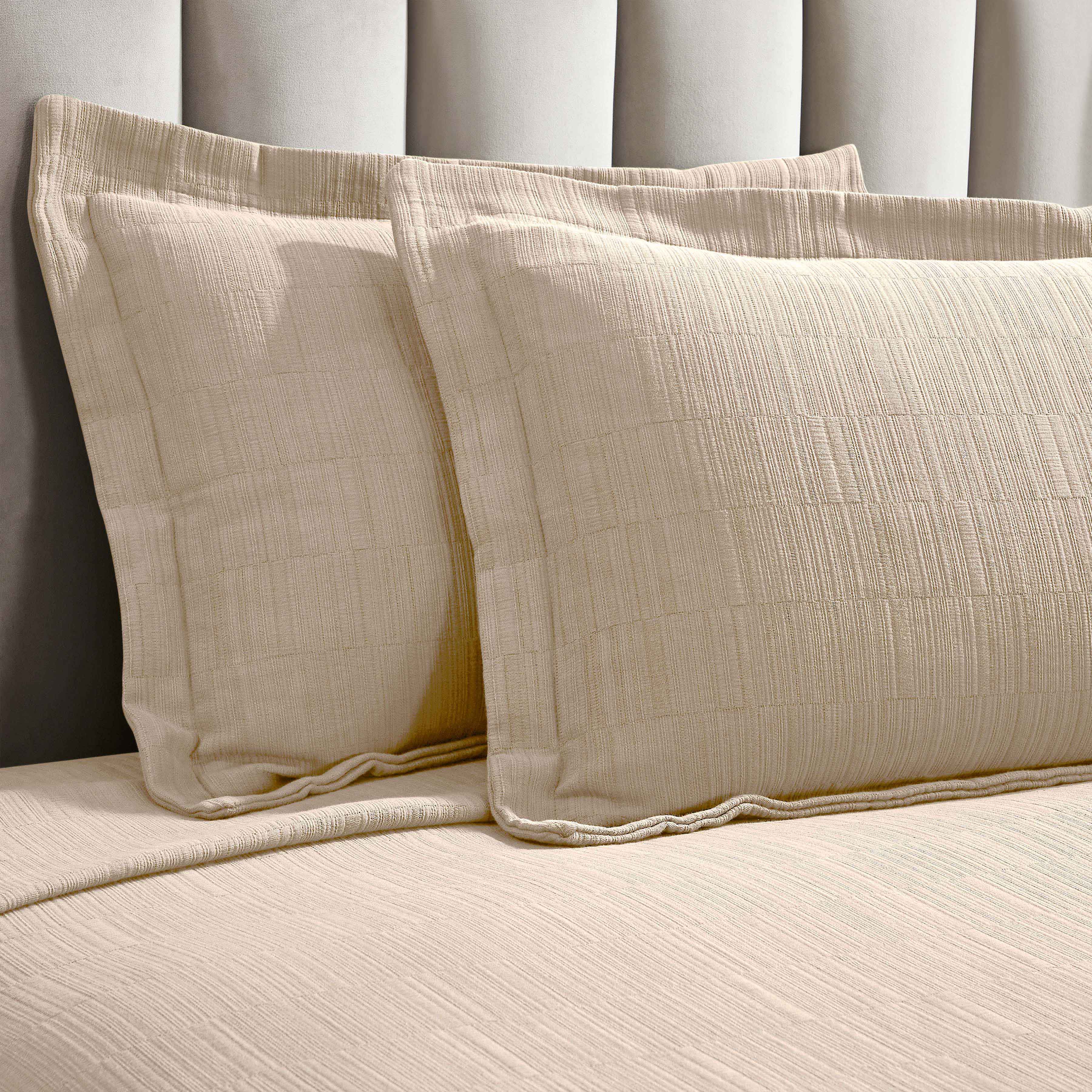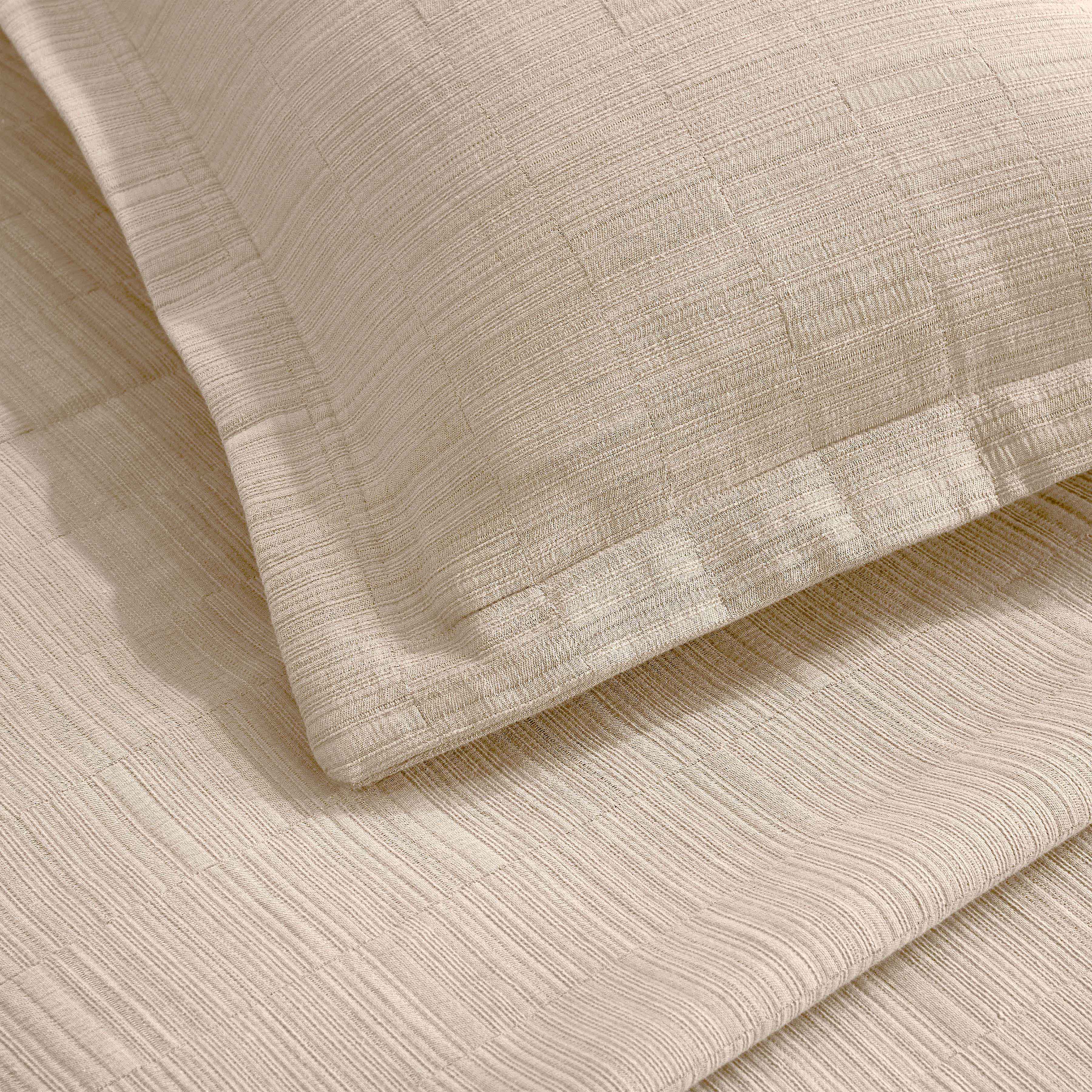 This bedspread set is a perfect addition to any bedroom. It consists of 1 bedspread and 2 pillow shams, crafted from a woven textile with a matelassé weave. The modern geometric design with a neutral color palette offers a clean and contemporary look while providing both comfort and style.